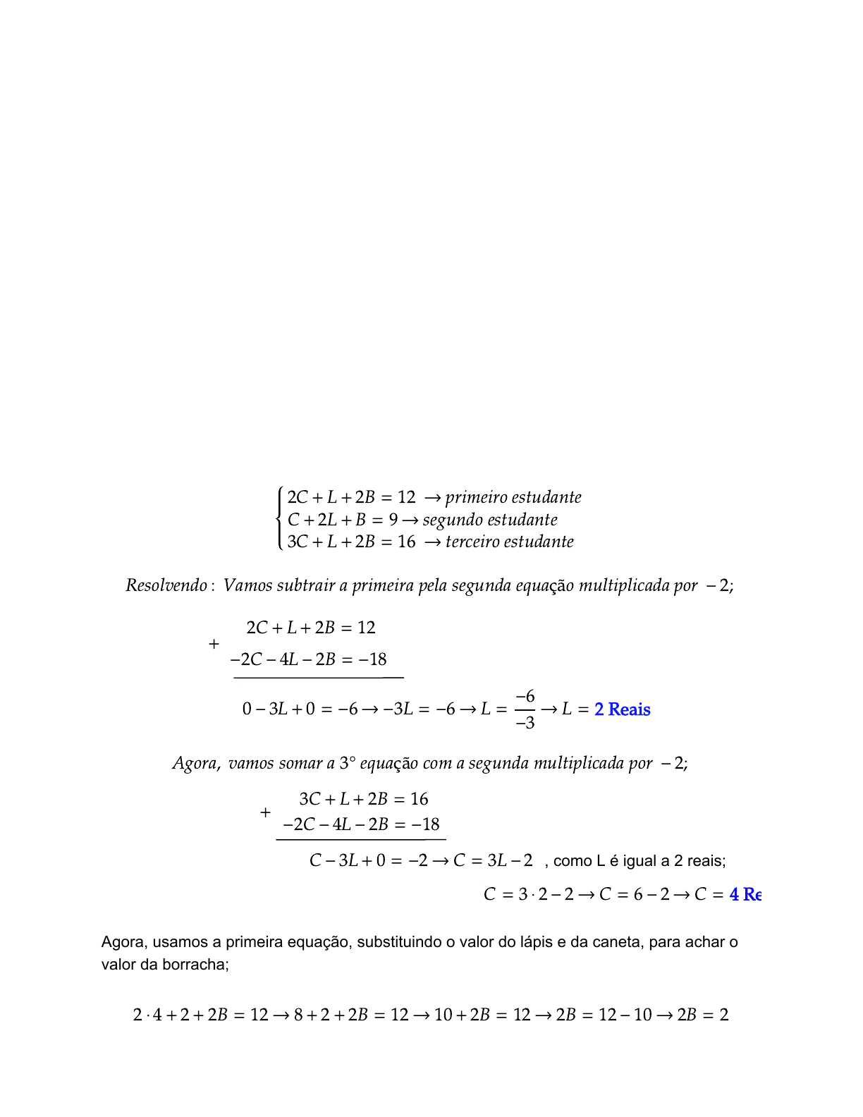 Tiago Lima - Instagram: @professor_disciplinas_exatas • Em uma loja de material escolar as mercadorias, caneta, lapis e borracha são de um único tipo cada, três estudantes compraram esses itens da seguinte forma: o primeiro comprou duas canetas, um lápis e duas borrachas, pagando R$ 12,00. O segundo, adquiriu uma caneta, dois lapis e uma borracha, pagando R$ 9,00. O terceiro comprou três canetas, um lápis e duas borrachas, pagando R$16,00. Os estudantes, após as compras sem verificar os valores de cada mercadoria procuraram resolver o problema: A partir das compras efetuadas, e dos respectivos valores pagos por eles, qual o preço da caneta, do lapis e da borracha? Resolução: Vamos montar um sistema onde L é o preço do lápis, C é o preço da caneta e B é o preço da borracha, da seguinte forma; 2C + L + 2B = 12 primeiro estudante→ C + 2L + B = 9 segundo estudante→ 3C + L + 2B = 16 terceiro estudante→ Resolvendo : Vamos subtrair a primeira pela segunda equação multiplicada por - 2; Agora, vamos somar a 3° equação com a segunda multiplicada por - 2; Agora, usamos a primeira equação, substituindo o valor do lápis e da caneta, para achar o valor da borracha; 2 ⋅ 4 + 2 + 2B = 12 8 + 2 + 2B = 12 10 + 2B = 12 2B = 12 - 10 2B = 2→ → → → 2C + L + 2B = 12 -2C- 4L - 2B = -18 + 0 - 3L + 0 = -6 -3L = -6 L = L = 2 Reais→ → -6 -3 → -2C- 4L - 2B = -18 3C + L + 2B = 16 + C- 3L + 0 = -2 C = 3L - 2→ , como L é igual a 2 reais; C = 3 ⋅ 2 - 2 C = 6 - 2 C = 4 Re→ → B = B = 1 Real→ 2 2 →