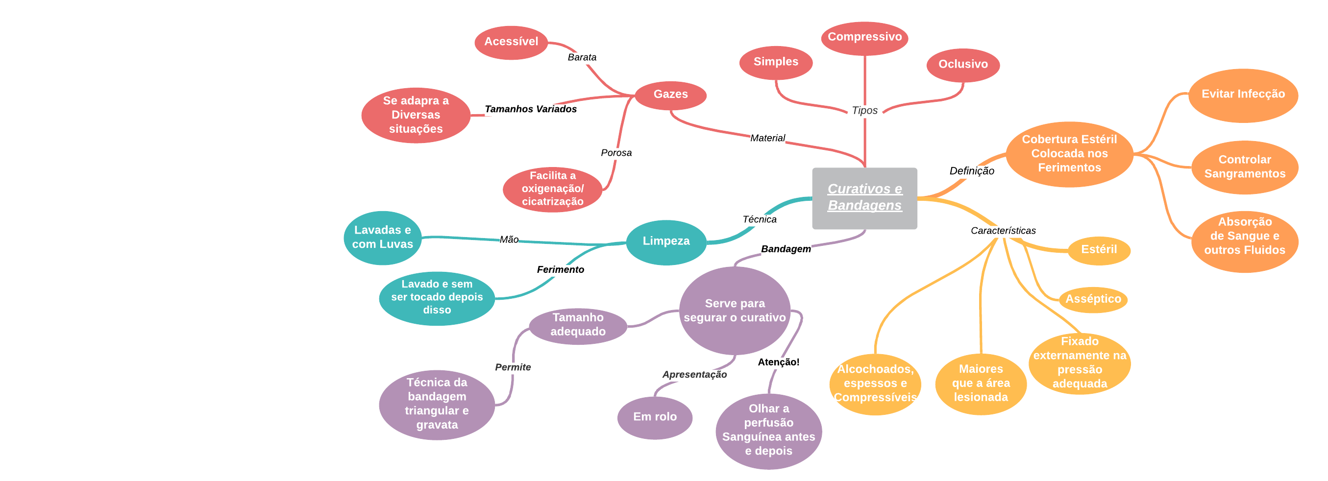 Curativos e Bandagens Definição Características Barata Tamanhos Variados Porosa Técnica Mão GazesSe adapra a Diversas situações Facilita a oxigenação/ cicatrização Acessível Cobertura Estéril Colocada nos Ferimentos Asséptico Estéril Fixado externamente na pressão adequada Evitar Infecção Controlar Sangramentos Lavado e sem ser tocado depois disso Lavadas e com Luvas Limpeza Absorção de Sangue e outros Fluidos Maiores que a área lesionada Alcochoados, espessos e Compressíveis Simples Compressivo Oclusivo Bandagem Serve para segurar o curativoTamanho adequado Em rolo Atenção! Olhar a perfusão Sanguínea antes e depois Técnica da bandagem triangular e gravata Tipos Material Ferimento Apresentação Permite Mapa mental com linhas Mapa mental com linhas