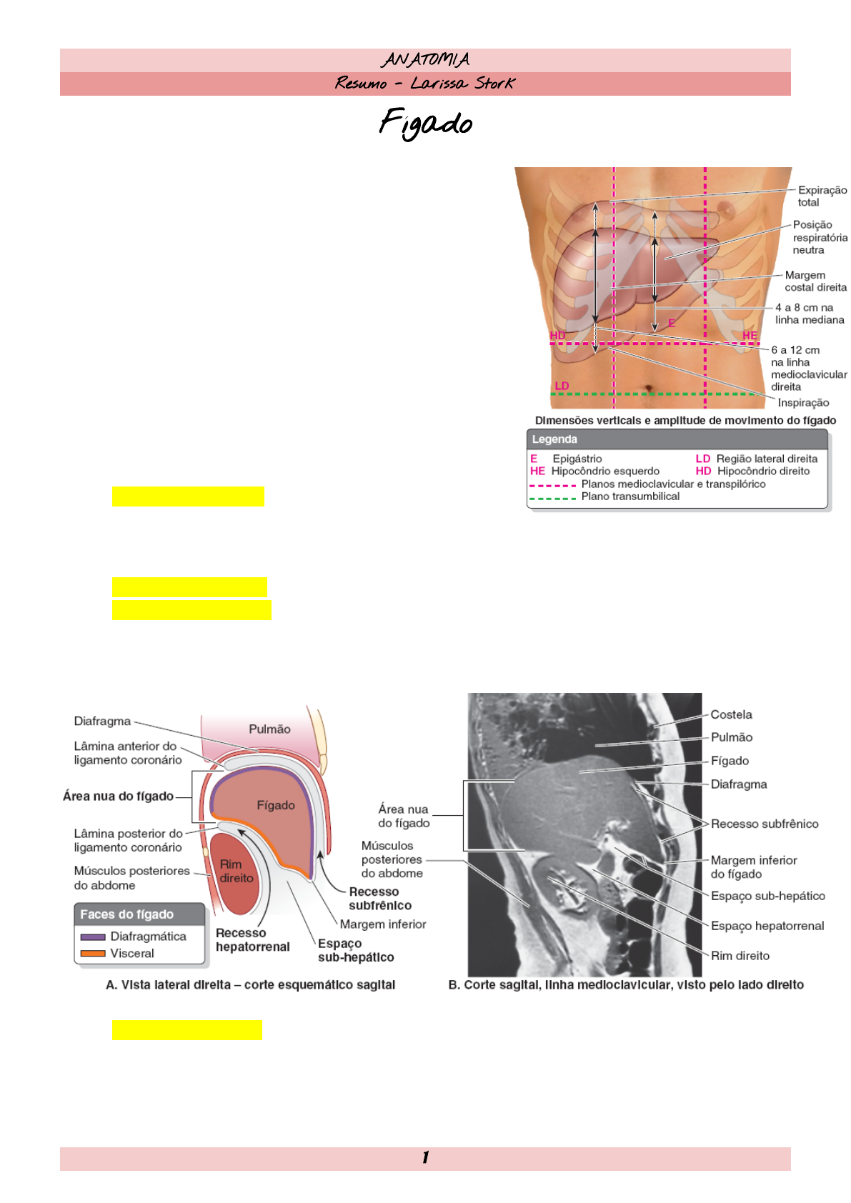 ANATOMIA Resumo - Larissa Stork Fígado ● Maior glândula do corpo e segundo maior órgão. Capacidade de regeneração; ● Além de suas muitas atividades metabólicas, o fígado armazena glicogênio e secreta bile; ● Situado principalmente no quadrante superior direito, protegido pela caixa torácica e diafragma. Ocupa maior parte do hipocôndrio direito, epigástrio superior e se estende até o hipocôndrio esquerdo; ● Desloca-se cerca de 6 a 12 cm na linha medioclavicular e de 4 a 8 cm na linha mediana - durante a respiração → possível palpar a margem inferior do fígado; ● Possui uma face diafragmática (convexa, lisa, forma de cúpula) e uma face visceral (plana/côncava), separadas pela margem inferior; ● Recessos subfrênicos: extensões superiores da cavidade peritoneal, entre o diafragma e as faces anterior e superior da face diafragmática do fígado. São separados em recessos direito e esquerdo pelo ligamento falciforme, que se estende do fígado até a parede anterior do abdome; ● Recesso sub-hepático: inferior ao fígado; ● Recesso hepatorrenal (bolsa de Morison): extensão posterossuperior do recesso sub-hepático, situada entre a parte direita da face visceral do fígado e o rim e a glândula suprarrenal direitos. O líquido que drena da bolsa omental flui para esse recesso. Comunica-se anteriormente com o recesso subfrênico direito; ● Área nua do fígado: parte posterior da face diafragmática que não está coberta por peritônio visceral. É demarcada pela reflexão do peritônio do diafragma para o fígado, como as lâminas anterior (superior) e posterior (inferior) do ligamento coronário. Essas lâminas encontram-se à 1 ANATOMIA Resumo - Larissa Stork direita para formar o ligamento triangular direito e divergem para a esquerda a fim de envolver a área nua triangular. A lâmina anterior do ligamento coronário é contínua à esquerda com a lâmina direita do ligamento falciforme, e a lâmina posterior é contínua com a lâmina direita do omento menor. Próximo ao ápice (a extremidade esquerda) do fígado cuneiforme, as lâminas anterior e posterior da parte esquerda do ligamento coronário se encontram para formar o ligamento triangular esquerdo. A VCI atravessa um profundo sulco da veia cava na área nua do fígado; ● A face visceral do fígado também é coberta por peritônio, exceto na fossa da vesícula biliar e na porta do fígado, uma fissura transversal por onde entram e saem os vasos (veia porta, artéria hepática e vasos linfáticos), o plexo nervoso hepático e os ductos hepáticos que suprem e drenam o fígado. Ao contrário da face diafragmática lisa, a face visceral apresenta muitas fissuras e impressões resultantes do contato com outros órgãos; ● Na face visceral, há a fissura sagital direita: sulco contínuo formado anteriormente pela fossa da vesícula biliar e posteriormente pelo sulco da veia cava. Há também a fissura umbilical (sagital esquerda): sulco contínuo formado anteriormente pela fissura do ligamento redondo (remanescente da veia umbilical do feto) e posteriormente pela fissura do ligamento venoso (remanescente do ducto venoso do feto); ● O omento menor (prega do peritônio que une a curvatura menor do estômago e a parte proximal do duodeno ao fígado) estende-se entre a porta do fígado e o duodeno (ligamento hepatoduodenal - envolve a tríade portal) e entre o sulco do ligamento venoso do fígado e a curvatura menor do estômago (ligamento hepatogástrico). 2 ANATOMIA Resumo - Larissa Stork 3 ANATOMIA Resumo - Larissa Stork DIVISÃO ANATÔMICA DO FÍGADO ● Lobo hepático direito e esquerdo - separados pelo ligamento falciforme e fissura sagital esquerda; ● Lobo quadrado: inferiormente à porta do fígado, no lobo hepático direito, na face visceral; ● Lobo caudado: superiormente à porta do fígado, no lobo hepático direito, na face visceral. DIVISÃO FUNCIONAL DO FÍGADO ● Fissura portal principal (linha de Cantlie) - fundo da vesícula biliar até a VCI - trajeto da veia hepática média → partes direita e esquerda (são funcionalmente independentes - recebem os ramos direito e esquerdo da divisão primária da tríade portal); 4 ANATOMIA Resumo - Larissa Stork ● Fissura portal direita - veia hepática direita → divisão medial direita e lateral direita (recebem os ramos secundários da tríade); ● Fissura portal esquerda - veia hepática esquerda → divisão medial esquerda e divisão lateral esquerda (recebem os ramos secundários da tríade); ● Plano hepático transverso → ramos primários da tríade portal → divide os segmentos transversalmente (recebem os ramos terciários da tríade); ● O segmento I é independente - lobo caudado: possui vascularização e drenagem biliar independente. SEGMENTO I - lobo caudado; SEGMENTO II - segmento posterior lateral esquerdo; SEGMENTO III - segmento anterior lateral esquerdo; SEGMENTO IV - segmento medial esquerdo; SEGMENTO V - segmento anterior medial direito; SEGMENTO VI - segmento anterior lateral direito; SEGMENTO VII - segmento posterior lateral direito; SEGMENTO VIII - segmento posterior medial direito. VASOS SANGUÍNEOS DO FÍGADO ● Irrigação dupla: ○ Veia porta: 80% do sangue, possui 40% a mais de O2 se comparado ao sangue venoso da circulação sistêmica, sustenta o parênquima hepático (hepatócitos), conduz para os sinusóides hepáticos praticamente todos os nutrientes absorvidos pelo sistema digestório (intestino), exceto os lipídios, os quais são absorvidos pelo sistema linfático. É formada pela união das veias mesentérica superior e esplênica. ○ Artéria hepática: 20% do sangue, distribuída inicialmente para estruturas não parenquimatosas, sobretudo os ductos biliares intra-hepáticos. É um ramo do tronco celíaco e é dividida em artéria hepática comum e artéria hepática própria. ● Drenagem: ○ Veias hepáticas direita, intermédia e esquerda: intersegmentares em sua distribu