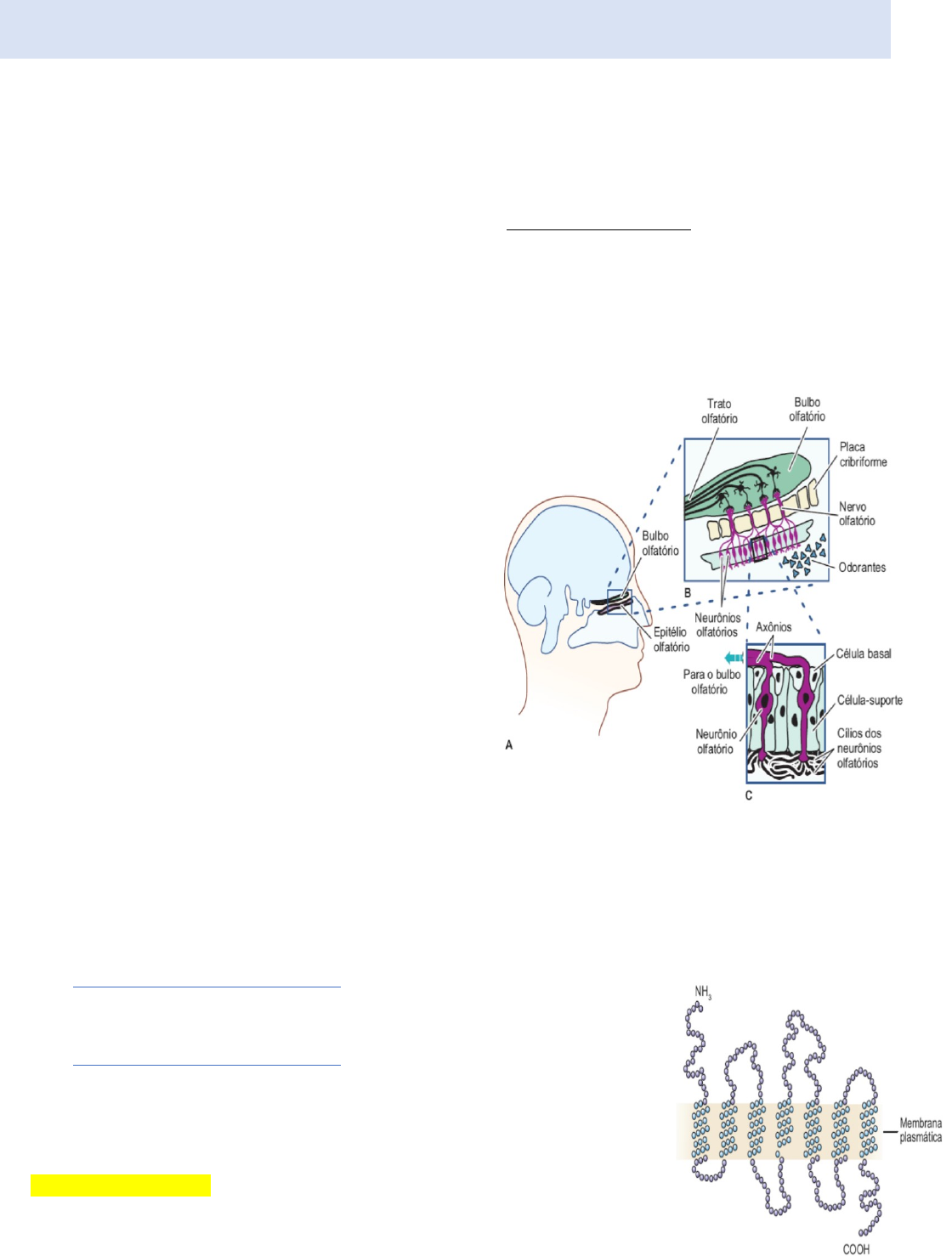 Olfação e Gustação Cap. 15, Curi e Procopio Sentidos químicos · Olfação e gustação têm a função de detectar substâncias químicas do meio ambiente sentidos químicos · São sentidos intimamente ligados entre si e com as mais básicas necessidades internas, como sede, fome, emoção e sexo. Olfação Características ecológicas e importância funcional da olfação · O sentido do olfato detecta compostos químicos presentes no ambiente · Resultado: regula uma série de funções, como respostas emocionais, fisiológicas, reprodutivas e comprotamentos sociais · Nariz funciona como um dispositivo sensorial que permite determinar a composição química de um objeto-alvo, protegendo-nos de eventuais perigos · Ex: alimento estragado, incêndio · Os aromas que contribuem para o sabor dos alimentos são reconhecidos principalmente por esse sentido moléculas voláteis liberadas dos alimentos na boca entram na parte posterior da cavidade nasal (que tem comunicação com a cavidade bucal) e ativam neurônios olfatórios. Assim, sem o olfato, seria muito mais difícil discrinimarmos o sabor de um café ou de uma laranja Recepção, trandução e codificação dos odorantes Anatomia do sistema olfatório · Os neurônios responsáveis pela detecção dos odorantes situam-se no epitélio olfatório, que está localizado no alto da cavidade nasal · Os axônios dos neurônios olfatórios atravessam a placa cribiforme do osso etmoide e formam sinapses com as células mitrais do bulbo olfatóroio, em regiões denominadas de glomérulos. Os axônios das células mitrais, que formam o trato olfatório, fazem, por sua vez, sinapse com neurônios de outras regiões do cérebro · Epitélio olfatório: a) Neurônios olfatórios: apresentam uma vida curta (cerca de 30 a 60 dias), ão continuamente repostos a partir das células da camada basal - são células nervosas bipolares, estende um único dendrito para a superfície do epitalio - do dendrito partem cílios que estão em contato direto com o muco que recobre o epitélio - a partir do polo basal do neurônio olfatório, um único axônio projeta-se em direção ao bulbo olfatório b) Células-suporte c) Células basais: um tipo de células-tronco capazes de se desenvolver em neurônios olfatórios ou em outros tipos celulares presentes no epitélio olfatório Órgão vomeronasal e detecção de feromônios · Muitos mamíferos apresentam um órgão olfatório acessório órgão vomeronasal · Esse órgão apresenta-se na forma de um tubo bilateral simétrico que se localiza na região anterior e ventral da cavidade nasal · Acredita-se que os neurônios vomeronasais são responsáveis pela detecçào dos feromônios · Feromônios: moléculas sem odor liberadas por um indivíduo, que podem desencadear reações fisiológicas ou comportamentais em outros indivíduos de uma mesma espécie, como agressividade, medo ou atração sexual · Os axônios formam sinapses com células mitrais de uma pequena região localizada na região dorsal do bulbo olfatório (chamada de bulbo olfatório acessório) · Essas células mitrais levam a informação recebida para regiões cerebrais envolvidas na regulação de comportamentos · Não está presente em humanos orgão similar seria o órgão de Jacobson já encontrado em fetos humanos. Em adultos, 70% não apresentavam esse órgão e nos que apresentavam não foi possível detectar a presença de neurônios vomeronasais funcionais. Portanto, nõa há evidências de que exista órgào de Jacobson funcional em humanos, mas há evidências de feromônios humanos (ex: sicronização do ciclo menstrual de mulheres que moram juntas, devido a substâncias presentes no suor). É possível que esses efeitos sejam meidados pelo sistema olfatório principal Receptores olfatórios e transdução de sinal · ODORANTES: são moléculas orgânicas pequenas e voláteis que entram na cavidade nasal, onde são detectadas pelos neurônios olfatórios, que são ativados e enviam sinais para o bulbo olfatório. São reconhecidos por receptores olfatórios, presentes nos cílios dos neurônios olfatórios, que pertencem à superfamília de receptores acoplados à proteína G, isto é, apresentam 7 domínios transmembranares. · Mecanismo básico de transdução de sinal: a) A ligação do odorante ao receptor olfatório faz com que este ative a proteína golf (tipo de proteína G encontrada exclusivamente em neurônios olfatórios) b) A subunidade a da proteína G dissocia-se do complexo e ativa a adenilil ciclase, que produz monofosfato de adenosina cíclico (AMPc) c) O AMPc liga-se ao canal olfatório CNGA2, que é regulado por nucleotídeos cíclicos, causando um influxo de íons Na+ e Ca2+ d) Além disso, canais de Cl- dependentes de Ca2+ são ativados, causando um fluxo de Cl- para fora da célula e) A abertura desses canais despolariza a membrana, gerando um potencial de ação Receptores para feromônios · Enquanto, nos roedores, aproximadamente 250 receptores de feromônio foram identificados, no homem, a grande maioria dos genes que codificam para receptores de feromônios são pseudogenes, isto é, não são funcionais. Juntamente com as evidências anatômicas descritas anteriormente, esses achados indicam que o órgão vomeronasal não deve ser funcional em humanos. · No entanto, mais recentemente, foi identificada uma pequena família de GPCRs, denominada trace amine-associated receptors (TAARs), que é expressa no epitélio olfatório principal, tanto em roedores como no homem em camundongos, é capaz de detectar aminas voláteis provenientes de outros orhanismos, sugerindo ter a mesma função no homem Organização molecular do sistema olfatório · Cada neurônio olfatório é capaz de expressar apenas um dos vários genes que codificam para receptores olfatórios · Cada receptores olfatório é expresso em apenas uma dentre quatro zonas de expressão no epitélio olfatório. As 4 zonas do epité