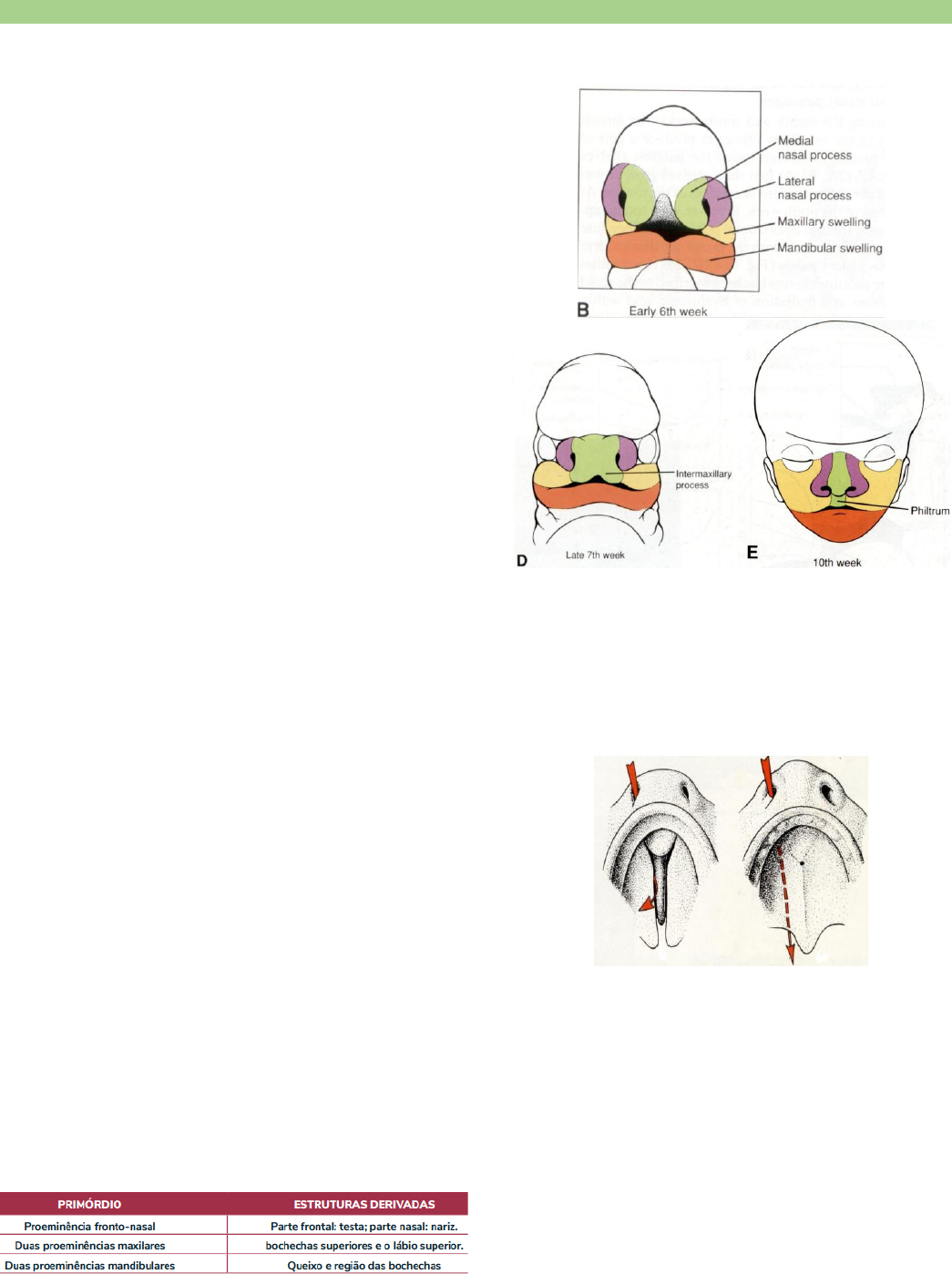 Luísa Ribeiro- MED 105 Embriologia da face Desenvolvimento • Tubo neural se fechando- neuroporo posterior e anterior • Porção central se fecha primeiro- desenvolvimento dos somitos da porção cranial para caudal • 25 dias- neuroporo anterior aberto, processo frontal, 1º e 2º arcos faríngeos, saliência pericárdica, borda cortada do âmnio • 28 dias- placódio do cristalino, placódio ótico (audição), arcos faríngeos (mandibular, hioideo, braquial), saliência do coração • Arco mandibular- processo maxilar e processo mandibular • Face em contato com a área cardiogênica • Boca primitiva ou estomodeo- entre os processos mandibulares e maxilares • Placódio visual- vesícula visual- olho • 4 e 5ª sem- aparece processo nasal medial e lateral direito e esquerdo • 5 e 6ª sem- processo mandibular esquerdo e direito se fundem- mandíbula o Sulco nasolacrimal direito e esquerdo • 6 e 7ª sem- vesícula visual mais para frente o Processos maxilares se fundem a processo nasal medial- formação das cavidades nasais o Processo palatino direito e esquerdo e anterior • Processos nasais mediais- parte central do nariz e filtro do lábio • Processos nasais laterais- asas do nariz • Processo maxilar- maxilar • Processos mandibulares- mandíbula • Fosseta nasal aumenta- chega a cavidade oral- boca • Palato anterior evolui • Septo nasal desce- processos palatinos direito, esquerdo e anterior se fundem- palato duro, mole e úvula • Sulco lacrimal se fecha- conduto lacrimal • Forame incisivo- processo palatino anterior • Processo palatino do maxilar- processo palatino direito e esquerdo • Ser humano tem órgão de Jacobson até o 4º mês da vida embrionária- perde depois o Se não perde- tumor de jacobson Luísa Ribeiro- MED 105 OBS: Estomodeu- 5 primórdios faciais- proeminências- estruturas derivadas • Uma proeminência frontonasal= parte frontal: testa, parte nasal: nariz • Um par de proeminências maxilares= bochechas superiores e lábio superior • Um par de proeminências mandibulares= queixo e região das bochechas Patologias Anencéfalo • Neuroporo anterior não se fecha Tumor de Jacobson • Permanência do órgão de Jacobson até depois do 4º mês de vida embrionária • Tumor agressivo de face Lábio leporino (fenda labial) e fenda palatina • Defeitos na fenda anterior o Incluem fenda labial com ou sem uma fenda da parte alveolar da maxila o Em um defeito na fenda anterior completa, a fenda estende-se através do lábio superior e parte alveolar da maxila para a fossa incisiva, separando as partes anterior e posterior do palato o Defeitos na fenda anterior resultam de uma deficiência do mesênquima nas proeminências maxilares e do processo palatino mediano • Defeitos na fenda posterior o Incluem fendas do palato secundário que se estendem através das regiões dos palatos mole e duro até a fossa incisiva, separando as partes anterior e posterior do palato o Os defeitos das fendas posteriores resultam de um desenvolvimento defeituoso do palato secundário e distorções de crescimento dos processos palatinos laterais que impedem sua fusão o Outros fatores, como a largura do estomodeu, a mobilidade dos processos palatinos laterais (prateleira palatina) e os locais de degeneração focal alterada do epitélio palatino, podem contribuir para esses defeitos de nascimento • Unilateral- nasal medial de um lado não se junta ao maxilar de outro o Resulta de uma falha da proeminência maxilar no lado afetado em unir-se com as proeminências nasais mediais • Com fenda palatina- nasal medial de um lado não se junta ao maxilar de outro e fenda entre o processo anterior e esquerdo • Bilateral o Resulta de uma falha das massas mesenquimais de ambas as proeminências Luísa Ribeiro- MED 105 maxilares em se encontrar e fundir com as proeminências nasais mediais • Bilateral com fenda palatina- processo direito e esquerdo se fecham mas não juntam com anterior • Fenda palatina- processo maxilar direito e esquerdo não se fecham- úvula bífida • Unilateral com fenda palatina e úvula bífida • Cirurgia até o 5º mês de vida pré-natal Sulco nasolacrimal Fenda nasolacrimal • Com lábio leporino bilateral Fendas faciais • Fendas faciais oblíquas- frequentemente bilaterais e se estendem do lábio superior até a margem medial da órbita (cavidade óssea contendo o bulbo do olho) o Quando isso ocorre, os ductos lacrimonasais são sulcos abertos (sulcos lacrimonasais persistentes) Processos nasais mediais não se fundiram • Com fenda labial mediana Retrognatia • Processos mandibulares direito e esquerdos não cresceram Prognata • Processos mandibulares direito e esquerdos cresceram demais Agenesia de mandíbula Luísa Ribeiro- MED 105 Anquiloglossia/ língua presa • O frênulo lingual normalmente conecta a superfície inferior da língua ao assoalho da boca • Algumas vezes, o frênulo é curto e estende-se até a ponta da língua= anquiloglossia Macroglossia • Língua vem do 1º arco- língua aumentada • É causada pela hipertrofia generalizada da língua em desenvolvimento, geralmente resultante de linfangioma (tumor linfoide) ou hipertrofia muscular Microglossia • Uma língua anormalmente pequena é rara • Está, habitualmente, associada à micrognatia (subdesenvolvimento da mandíbula e retrognatismo) e defeitos dos membros (síndrome de Hanhart) Língua bífida (glossósquise) • Fusão incompleta das tumefações linguais laterais resulta em um profundo sulco na linha média da língua • Esse sulco geralmente não se estende até a ponta da língua • Às vezes ocorre divisão na extremidade, com consequente língua bífida Síndrome do 1º arco faríngeo • Migração insuficiente de células da crista neural para o primeiro arco durante a 4a semana • Tem retrognatia também • Dano no processo maxilar e mandibular • Aurícula deformada da orelha externa, o apêndice pré-auricular,
