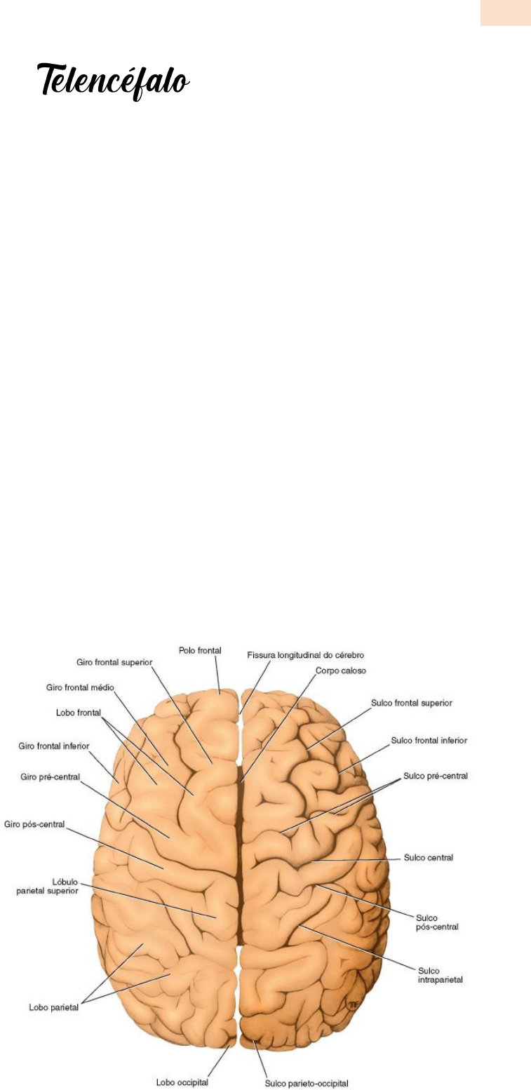 1 Anatomia I – LM ❖ Hemisférios cerebrais incompletamente separados pela fissura longitudinal do cérebro ❖ Assoalho é formado por uma larga faixa de fibras comissurais, o corpo caloso – principal meio de união entre os hemisférios ❖ É composto por 2 hemisférios direito e esquerdo Cada hemisfério possui 3 faces: • Superolateral • Face medial • Face inferior ou base do cérebro Ventrículos laterais: os hemisférios possuem cavidade, os ventrículos laterais direito e esquerdo, que se comunicam com o terceiro ventrículo pelos forames laterais SULCOS E GIROS: Durante o desenvolvimento embrionário, quando o tamanho do encéfalo aumenta rapidamente, a substância cinzenta do córtex aumenta com maior rapidez que a substância branca subjacente Como resultado, a região cortical se enrola e se dobra sobre si mesma Portanto, a superfície do cérebro do homem e de vários animais apresenta depressões denominadas sulcos, que delimitam os giros ou circunvoluções cerebrais Sulcos: permite aumento significativo sem grande aumento do volume cerebral → cerca de 2/3 do córtex cerebral está escondido pelos sulcos Os padrões dos sulcos variam em cada cérebro Os dois sulcos mais importantes são: 1. Sulco lateral (sulco de Sylvius): fenda profunda que separa o lobo frontal do lobo temporal; inicia-se na base do cérebro lateralmente a substância perfurada anterior; dirige para a face superolateral do cérebro, onde termina dividindo-se em três ramos: ascendente, anterior e posterior 2. Sulco central (sulco de Rolando): sulco profundo que separa o lobo frontal do lobo parietal; ladeado por dois giros paralelos → giro pré- 2 Anatomia I – LM central e pós-central; de modo geral áreas anteriores ao sulco são motoras e áreas posteriores são sensitivas Via de regra: • Giros anteriores ao sulco central → fibras motoras → giros motores →homúnculo motor (Área motora somática primaria) • Giros posteriores ao sulco central → fibras sensitivas → giros sensitivos → homúnculo sensitivo ❖ Os sulcos ajudam a delimitar os lobos cerebrais 3 Anatomia I – LM Os lobos recebem sua denominação de acordo com os ossos relacionados: ✓ Lobo frontal – predominantemente motor – hemisfério dominante da fala ✓ Lobo temporal – área da audição ✓ Lobo parietal – sensitivo ✓ Lobo occipital – área da visão ✓ Ínsula (profundamente ao sulco lateral) 4 Anatomia I – LM LOBO FRONTAL Na superfície identifica-se três sulcos principais: − Pré-frontal − Frontal superior − Frontal inferior Esses sulcos delimitam os giros: − Frontal superior − Frontal médio − Frontal inferior (giro da boca) – área da fala (motora) − Pré-central – área motora LOBO TEMPORAL 5 Anatomia I – LM Na superfície superolateral identifica-se dois sulcos: − Temporal superior − Temporal inferior Esses sulcos delimitam os giros: − Temporal superior – audição e Wernicke − Temporal médio − Temporal inferior Área de Wernicke: danos causados na área de Wernicke podem fazer com que uma pessoa que escute perfeitamente e reconheça bem as palavras, seja incapaz de agrupá-las para formar um pensamento coerente, caracterizando a doença conhecida como Afasia de Wernicke LOBO PARIETAL Apresenta dois sulcos principais: − Pós-central − Intraparietal Esses sulcos delimitam os giros: − Parietal superior − Parietal inferior − Supramarginal − Angular LOBO OCCIPITAL Sulcos: − Parieto-occipital − Calcarino ❖ Limite em uma linha imaginária que liga o sulco parieto-occipital e a incisura pré-occipital ❖ Parece estar totalmente relacionado com a visão 6 Anatomia I – LM ÍNSULA ❖ Situa-se em uma fossa que visualizada ao afasta-se os lábio do sulco lateral FACE MEDIAL DOS HEMISFÉRISO Corpo caloso: maior comissura inter-hemisféricas, é uma estrutura de grande número de fibras mielínicas que cruzam o plano sagital mediano e penetram de cada lado no centro branco medular cerebral; ele une as áreas simétricas do córtex dos dois hemisférios cerebrais; esplênio/tronco/joelho/rostro/comissura anterior Fórmix: emerge abaixo do esplênio do corpo caloso e arqueia-se em direção a comissura anterior; feixe de fibras constituído por duas metade unidas entre si em um trajeto abaixo do corpo caloso; dividido em: corpo, coluna e pilares do fórmix Septo pelúcido: entre o corpo caloso e o fórmix; constituído por delgadas lâminas de tecido nervoso; separa os dois ventrículos laterais Lobo occipital: − Sulco calcarino 7 Anatomia I – LM − Sulco parieto-occipital − Giro cúneus − Giro occipito-temporal medial Lobo frontal: − Sulco do corpo caloso − Sulco cíngulo − Giro do cíngulo Lobo parietal: − Sulco do corpo caloso − Sulco do cíngulo − Giro do cíngulo FACE INFERIOR DOS HEMISFÉRIOS ❖ Pode ser dividida em duas grandes áreas: 1. Lobo frontal: • Um único sulco importante, se relacionando medialmente ao giro reto • Encontram-se também nesta região outras estruturas relacionadas com a olfação: bulbo olfatório, tracto olfatório, estrias olfatórias lateral e medial, trígono olfatório, substância perfurada anterior 2. Lobo temporal: • Apresenta três sulcos principais • Sulco do hipocampo: inicia-se na região do esplênio do corpo caloso, onde se continua com o sulco do corpo caloso; o giro parahipocampal se liga ao giro do cínculo através do istmo de um giro estreito, o istmo do giro Cíngulo • Sulco colateral: inicia-se próximo ao polo occipital e se dirige para frente; o Sulco colateral + calcarino = limita o giro occipito-temporal o Sulco colateral + hipocampo = limita o giro parahipocampal (o qual se curva em trono do sulco do hipocampo para formar o uncus) • Sulco occipito-temporal: limita o sulco temporal inferior o giro temporal inferior 8 Anatomia I – LM LOBO LÍMBICO ❖ Uncus + giro parahipocampal + ístimo do grio do Cíngulo + giro do cíngulo • É uma formação 