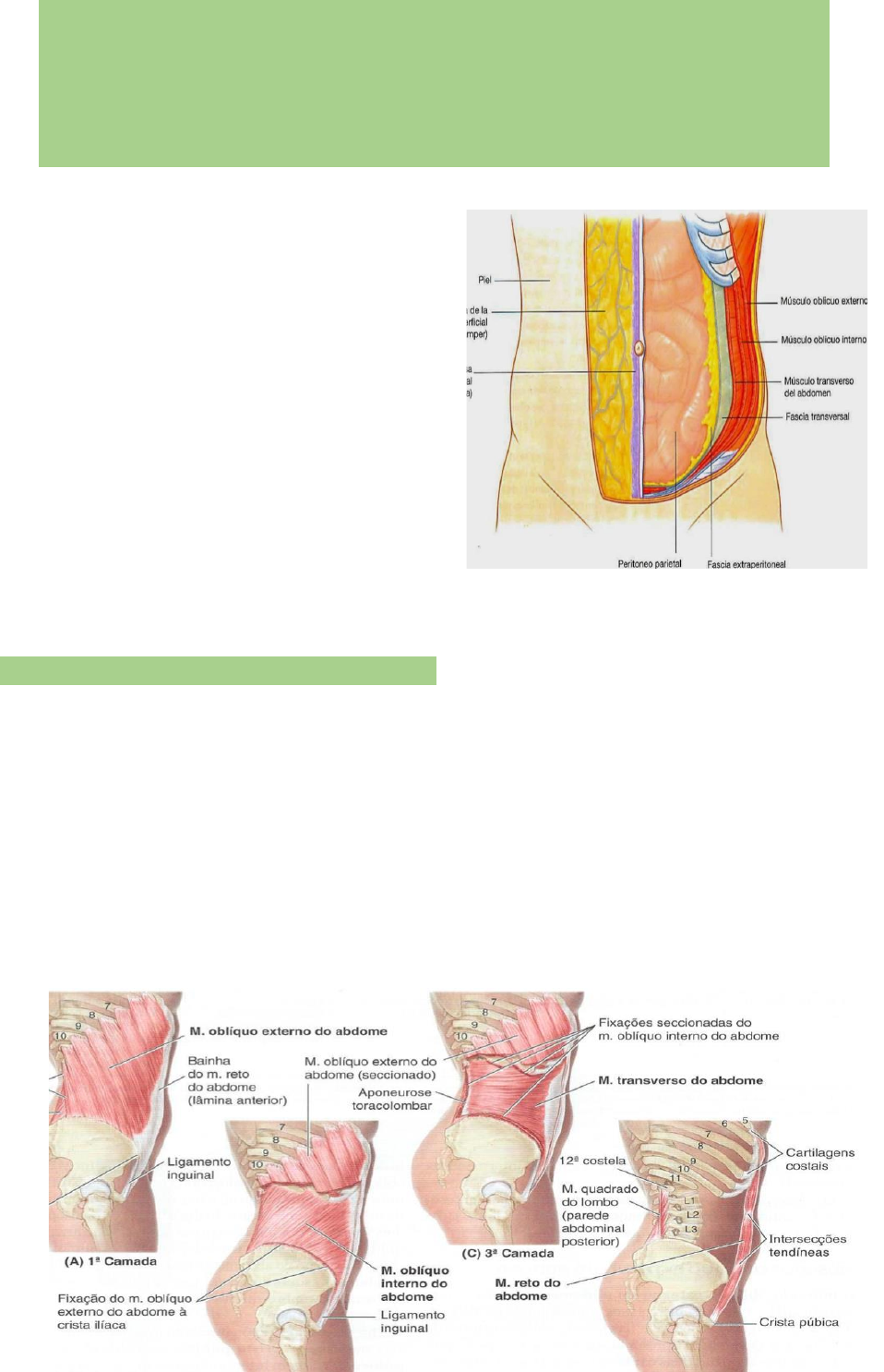 Anatomía Humana Generalidades do Abdomen ▪ Formado por ossos, músculos , faxes e aponeuroses, per i tôn io, vasos, nervos e vísceras . ▪ Possu i 2 reg iões: 1 . Anterola tera l : Acima: borda condrocosta l (reborde costa l ) Aba ixo: p l iegue i nguina l ( la tera lmente) e borda super ior do púbis (med ia lmente) Latera lmente: cont inua com a reg ião poster ior (reg ião lombar) sem l inha de demarcação . 2 . Poster ior : ▪ Detrás de região precedente Parede abdominal 1 . Pele 2 . Fáscia de camper 3 . Fáscia de scarpa 4 . Múscu los ob l icuo externo 5 . Múscu lo obl icuo interno 6 . Musculo transverso 7 . Fáscia transversa l i s 8 . Grasa extra per i tonea l 9 . Per i tôn io 10 . Linha a lba ▪ Parede Anter ior Va ina de l recto (fo lha anter ior ) M . recto anter ior do abdômen M. p iramida l Va ina de l recto (fo lha poster ior ) ▪ Parede la tera l M . ob icuo externo M. ob icuo interno M. Transverso ▪ Parede poster ior M. cuadrado lumbar M. psoas menor e ma ior M. i l íaco M. I l iopsoas Ossos da parede abdominal ▪ Apóf ises x i fo ide ▪ Costelas 1 1 e 12 ▪ 5 vertebras lombares ▪ Parte super ior do osso coxa l – fossas i l íacas . Funções da Parede abdominal ▪ Proteção de vísceras ▪ Resp iração ▪ Micção ▪ Defecação ▪ Traba lho de parto ▪ Reconhec imento de pato log ias , pelas reg iões . Cavidade Abdominal Acima: d iafragma Aba ixo: parte super ior da pé lv is Ade lante: parede anter ior do abdômen Atras : parede poster ior do abdômen Latera lmente : parede la tera l do abdômen 1 . Sistema d igestór io 2 . Baço 3 . Sistema ur inár io 4 . Glândulas suprarrena is 5 . Vasos sanguíneos , nervos e l infát icos Obs: a lguns órgãos são chamados toracoabdomina is por estarem na reg ião do tórax e abdômen Artérias 1 . Aorta abdomina l e suas ramas 2 . A. i l íacas e suas ramas Venas 1 . I l íacas 2 . Cava infer ior 3 . Sistema porta Nervos 1 . Autônomos P lexo c i l iaco P lexo h ipogástr ico super ior e infer ior 2 . Somát icos : P lexo lombar P lexo saro D iv isão topográf ica abdomina l