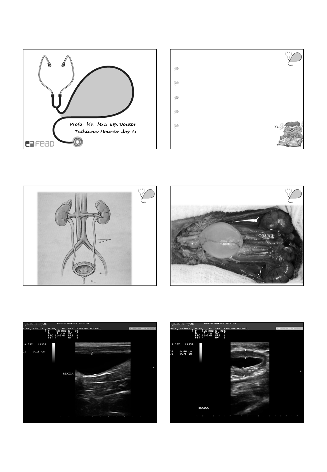 17/08/2014 1 Profa. MV. MSc. Esp. Doutoranda Tathiana Mourão dos Anjos Disciplina Clínica de Felinos Cistite Intersticial Felina Aula 3 Avaliação A1 � 17/09/14. Avaliação A2 � 22/10/14. Avaliação A4 � 03/12/14. Avaliação Exame especial � 10/12/14. Avaliação A3 � sabatinas durante o curso. Rins Ureteres Bexiga Uretra - - - - - - - - - - - - - - - - - - - - - - - - - - - - - - - - - - - - - - - - TUS TUI Ápice Corpo Colo 17/08/2014 2 X DTUIF � doença do trato urinário inferior felino. Qualquer afecção que acometa o TUI dos felinos, de etiologia conhecida ou não. Denominações: Antiga � SUF � Síndrome Urológica Felina (FUS � Feline Urologic Syndrome). Atual � DTUIF � Doença do Trato Urinário Inferior Felino (FLUTD � Feline Lower Urinary Tract Disease). Prevalência: Representa boa parte da casuística de atendimento na clínica de felinos. Percentual de gatos, no Brasil e no Mundo, acometidos por DTUIF gira em torno de 1 a 2%. 21,3 milhões 213-426 mil casos DTUIF/ano População Felina Brasileira (Abinpet 2012) (Kruger, J.M. et al, 1990; Gonzáles, F.D., 2003) 17/08/2014 3 Intersticial (CIF) (65 a 80%) Urolitíase (15 a 23%) Tampões mucosos (“plugs” uretrais) (12%) Defeitos anatômicos (2 a 22%) Distúrbios comportamentais (2 a 10%) Infecções (2%), Neoplasias (1 a 2%) Anomalias vertebrais e mielodisplasia (<1%) (Souza, 2003; Defaw et al, 2011) Em 85% dos casos, não há NENHUMA relação com alimentação ! Etiologia multifatorial: Macho ou fêmea. Entre 2-7 anos. Castrado. Sedentário. Obeso. Consome ração seca e ingere pouca água. Domiciliado. Vive em apartamento. Vive com vários gatos. Pode acometer qualquer gato. Perfil do gato acometido: Apresentação clínica: Disúria � posição de micção por muito tempo, dificuldade de micção. Polaquiúria � uso mais frequente da bandeja sanitária, urina diversas x ao dia, em pequenos volumes. Periúria � micção em locais inapropriados ou incomuns, diferentes daqueles locais de costume. Apresentação clínica: Estrangúria � esforço pra urinar, micção lenta e dolorosa. Hematúria � sangue na urina. Iscúria � retenção por impossibilidade de micção. Apresentação clínica: Alterações no comportamento normal e nos hábitos de higiene � vocalização, lambedura excessiva abdome e região genital - pênis hiperêmico, edemaciado. Disúria, Estrangúria 17/08/2014 4 Disúria, Hematúria Hematúria Hematúria Hematúria 17/08/2014 5 Periúria Apresentação clínica: O felino permanece por um longo período na posição de micção, o que leva o proprietário a relatar que o animal está constipado. Diagnóstico diferencial: Constipação (e/ou obstipação). Problemas articulares. Micção inapropriada (comportamental). Gato assume a mesma posição para urinar e defecar! (http://hoteldegatos.blogspot.com.br/2011/07/o-seu-gato-urina-fora-da-caixa-de-areia.html) Postura de micção: Posição normal de urinar Posição de disúria Fatores de risco - Sexo: Machos e fêmeas acometidos na mesma proporção � forma não obstrutiva. Machos � maior predisposição à forma obstrutiva. 17/08/2014 6 Distância ano-genital: Castrado ou Inteiro: Castrado ou Inteiro: Fatores de risco - Idade: Entre 2 e 7 anos (qualquer idade). Raro em gatos com menos de 1 ano. Gatos < 1 ano � defeitos anatômicos. Gatos > 10 anos � neoplasias, ITU, DRC. Fatores de risco - Raça: Persa � provável predisposição genética (ou talvez por serem mais letárgicos, se exercitem menos). Fatores de risco - Sedentarismo, obesidade e castração: 17/08/2014 7 Fatores de risco - Dieta: Exclusivamente seca e/ou sem controle de minerais � � da DU � RSS urinária seguida de � da agregação e formação de cristais. Baixa digestibilidade � � da frequência de defecação e de perda hídrica � desidratação (fezes - 70% de água). Fatores de risco - Ingestão hídrica: < Ingestão hídrica. < Frequência de micção (> período de retenção). > Exposição da mucosa vesical a substâncias irritantes (ureia). Favorece perda de integridade física vesical � � RSS. Fatores de risco - Liteira e granulado sanitário: Número insuficiente de bandejas (< 1,5/gato). Inadequada ao tamanho do gato. Suja. Localizada em local inadequado (barulho e/ou falta de privacidade) ou de difícil acesso. Fatores de risco - Liteira e granulado sanitário: Aversão à bandeja sanitária após episódio (s) de DTUIF. Quantidade de granulado colocado na bandeja. Frequência de limpeza da bandeja e troca do granulado. Tipo de granulado (preferência do gato). Fatores de risco - Liteira e granulado sanitário: 17/08/2014 8 Granulado “diagnóstico” Laranja e amarelo: pH ácido (inferior a 6), valores de pH felino normais. Verde: pH neutro (entre 6-7.6). Azul: pH alcalino (mais de 7,6), risco de formação de cristais de estruvita. Vermelho: presença de sangue na urina (Hematúria). Castanho: presença de sais biliares (Bilirrubinuria). Fatores de risco - Liteira e granulado sanitário: Fatores de risco - Ambiente: Gatos que vivem dentro de casa ou em apartamento e/ou convivem com outros gatos. Pouco ou nenhum enriquecimento ambiental (especialmente para CIF). Mudanças de rotina. X Fatores de risco - Estresse: Extremamente importante predispõe aos quadros inflamatórios vesicais (CIF). Cistite intersticial felina (CIF) Cistite idiopática felina Síndrome de Pandora Cistite intersticial felina - CIF: Em sua maioria, autolimitante, resolução espontânea (5 a 10 dias). Machos e fêmeas com a mesma frequência, mais comum nos felinos castrados. Cerca de 65 a 80% dos casos. Etiologia complexa, multifatorial e não completamente conhecida. Diagnóstico de exclusão das demais causas potencialmente indutoras de inflamação do TUI. Muitos casos culminam com tampões (“plugs”). 17/08/2014 9 35 - 50% recidivam em 1 ano (média de 6 meses após episódio inicial (recorrências múltiplas). Sintomatolo