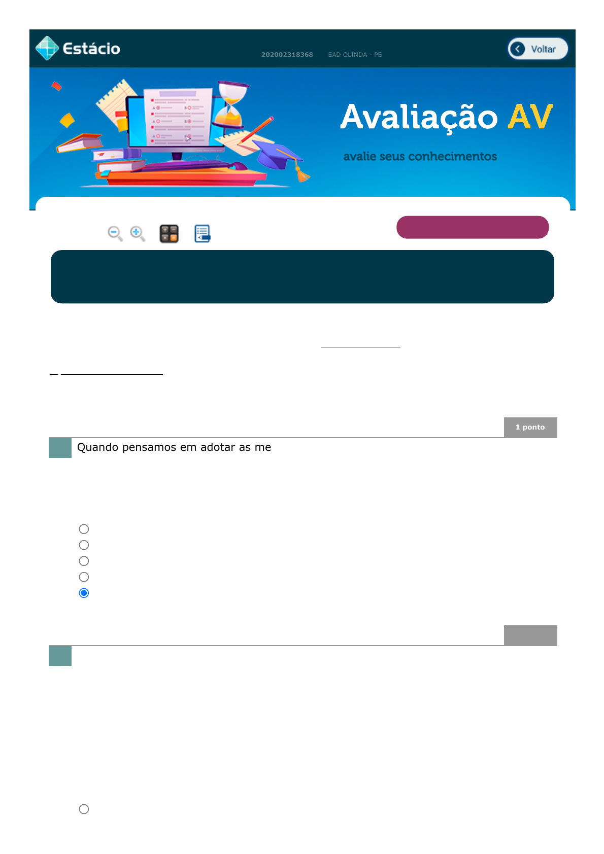 21/04/2021 EPS https://simulado.estacio.br/alunos/?p0=142162776&user_cod=2645834&matr_integracao=202002318368 1/5 Deyze Soares De Lima Avaliação AV 202002318368 EAD OLINDA - PE avalie seus conhecimentos 1 ponto Quando pensamos em adotar as metodologias ativas de aprendizagem em contextos educativos, torna-se fundamental conhecer os fundamentos teóricos e pedagógicos que fundamentam seu uso. Conforme o que estudamos neste tema, assinale a alternativa que apresenta essas teorias. (Ref.: 202006342261) 1 ponto A adoção de metodologias ativas na aprendizagem é considerada uma forma de pensar a educação sob uma perspectiva inovadora e disruptiva, que viabiliza uma aprendizagem mais personalizada, o protagonismo do aluno, a reflexão-ação e a colaboração. Esta proposta ativa de ensino é centrada no aluno e parte da ação para a reflexão e a conceitualização. (MORAN, M. Metodologias ativas para uma aprendizagem mais profunda. In: Bacich, L.; Moran, J. M. (org.) Metodologias ativas para uma educação inovadora: uma abordagem teórico-prática. Porto Alegre: Penso, 2018). De acordo com Moran (2018), é correto afirmar que nesse percurso: (Ref.: 202006342262) Lupa Calc. Notas VERIFICAR E ENCAMINHAR Disciplina: EEL0100 - MET. ATIV E GAM. Período: 2021.1 EAD (G) Aluno: DEYZE SOARES DE LIMA Matr.: 202002318368 Turma: 9004 Prezado(a) Aluno(a), Responda a todas as questões com atenção. Somente clique no botão FINALIZAR PROVA ao ter certeza de que respondeu a todas as questões e que não precisará mais alterá-las. A prova será SEM consulta. O aluno poderá fazer uso, durante a prova, de uma folha em branco, para rascunho. Nesta folha não será permitido qualquer tipo de anotação prévia, cabendo ao aplicador, nestes casos, recolher a folha de rascunho do aluno. Valor da prova: 10 pontos. 1. Cognitivismo; Construtivismo; Socioconstrutivismo; Behaviorismo. Aprendizagem significativa; Comportamentalismo; Humanismo. Comportamentalismo; Cognitivismo; Construtivismo; Socioconstrutivismo. Behaviorismo; Cognitivismo; Construtivismo; Humanismo. Cognitivismo; Construtivismo; Socioconstrutivismo; Conectivismo. 2. A responsabilidade da aprendizagem é totalmente do aluno, sendo a figura do javascript:voltar(); javascript:diminui(); javascript:aumenta(); javascript:calculadora_on(); javascript:anotar_on(); 21/04/2021 EPS https://simulado.estacio.br/alunos/?p0=142162776&user_cod=2645834&matr_integracao=202002318368 2/5 1 ponto De acordo com Patricia Behar, o modelo pedagógico pode ser visto como um "recorte multidimensional", que traz no cerne um elemento denominado de "Arquitetura Pedagógica" (AP), composta por aspectos organizacional, de conteúdo, metodológico e tecnológico. Todos esses aspectos de uma AP precisam ser concebidos de forma bem articulada e integrada para que a concepção da proposta educacional seja coesa. (BEHAR, P.A. (Org). Modelos pedagógicos para a educação a distância. Porto Alegre: Artmed, 2009.) Dessa forma, podemos afirmar que o aspecto metodológico compreende: (Ref.: 202006342257) 1 ponto Leia as afirmativas abaixo e assinale a que for verdadeira, de acordo com as abordagens e estratégias para a aprendizagem ativa. (Ref.: 202006342264) 1 ponto "Atualmente está em voga falar em aprendizagem ativa e metodologias ativas. Em professor dispensável. O aluno aprende muito mais e de forma livre, sem seguir orientações ou esquemas de conteúdo. Há uma "migração" do ensinar para o aprender, o desvio do foco do docente para o aluno, que assume a corresponsabilidade pelo seu aprendizado. O professor deve enfatizar todos os meios comunicacionais que possam fortalecer os elos comunicativos com os alunos, fazendo com que seu discurso prevaleça. Não é possível garantir a aprendizagem do aluno, uma vez que ele irá interagir somente com o que lhe faz sentido. 3. A seleção do que será trabalhado (o tema, os conceitos, as competências a serem desenvolvidas). Os fundamentos teóricos e pedagógicos que embasam o uso das tecnologias em práticas educativas. O planejamento das ações pedagógicas, ou seja, refere-se ao plano de ensino de uma disciplina, aula ou curso. A forma, ou método, pelo qual será conduzido o currículo, isto significa como os conteúdos programáticos serão organizados e trabalhados para que o aluno aprenda. A seleção de recursos para trabalhar com os conteúdos planejados que precisam estar coerentes com a proposta pedagógica adotada. 4. A Aprendizagem Baseada em Projetos (ABP) é uma metodologia ativa capaz de atender às novas demandas da educação e é apropriada para lidar com possíveis desafios da vida profissional. A modalidade on-line de ensino é uma estratégia ativa de aprendizagem porque está toda baseada no uso dos recursos digitais. A aprendizagem baseada em problemas não é uma estratégia ativa de aprendizagem, pois não permite o desenvolvimento da autonomia do aluno. O Behaviorismo é uma estratégia ativa de aprendizagem centrada no comportamento humano como resultado das influências dos estímulos do meio. A sala de aula invertida significa passar do modelo de ensino presencial para o modelo de ensino a distância. 5. 21/04/2021 EPS https://simulado.estacio.br/alunos/?p0=142162776&user_cod=2645834&matr_integracao=202002318368 3/5 poucas palavras, o sentido dessas expressões está relacionado a colocar o aluno como protagonista da aprendizagem, construindo o conhecimento em situações práticas. A aprendizagem ativa pode ser definida como: 'atividades que ocupam o aluno em fazer alguma coisa e, ao mesmo tempo, o leva a pensar sobre as coisas que está fazendo'." (Bonwell, Eison, 1991; Silberman, 1996.) Nesse contexto, qual afirmativa é contrária ao conceito de metodologias ativas? (Ref.: 202006342255) 1 ponto Estabelecer quais atividades os alunos precisam realizar para alcançar os objetivos de aprendizagem, definir as condições para conclusão dessas atividades e explicitar as recompensas para es