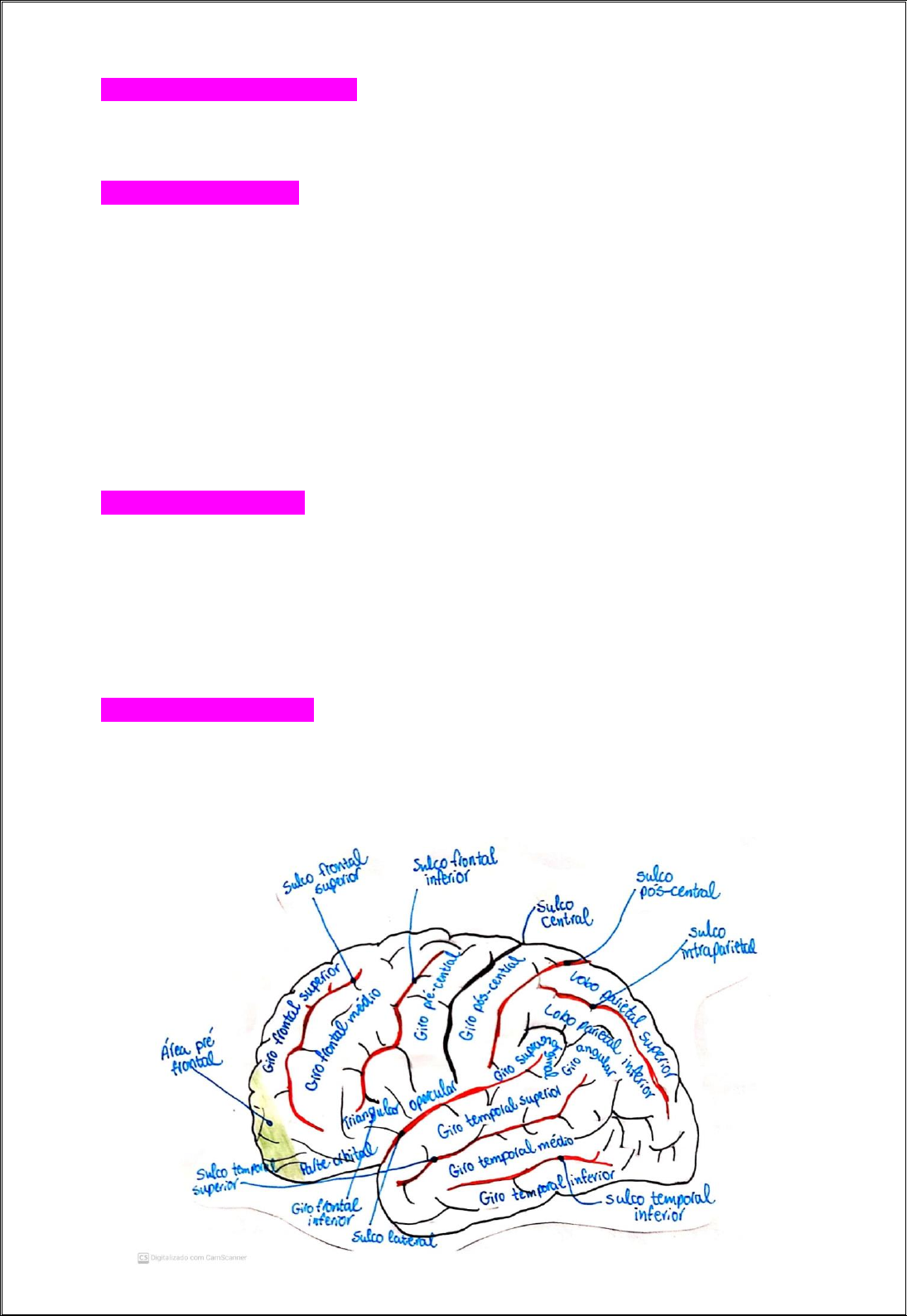 GIROS E SULCOS DOS LOBOS CEREBRAIS Fissura Mediana – vai até a região do corpo caloso e divide os dois hemisférios cerebrais. Giros e Sulcos do Lobo Frontal • Se inicia a partir do sulco central; havendo logo a frente o giro pré-central; • A frente do giro pré-central há o sulco pré-central; • A frente, delimitando horizontalmente três regiões há dois sulcos: o Sulco Frontal Superior e o Sulco Frontal Inferior; • As três regiões supracitadas são denominadas: giro frontal superior, giro frontal médio e giro frontal inferior. O Giro Frontal Inferior ainda possui mais três regiões distintas em razão das funções de linguagem no hemisfério esquerdo, sendo elas: Parte Opercular; Parte Triangular e Parte Orbital. Este lobo está muito relacionado a função motora. Sua parte mais anterior é chamada de Área Pré-Frontal, estando relacionada principalmente ao comportamento, tomada de decisões e sistema emocional. Giros e Sulcos do Lobo Parietal • Depois do sulco central, mais posteriormente está o Giro pós-central; • Giro pós-central é delimitado posteriormente pelo sulco pós-central; • Delimitando horizontalmente estão: o Lobo Parietal Superior e o Lobo Parietal Inferior. Ambos os lobos são divididos pelo sulco intraparietal, que tem origem no sulco pós-central. • O lobo parietal inferior possui dois giros importantes, sendo eles o Giro Supramarginal e o Giro Angular. Giros e Sulcos do Lobo Temporal • Tem seu limite no sulco lateral que divide o lobo frontal e parietal do temporal; • Inferiormente, possui dois sulcos: Sulco Temporal Superior e Sulco Temporal Inferior; • Esses dois sulcos delimitam três giros: Giro Temporal Superior, Giro Temporal Médio e Giro Temporal Inferior. Lobo Insular • A ínsula está localizada no fundo do sulco lateral; • Atrás da ínsula, está o Giro Temporal Transverso Anterior, localizado pósteroinferiormente a ínsula, ele é responsável pela área auditiva, realizando o processamento das informações sonoras. • A ínsula tem seus sulcos, um deles a divide em parte anterior e posterior, sendo o Sulco Central da Ínsula. • A parte anterior constitui os Giros Curtos da ínsula e a parte posterior, os Giros Longos da ínsula. Olhando o Encéfalo de Forma Inferior • Observando o lobo frontal, observa-se a região orbital, nessa região está o nervo olfatório; • O nervo olfatório está alojado no Sulco Olfatório; • Medialmente a esse sulco está o Giro Reto. • A porção lateral ao sulco olfatório, cheia de giros e sulcos são chamados de giros e sulcos orbitais. Vista Sagital Mediana • Há o corpo caloso dividido em: rostro, joelho, tronco e esplênio. • Superiormente ao corpo caloso está o sulco do corpo caloso, e circundando esse sulco está o Giro do Cíngulo. • O giro do cíngulo está em toda a volta do corpo caloso, e quando termina no esplênio faz uma volta e fica “fino”, essa região é chamada de Ístimo do Giro do Cíngulo. • O ístimo do giro do cíngulo realiza uma transição e da origem a região do giro Para-Hipocampal (vinculado ao processamento emocional e ao sistema límbico) e do Ûncus (responsável pelo olfato). • O giro do cíngulo é delimitado superiormente pelo sulco do giro do cíngulo, e esse termina no Ramo Marginal do Sulco do Cíngulo (após esse ramo, o sulco recebe o nome de Sulco Subparietal). Regiões Superiores ao Sulco do Giro do Cíngulo Também Recebem Nomes • Região mais frontal: parte medial do pré-frontal, que vai até o sulco paracentral; • Região mediana: atrás do sulco paracentral está a área paracentral, delimitada posteriormente pelo ramo marginal do sulco do cíngulo. • Posteriormente está o pré-cúneos, que faz parte do lobo parietal; • Atrás do pré-cúneos está o sulco parieto-occipital e atrás dele, o cúneos; • O cúneos é delimitado posteriormente pelo sulco calcarino, a região próxima a esse sulco é importante pois está ligada ao processamento visual.