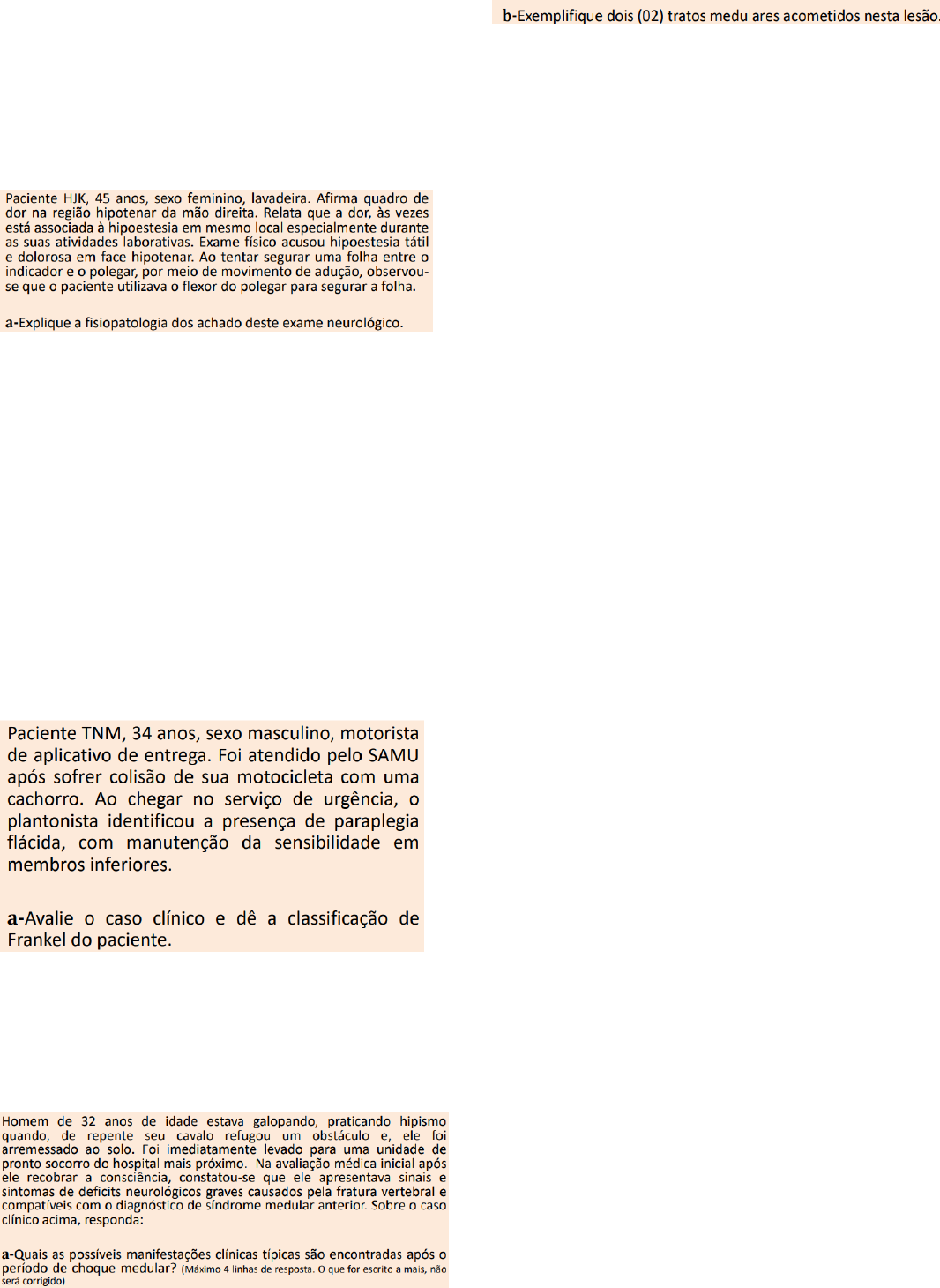 NICOLE MALHEIROS – MEDICINA FUNORTE QUESTÕES DE NEUROLOCOMOÇÃO E PERCEPÇÃO Prova do módulo com gabarito R: Os achados sugerem síndrome do túnel cubital, devido a um comprometimento do nervo ulnar a nível do cotovelo. Como consequência tem-se a paresia da musculatura flexora dos IV e V dígitos, paresia da musculatura adutora, inclusive do primeiro interósseo e hipoestesia na região palmar dos V, e metade medial dos IV dígitos, inclusive em suas respectivas regiões dorsais. Além disso, explica-se o sinal de Froment positivo, devido a paresia do I interósseo e uso do flexor longo do polegar para compensar este déficit, este inervado pelo nervo mediano. R: Classificação Frankel B- pela presença da plegia (ausência de movimento nos membros) e manutenção da sensibilidade. A) Paresia/plegia espástica associada à hiperreflexia abaixo do nível lesado, paresia flácida, com hipotrofia, arreflexia e hipotonia no nível da lesão medular, nota-se ainda hipoestesia ou anestesia para as modalidades de sensibilidade tátil protopática, pressão e térmico-álgica abaixo da lesão. Observa-se ainda bexiga neurogênica. B) Trato corticoespinal anterior e lateral, trato espinotalâmico anterior e lateral, trato espinocerebelar anterior e posterior. 4) Paciente, FHG, sexo feminino, 45 anos de idade, previamente hígida, sofreu um colapso dentro de uma agência bancária, foi transportada ao pronto socorro do hospital mais próximo, ainda comatosa. 4 horas após o ictus ela recobrou a consciência e foi diagnosticada como vítima de um acidente vascular encefálico isquêmico (AVE), apresentando hemianestesia e hemiplegia à esquerda com predomínio na perna e pé, anosognosia e apatia. O diagnóstico foi confirmado pela tomografia computadorizada do crânio. Posteriormente foram realizados exames laboratoriais que afastaram a presença de Dislipidemia, Diabetes Mellitus e Hipotireoidismo Sobre este caso clínico responda: A) Qual artéria cerebral foi acometida (Cite o lado)? R: Artéria cerebral anterior direita B) Quais giros cerebrais foram acometidos? (Correlacione os giros comprometidos com os sinais e sintomas) R: O Giro pré-central/lóbulo paracentral está associado com a hemiplegia; Giro pós-central/lóbulo paracentral associado com a heminastesia; Giro frontal superior/cíngulo relacionado à apatia e Lóbulo parietal superior relacionado com a anosognosia. C) Cite 5 exames laboratoriais relevantes para a identificação da etiologia do AVE isquêmico deste caso clínico. R: Pelo menos 5 exames laboratoriais desse grupo: VHS, FAN, Fator reumatoide, eletroforese de hemoglobina, antitrombina III, Fator V de Leiden, Tetrahidrofolato redutase, anticorpo antifosfolípide, Homocisteína, VDRL, NICOLE MALHEIROS – MEDICINA FUNORTE coagulograma, plaquetas, tempo de protrombina, fibrinogênio, proteína S funcional, proteína C funcional. *Note que no caso clínico, já foram afastados os diagnósticos de Diabetes, Dislipidemia e Hipotireoidismo e por isso não seria relevante solicitar novamente esses exames para a paciente. Note que a paciente é jovem e por isso deveria ser solicitado exames laboratoriais para trombofilias. 5) Paciente 12 anos de idade com história de trauma cerebral secundário a um acidente automobilístico, deu entrada no serviço de urgência com pontuação 10 na Escala de Coma de Glasgow, sonolento, com pupila direita dilatada e não reativa à luz, ptose palpebral direita, hemiparesia à esquerda, hemianestesia à esquerda e movimentos involuntários em hemicorpo esquerdo, Os exames de tomografia computadorizada do crânio e ressonância magnética do encéfalo evidenciaram presença de uma pequena contusão. A) Onde se localiza a lesão deste paciente? R: Pedúnculo cerebral direito/tegmento mesencefálico; Núcleo rubro causando os movimentos involuntários; Pedúnculo cerebral associado a hemiparesia esquerda e hemianestesia e Fibras do nervo oculomotor responsável pela ptose e midríase. B) Algum nervo craniano foi acometido? Se positivo a resposta, qual? R: Nervo Oculomotor C) Qual a fisiopatologia da pupila dilatada? R: O nervo oculomotor, através de fibras parassimpáticas inerva o músculo esfíncter da pupila, responsável pela regulação da miose (contração), quando afetado, a pupila dilata pela ação das fibras simpáticas do músculo dilatador as quais não estão contrabalanceadas pela ação do nervo oculomotor. * Questão cancelada, gabarito duvidoso (verificar antes) R: Provável lesão na região do hipotálamo, que regula a ingestão de líquidos através do centro da sede por meio de osmorreceptoes e atua também no equilíbrio salino através do ADH, hormônio que atua diretamente na regulação do equilíbrio hídrico.