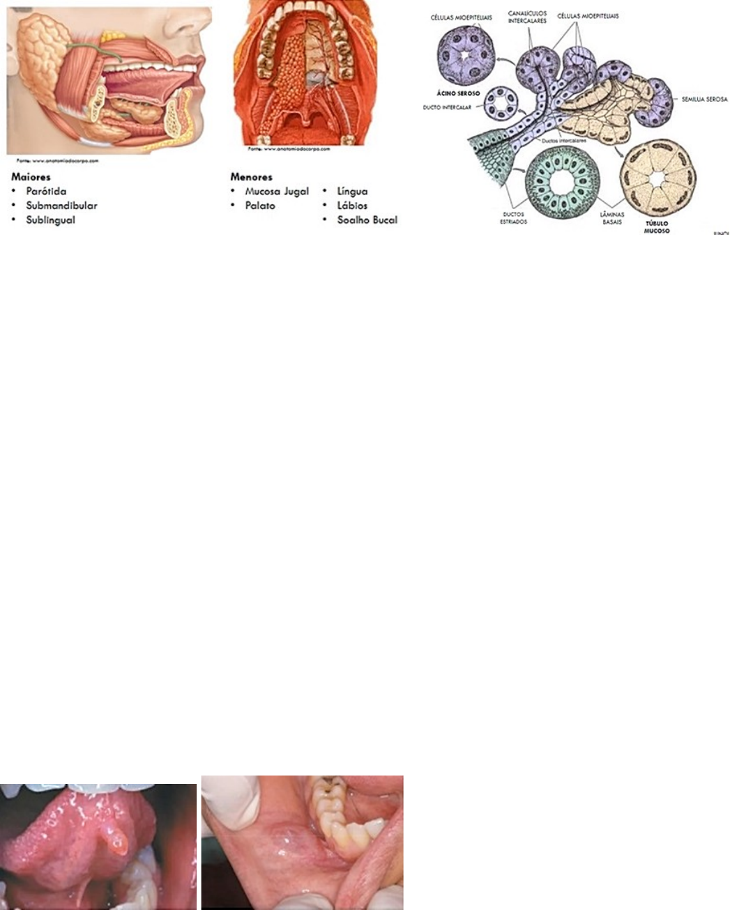 Estomatologia estomatopatologia das glândulas salivares INTRODUÇÃO - Reacinais: - Mucocele/Ranula - Cisto de retenção mucoso - Sialolitíase - Sialometaplasia Necrotizante - Infecciosas: - Sialodenite - Imunologicas: - Lesão Linfoepitelial benigna - Sindrome de Sjogren - Neoplasicas: - Adenoma Pleomorfico - Tumor de Warthin - Carcinoma adenoide cístico - Carcinoma Mucoepidermoide MUCOCELE/RANULA - fenômeno de extravasamento de mucina - 1 e 2º década de vida - etiologia: trauma - Forma: vesícula (maior que 3mm), ou bolha, menor que 3 mm - coloração: azulada ou normocrômica - consistência: flutuante ou firme - Localização: lábio inferior > soalho> ventre de língua > mucosa jugal - *Mucocele superficial: palato mole, região retromolar e mucosa jugal posterior. Uma ou múltiplas vesículas (1 a 4 mm). Recidivas, refeições (mucocele) (rânula “mucocele em assoalho”) (ranula mergulhante) - Modalidades de tratamento: - excisão cirúrgica (biopsia excisional) + remoção da glândula associada - marsupialização - micromarsupialização (odontopediatria) CISTO DO DUCTO SALIVAR - sialocisto - Cisto verdadeiro (desenvolvimento) proliferação do epitélio ductal - Adultos - Etiologia: incerta (não relacionada a trauma – diferente do cisto de retenção mucosa) - características clinicas idênticas às da mucocele de extravasamento e de retenção - diferenciação histopatológica SIALOLITIASE - calculo salivar - Adultos e de meia idade; submandibular - Etiologia: deposição de sais de Ca2+ ao redor de um ninho de debris na luz do ducto - Radiologia Oclusal - Forma; nódulo, coloração amarelada ou normocromica; consistência firme - dor durante as refeições - Modalidade de tratamentos: - sialogogos, aplicação de calor, aumento da ingestão de líquidos - ordenha - excisão cirúrgica - litotripsia de ondas de choque, sialoendoscopia, remoção guiada radiograficamente SIALOMETAPLASIA NECROSANTE - etiologia: isquemia do tecido glandular - mimetiza processo maligno (clinico e microscopicamente) - adultos, palato (75%) - autolimitante - não é obrigatório biopsiar SIALADENITE - etiologia: infecciosas (viral: caxumba; e bacteriana) e não infecciosas (síndrome de Sjorgren, sarcoidose, radioterapia) - infecção bacil: obstrução ductal ou diminuição do fluxo salivar - diagnostico: clinico-radiografico (sialografia) - Tratamento: - aguda: antibioticoterapia, drenagem cirúrgica - crônica: antibioticoterapia, analgesia, sialogogos, massagem, sialolitiase associada?, se sim: cirurgia. LESÃO LINFOEPITELIAL BENIGNA - Doença de Mikulicz (1888) – gls salivares e lacrimais (bilateral) - Sindrome de Mikilicz: sarcoidose, TB, Linfoma - Sialoadenite mioepitelial - etiologia: imune (AC contra o parênquima glandular) - mulheres de meia idade - aumento uni ou bilateral das glândulas salivares -85% parotida, bilateral mais associada a SJ - Febre, infecção do trato respiratório ou oral, exodontia - remoção cirúrgica - Maior tendência a transformação maligna SINDROME DE SJOGREN - xerostomia e xeroftalmia - etiolopatogenese (hipersensibilidade iV – vírus linfotrópico (HTLV); EBV ou fatores genéticos; HLA) - apresentação: - primaria e secundaria (associação a outra condição – AR 15 %; LES 30%) - características clinicas: - lesão linfoepitelial benigna associada a síndrome sicca - ressecamento de outras mucosas (bucal, lacrimal, vaginal...) - candidíase secundaria, caries, ulceras - sintomas sistêmicos e outras mucosas secas - biopsia de glandula salivar labial (inflamação) - tendência a linfoma ADENOMA PLEOMORFICO - mais comum -“tumor misto benigno”? etiologia incerta - patogênese: alterações citogenéticas nas células ductais e mioepiteliais - adultos (30 – 60 anos), mais em mulheres - unilateral (ocasionalmente bilateral) - mais na parotida > palato > lábio superior > mucosa jugal - crescimento lente; proporções maiores - capsula fibrosa (obs: palato) - modalidades de tratamento: - excisão cirúrgica (Paartidectomia parcial ou total * nervo facial*) - enucleação - marsupialização TUMOR DE WARTHIN - parótida (2º tumor benigno que mais acomete) - etiopatogênese incerta - adultos idosos, mulheres mais que homens - massa nodular indorlor, de crescimento lente - consistência firme, ocsasionalmente flutuante - modalidades de tratamento: - remoção cirúrgica (paratidectomia total ou parcial) CARCINOMA ADENOIDE CISTICO - etiologia incerta; cilindroma – termo não mais utilizado - 2º tumor maligno mais comum - adultos de meia idade, mulheres mais que homens - glândulas salivares menores > parotida e submandibular - aumento de volume, firme, de crescimento lento - dor - parotida (nervo facial); palato (ulceração, destruição ossea) - Biopsia incisional – ambulatorial - Modalidades de tratamento: - excisão cirugica radical - radioterapia - esvaziamento cervical – rara - metástase a distancia e recidiva CARCINOMA MUCOEPIDERMOIDE - neoplasia maligna mais comum - ampla faixa etária (2º a 7º década de vida) - parótida > palato - lábio inferior, soalho =, língua, região retromolar e intraóssea - aumento de volume assintomático - dor e paralisia do nervo facial (tumores de alto grau) - variação intraóssea - predileção pelo sexo feminino - baixo grau - origem: tecido glandular ectópico?? Epitélio odontogênico (cisto dentigero)? - biopsia incisional – ambulatório - modalidades de tratamento: - excisão cirúrgica (quanto maior o grau histológico – maior a margem necessaria) - excisão cirúrgica + radioteriapia (lesões mais avançadas e agressivas; esvaziamento cervical – lesões grandes com suspeita de envolvimento linfonodal)