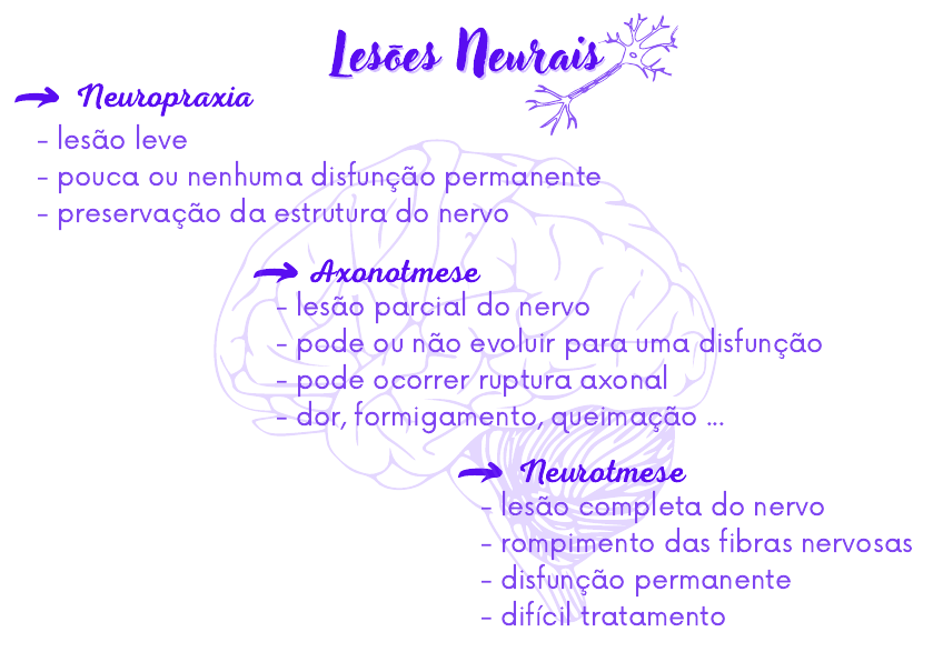 Lesões NeuraisLesões Neurais Neuropraxia Axonotmese Neurotmese - lesão leve - pouca ou nenhuma disfunção permanente - preservação da estrutura do nervo - lesão parcial do nervo - pode ou não evoluir para uma disfunção - pode ocorrer ruptura axonal - dor, formigamento, queimação ... - lesão completa do nervo - rompimento das fibras nervosas - disfunção permanente - difícil tratamento