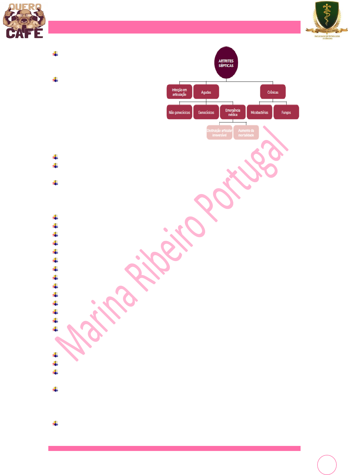 Marina Ribeiro Portugal MARINA RIBEIRO PORTUGAL ARTRITE SÉPTICA SANARFLIX 1 1. Definição Invasão direta do microrganismo na membrana sinovial e componentes do espaço articular Possui diferentes graus de atividade inflamatória justamente por conta da interação microrganismo- hospedeiro ❖ Bactéria ❖ Micobactéria ❖ Fungo ❖ Vírus (ex. parvovírus B19, rubéola, Epstein-Barr, HCV, HBV) Seu curso pode ser agudo ou crônico Artrite reativa X artrite séptica *Artrite reativa a infecção não está na articulação diferentemente da artrite séptica A artrite séptica é considerada uma emergência clínica, pois o seu atraso no diagnóstico e/ou tratamento pode levar a uma irreversível destruição articular e aumento de mortalidade. 2. Fatores de risco (anexo) Idade acima dos 80 anos; Diabetes mellitus; Alcoolismo; Condições que causam danos na integridade da pele, como psoríase, eczema e úlceras; Cirurgia articular prévia e prótese articular; Cirrose hepática; Doença renal crônica, principalmente nos que estão em diálise; Neoplasias e uso de quimioterápicos; Usuários de drogas endovenosas; Hemofílicos; Transplantados; AIDS; Pacientes com hipogamaglobulinemia; Doenças com comprometimento imunológico como artrite reumatoide e lúpus eritematoso sistêmico. 3. Artrocentese Punção intra-articular Procedimento padrão-ouro para artrite asséptica Artrocentese X infiltração *Uma você drena e a outra você insere, ambas utilizam a mesma técnica Indicações: ❖ Suspeita de artrite séptica ❖ Artrites microcristalinas (ex. gota) ❖ Artrite de etiologia a esclarecer Contraindicações: ❖ Se suspeita de artrite séptica → nenhuma ❖ RNI > 3 pelo risco de sangramento Marina Ribeiro Portugal MARINA RIBEIRO PORTUGAL ARTRITE SÉPTICA SANARFLIX 2 ❖ Realocar se lesão de pele ❖ Celulite Deve-se solicitar no exame: ❖ Celularidade ❖ Pesquisa de cristais ❖ Cultura ❖ Bacterioscopia ❖ PCR para tuberculose em casos selecionados ❖ Lembre que líquido sinovial não é liquor e nem utiliza os critérios de Light 4. Classificação do líquido sinovial Normal I (não inflamatório) II (inflamatório) III (séptico) IV (hemartrose) Viscosidade Alta Alta Diminuída Diminuída Alta Coloração Incolor Amarelo claro Alaranjado; pouco turvo Purulento; turvo Vermelho Leucócitos 0-200 200-2.000 2.000-5.000 >50.000- 100.000 Similar ao sangue % PMN <25% <50% >50% >75% Similar ao sangue Causas Fisiológico Osteoartrite Artropatias inflamatórias e microcristalinas Sépticas e pseudosépticas Trauma; neoplasia; distúrbios da coagulação *Os polimorfonucleares são o grupo de leucócitos que incluem os granulócitos, que são os neutrófilos, eosinófilos e basófilos. Essas células são as primeiras a chegar no foco inflamatório, constituindo a primeira defesa do organismo, que além de combaterem diretamente os patógenos invasores com suas enzimas e granulócitos, também liberam citocinas que recrutam outras células inflamatórias para resolverem a inflamação. 5. Epidemiologia Acomete todas as faixas etárias S. aureus o mais comum em todas as faixas etárias Indivíduos mais susceptíveis: ❖ Idosos e crianças ❖ Imunossuprimidos ❖ Diabéticos ❖ Etilistas ❖ Usuários de drogas endovenosas 6. Etiopatogênese Disseminação predominante pela via hematológica (70%), mas também pode ocorrer por osteomielite adjacente, iatroênica, trauma, contiguidade da pele e linfática Etiologia com forme a faixa etária: ❖ Recém-nascido → S.aures Marina Ribeiro Portugal MARINA RIBEIRO PORTUGAL ARTRITE SÉPTICA SANARFLIX 3 ❖ Crianças entre um mês a cinco anos → vacinada S.aures; não vacinada H.influenzae ❖ Adulto jovem sexualmente ativo → N. gonorrheal; S.aureus Etiologia com forme a condição clínica ❖ Etilista/cirrótico → bacilo gram negativo; S.pneumoniae ❖ Malignidade → bacilo gram negativo ❖ Diabéticos → bacilo gram negativo; cocos gram positivos ❖ Usuários de drogas → P.aeruginosa; S.marcescens; S.aureus ❖ Mordida de cães → P.multocida ❖ Hemoglobinopatias → S.pneumoniae ❖ Hipogamaglobinemia → M.hominis ❖ Leite não pasteurizado →Brucella sp. Fisiopatologia: *A artrite séptica, pode ser provocada por inoculação direta de patógenos na articulação e, além disso, também pode ocorrer por contiguidade, como na osteomielite e infecção de pele, porém essa via é incomum nos pacientes pediátricos; e por via hematogênica, comum nos membros inferiores, principalmente na articulação do joelho e coxofemoral. Basicamente, o processo infeccioso se instala no interior da articulação quando a metáfise apresenta localização intra-articular, como no quadril e ombro, ou por invasão de partes moles, por contiguidade. A ausência de membrana basal facilita a entrada da bactéria na sinóvia durante o processo de bacteremia, gerada num quadro de infecção respiratória, por exemplo, especialmente nos pacientes pediátricos. Isso pode ter como consequência a degradação da cartilagem e tecido ósseo, a partir da liberação de enzimas proteolíticas, migração de leucócitos e derrame sinovial, ou seja, um processo inflamatório intenso que gera morte do tecido. A infecção dentro da articulação destrói essa estrutura por um processo de condrólise química, na qual as enzimas bacterianas e seus produtos de degradação são condrolíticas. Inicialmente, ocorre a perda da matriz cartilaginosa, seguida de perda de colágeno cartilaginoso. As enzimas bacterianas geram erosões na superfície articular, que se soltam para dentro da articulação como grumos ou fragmentos livres. Essas alterações destrutivas já podem ser observadas dentro de 24 a 48 horas de infecção, e se tornam mais grave com o maior tempo do pus dentro da cavidade articular. O aumento do volume de líquido dentro da articulação gera grande pres- são intra-articular e distensão da cápsula articular, o que leva à isque