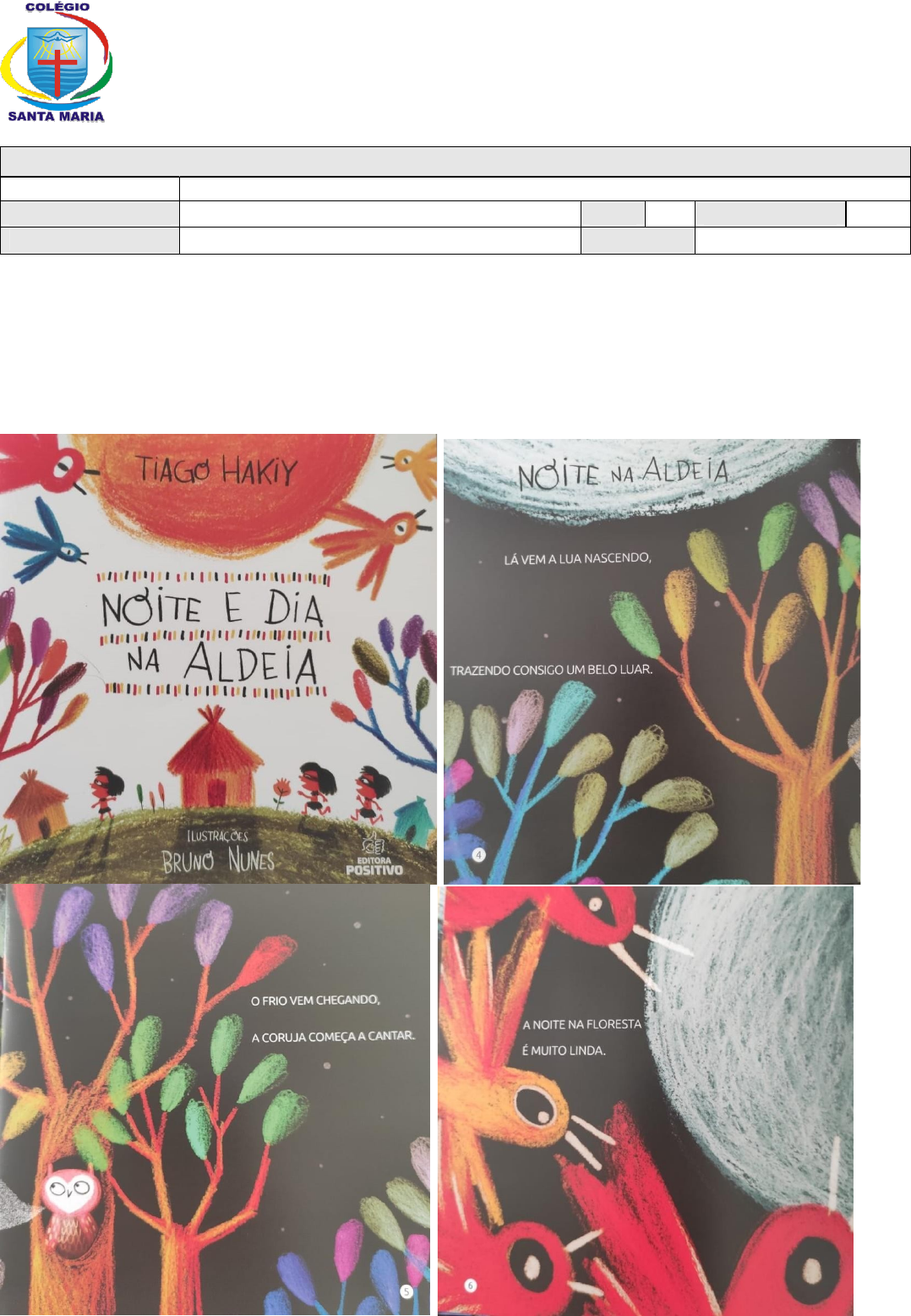 COLÉGIO SANTA MARIA Irmãs Missionárias Servas do Espírito Santo Educação Infantil – Ensino Fundamental e Médio www.csmaria.org.br ATIVIDADES PARA O PERÍODO DE SUSPENSÃO DAS AULAS DISCIPLINA NOME Nº TURMA 1º PROF. DATA / / 2020 Querido(a) aluno(a)! Esta atividade é para ser realizada, no período em que ficarão em casa, em virtude à suspensão das aulas como medida de prevenção ao coronavírus. Quando retornar ao colégio, devem trazê- las para a professora, com as atividades resolvidas. REALIZE, DURANTE A SEMANA, A LEITURA DO LIVRO “NOITE E DIA NA ALDEIA”, DE TIAGO HAKIY E EXPLORE A SEQUÊNCIA DE IMAGENS EM FAMÍLIA (LITERATURA DO 1º TRIMESTRE).