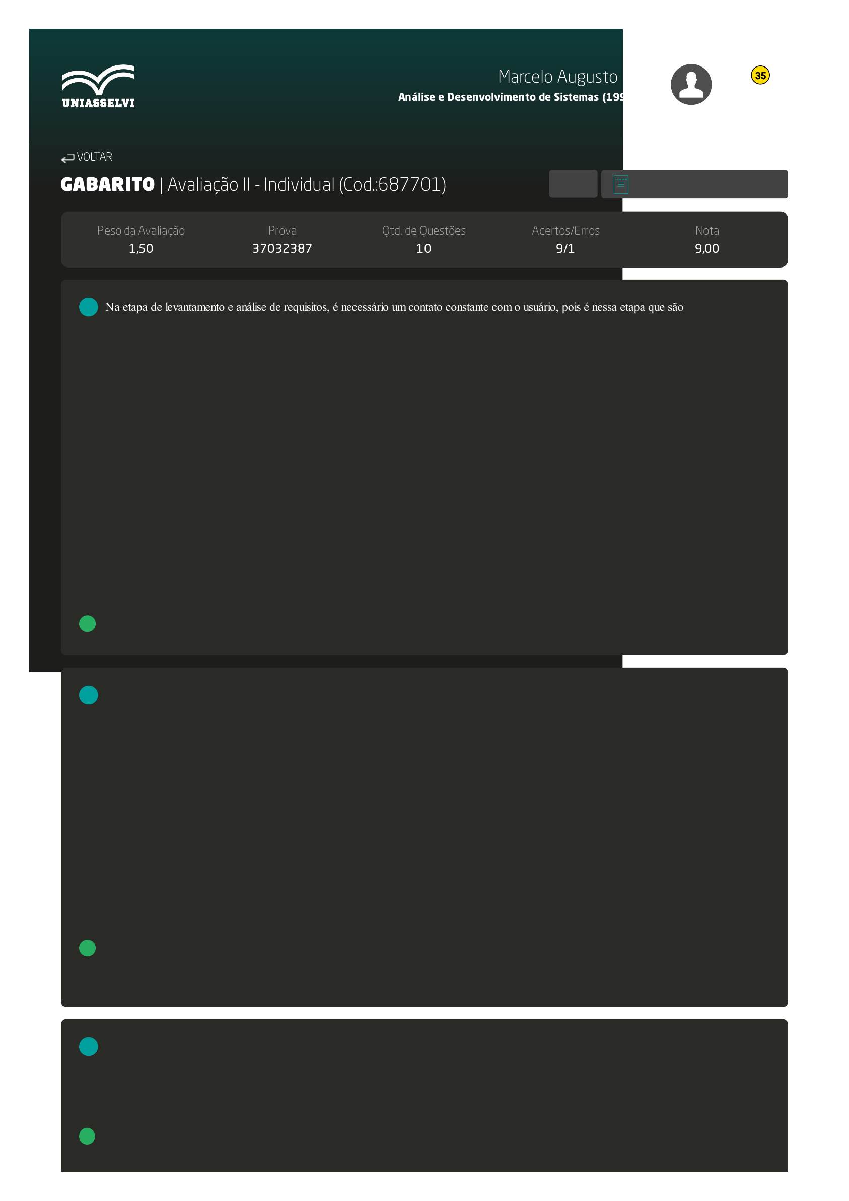 25/09/2021 21:35 AVA https://ava2.uniasselvi.com.br/subject/grades-and-tests/answer-book/eyJ0ZXN0Ijp7InRlc3RDb2RlIjoiNjg3NzAxIiwiZGVzY3JpcHRpb24iOiJBdmFsaWHDp8OjbyBJSSAtIEluZGl2aWR1YWwiLCJwYXJhbWV0ZXIiOjU0OSwiZXhhb… 1/4 GABARITO | Avaliação II - Individual (Cod.:687701) Peso da Avaliação 1,50 Prova 37032387 Qtd. de Questões 10 Acertos/Erros 9/1 Nota 9,00 Na etapa de levantamento e análise de requisitos, é necessário um contato constante com o usuário, pois é nessa etapa que são detalhadas as funcionalidades das atividades, assim como os processos que possam ser automatizados. A comunicação é um dos maiores desafios dessa etapa de levantamento e análise de requisitos. Outro fator crítico está relacionado às dúvidas dos usuários com as potencialidades dos sistemas de informação. Relacionado aos fatores críticos no levantamento de requisitos, classifique V para as sentenças verdadeiras e F para as falsas: ( ) Os requisitos não estão completos. ( ) Usuário não comprometido, falta de envolvimento do usuário. ( ) Usuário possui uma expectativa do sistema diferente da realidade. ( ) Falta de apoio pela alta gerência. ( ) Falta de recursos. Agora, assinale a alternativa que apresenta a sequência CORRETA: A V - V - F - F - V. B F - F - F - V - V. C V - V - F - F - F. D V - V - V - V - V. A fase de design consiste basicamente no aprimoramento do diagrama de classes definido na fase de análise. É através da utilização dos documentos elaborados nesta fase que os desenvolvedores partirão para a programação propriamente dita, o que por si só justifica a importância desta. Com relação à fase de design e suas características, analise as seguintes sentenças: I- Nesta fase, são definidos novos atributos, métodos e funcionalidades para as classes. II- O diagrama de componentes é o artefato em que são registradas as classes e colaborações entre elas. III- As classes de infraestrutura são mescladas às classes de domínio na etapa de design. IV- Na fase de projeto serão modeladas as classes de infraestrutura que darão suporte às classes de domínio. Agora, assinale a alternativa CORRETA: A As sentenças I e II estão corretas. B As sentenças II e IV estão corretas. C As sentenças I, III e IV estão corretas. D As sentenças I, II e III estão corretas. Na engenharia de software, as fases de prototipação de um projeto compreendem a elaboração de modelos iniciais do software que será desenvolvido, objetivando uma visão mais ampla do produto final. Considerando as características da prototipação, assinale a alternativa CORRETA: A No ciclo de desenvolvimento prototipação, não há a participação direta do cliente. B Uma das dificuldades da prototipação é conscientizar o cliente de que o que está sendo testado é somente um rascunho que está distante do produto final. VOLTAR A+ Alterar modo de visualização 1 2 3 Marcelo Augusto Kuhn Análise e Desenvolvimento de Sistemas (1993162) 35 25/09/2021 21:35 AVA https://ava2.uniasselvi.com.br/subject/grades-and-tests/answer-book/eyJ0ZXN0Ijp7InRlc3RDb2RlIjoiNjg3NzAxIiwiZGVzY3JpcHRpb24iOiJBdmFsaWHDp8OjbyBJSSAtIEluZGl2aWR1YWwiLCJwYXJhbWV0ZXIiOjU0OSwiZXhhb… 2/4 C Uma das dificuldades na prototipação é a ausência de ferramental adequado para a criação de protótipos. D A prototipação não necessariamente envolve a criação de um software que possa ser executado pelo cliente. O termo classe é muito utilizado na programação e análise orientada a objetos, pois os objetos somente existem através da instanciação de uma classe, que fornece estado e comportamento padrão para estes durante seu ciclo de vida. Com relação à programação e análise orientada a objetos, classifique V para as sentenças verdadeiras e F para as falsas: ( ) As classes, em geral, representam elementos do domínio do problema no mundo real. ( ) Somente o estado de instâncias pode ser moldado através de uma classe. ( ) Uma instância é formada por estado e comportamento, sendo ambos definidos por um pedaço de software conhecido como classe. ( ) O comportamento de uma instância somente é definido através da herança. Agora, assinale a alternativa que apresenta a sequência CORRETA: A F - V - V - F. B V - F - V - F. C F - F - V - V. D V - F - F - V. A vida de um software não finaliza após a sua implantação, ele continua existindo durante muito tempo. Será utilizado por anos, e várias atualizações ocorrerão, isto é, a manutenção é qualquer alteração no software após entrar em produção. Sobre a manutenção de software, classifique V para as sentenças verdadeiras e F para as falsas: ( ) A manutenção corretiva é utilizada na hora de realizar a correção de falhas de funcionalidade do software. ( ) A manutenção adaptativa se refere às modificações realizadas em um software adaptando a uma nova realidade. ( ) A manutenção evolutiva acrescenta novas funcionalidades e melhorias conforme solicitações realizadas pelos usuários. ( ) A manutenção intermediária se refere às modificações realizadas no andamento do projeto. ( ) Ao ser realizada qualquer tipo de manutenção, não é necessário fazer a sua documentação. Agora, assinale a alternativa que apresenta a sequência CORRETA: A V - V - V - F - F. B V - F - V - F - V. C F - F - F - V - V. D V - V - F - F - V. A manutenção de um software consiste na alteração de seu código-fonte de maneira a fazer sua adaptação a uma nova situação do domínio de conhecimento onde este software atua. Tais alterações são constantes e representam, em geral, a maioria do trabalho no ciclo de vida de um software. Considerando as características das manutenções de software, analise as seguintes sentenças: I- A manutenção corretiva é aquela em que são corrigidos problemas e feitas pequenas adaptações no software. II- A manutenção evolutiva é aquela em que se evolui o software através da correção dos erros existente