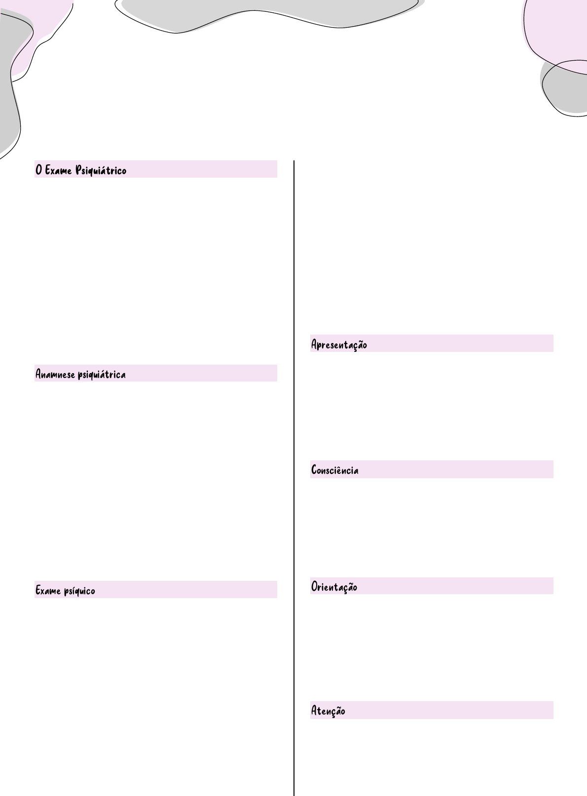 Saúde mental I Nosologia psiquiátrica Estrutura: • ANAMNESE • EXAME PSÍQUICO • EVOLUÇÃO (Texto dissertativo em linguagem SIMPLES) • SÚMULA PSICOPATOLÓGICA (Texto TÉCNICO) • HIPÓTESE DIAGNÓSTICA, ter muita atenção, pois o critério temporal é um fator diferenciador • CONDUTA • Identificação • Queixa principal • HDA • História Pessoal (+ social, etc...) • História Familiar • HPP É importante para caracterizar o perfil farmacogenético do paciente, características genéticas do indivíduo que podem ditar a tendência como eles vão lidar com tal medicamento. • Apresentação • Consciência • Orientação • Atenção • Memória • Inteligência • Sensopercepção • Pensamento + Juízo de Realidade • Linguagem • Consciência do Eu • Afetividade • Humor • Psicomotricidade • Vontade • Pragmatismo • Autopercepção (Insight) 1º: Observe • Aparência: descrição física, cuidados, vestuário • Comportamento: motilidade, expressões faciais • Atitude diante do observador: desconfiado, cooperativo, indiferente. • Responsividade: fala muito, fala pouco... • Alterações quantitativas, por ex seria ao nível de consciência rebaixado • Alterações qualitativas, como estreitamento, por ex, visão de túnel Ex.: Estreitamento, rebaixamento, turvação. • Autopsíquica • Alopsíquica Ex.: Somatopsíquica, temporal e espacial. DESCREVER: “O paciente sabe dizer onde se encontra, sua identificação, o motivo da consulta...” • Normovigil (euprosexia) • Hiper ou hipo-vígil, resposta aos estímulos ambientais • Hiper ou hipo-tenaz EX.: “Paciente atento ao diálogo, sem se distrair com os ambientes adjacentes.” NÃO CONFUNDIR DISTRAIBILIDADE COM HIPOMNÉSIA Tdh é um transtorno que altera a atenção primariamente Amnésias: • Anterógrada, não se lembra de eventos recentes, info novas • Retrógrada • Retro-anterógrada • Lacunas amnésicas • Etc… NÃO CONFUNDIR COM A ATENÇÃO (estava distraído, e não esquecido) • Avaliar a autonomia do paciente! • Aplicar testes • Oligofrenia? (deficiência intelectual), ou transtorno neurocognitivo? • Reposta = Avaliar a MEMÓRIA e a CONSCIÊNCIA • Quadro organocerebral agudo = ? • Quadro organocerebral crônico = ? Oligofrenia não tem alteração da memória ou da consciência • Alucinações verdadeiras (TODAS as características de uma percepção real, lúcida), acontece no transtorno do espectro da esquizofrenia • Pseudo-alucinações (representações vagas, ecos do pensamento, falando em terceira pessoa) • Alucinose (“Vovó está vendo bichos na parede branca”) • Ilusões, interpretações erradas de um estímulo real • Forma, é a concatenação de ideias • Fluxo • Conteúdo • EX.: Delirium, delírio • Conectividade / Organização • Circunstancialidade • Tangencialidade • Associações frouxas • Salada de palavras -Tangencialidade, transtornos afetivos ou cognitivos -Falta de associação -Pensamentos e linguagens pode dizer muito sobre o paciente e até mesmo indicar diagnosticos precocemente, esse estudo é sobre os sonhos e a relação com esquizofrenia • Dislalia, cebolinha • Disartria, problema de articulação da fala • Disfemia, gagueira • Neologismo, pacientes do espectro da esquizofrenia, inventa coisas e etc. DESCREVER: “Expressa-se por meio de mensagens bem articuladas...” • Sentimentos de Atividade (Eu quem estou agindo) • Consciência da existência: Sinto-me sem nome, um nada... • Consciência de execução: Não sou eu quem pensei isso... • Unidade (Sou o Sr. Joaquim e Jesus também, ao mesmo tempo) • Identidade (Depois da abdução eu não sou o mesmo) Em oposição ao mundo exterior (Meus pensamentos são transmitidos para o seu computador) • Capacidade de lidar com frustrações, adversidades, e como se expressa: • Incontinência emocional • Sensibilidade • Etc... • Normotímico • Hipertímico, exaltado • Hipotímico • Distímico, amargurada Autores... Afeto? Humor? Emoção? Sentimento? E paixão Emoção é pontual, se persistir vira um humor. Sentimento tem um significado, afeto é o tônus emocional do paciente, se expressa de forma muito exaltada ou indiferença… paixão é um estado afetivo que polariza o indivíduo e tiraniza ele. • AUTO-EXPLICATIVO? • Flexibilidade cérea, ecopraxia, automatismos, tiques motores, estereotipias, maneirismos... • Normal, diminuída, exaltada, acelerada, agitado, inquieto... • Hiperbulia, hipobulia • Compulsões, impulsos... PROCESSO VOLITIVO E DELIBERAÇÃO AÇÃO = PRAGMATISMO OBS.: Alguns autores consideram o Julgamento como função psíquica separada, e não como parte da estrutura do processo volitivo. • AUTO-EXPLICATIVO? • Capacidade de auto-cuidado, auto- preservação, comer, trabalhar... • “Compreendeu a estrutura de seu transtorno, os eventos associados à ele e a necessidade de tratamento.” • “Expectativas de tempo de melhora...” • “Demonstrou resistência ao uso de neurolépticos, mas não ao de ISRS...” Pensamento -> humor -> vontade Resultado = Súmula psicopatológica • Texto TÉCNICO descrevendo o quadro clínico: • “Fulano, x anos, lúcido e orientado auto e alopsiquicamente. Vestido adequadamente, boa aparência. Cooperativo. Normovigil. Inteligência mantida. Hipertenaz e hipovigilante. Sensopercepção alterada com alucinações auditivas complexas, congruentes com atividade delirante sistematizada (seus vizinhos são da Polícia Científica e estão implantando mensagens de áudio no seu cérebro, com as quais ele conversa). Padrão distímico, com afeto normomodulado, e não embotado como há 1 ano atrás.” • EX.: F20.0 Esquizofrenia paranóide (em tempo, transtorno esquizofreniforme) • Tratamento farmacológico • Tratamento não-farmacológico Psicoterapia, internação hospitalar, comunidade terapêutica, etc... kkkkkkkkkkkkkkkkkkkkkkkk