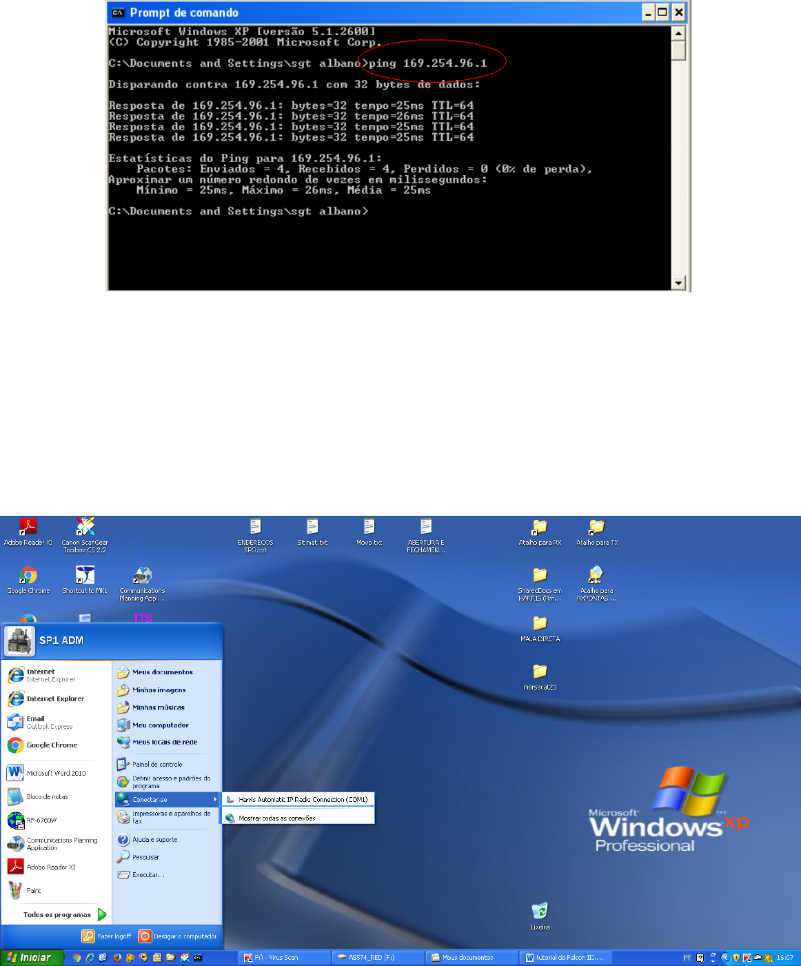1. Sempre ligar o computador antes do equipamento rádio. 2. Certificar-se de que o computador realmente esteja conectado com o rádio. Para isso vá em conexões de rede e execute o teste pelo CMD. 3. Verificar a conexão de dados no radio FALCON III. Clicar na tecla 8(PRG) –> CONFIG –> NETWORK –> INTARFACE –> ETHERNET –> ADDRESS –> DIRECT USB Usar a opção DIRECT USB com DHCP ATIVADO (ENABLE) após o rádio estar configurado. 4. No menu iniciar do Windows, vá na opção Conectar-se e clicar em Mostrar todas as conexões. 4. Clicar com o botão direito do mouse, na conexão de rede correspondente ao rádio. 5. Clicar na opção Protocolo TCP⁄IP e em seguida Propriedades. 6. Na próxima tela, marcar a opção Usar o seguinte endereço IP e preencher as opções com o endereço IP do rádio. IP DO RADIO : 169.254.096.001 MASCARA: 255.255.255.0 Gatway padrão (LOCAL HOST DA MAQUINA DEVERÁ SER): 169.254.096.002 7. Após o Rádio ter sido reconhecido e programado pelo computador, voltar para a opção Obter um endereço IP automaticamente. INSTALAÇÃO DO SOFTWARE CPA Responsável pela programação do Rádio. 1. Executar o programa HarrisAutoStart.exe. 1.1 – Na aba SOFTWARE, instalar o programa CPA for RF-7800H-MP V1.3.2. 1.2 – Instalar o programa NRDI V1.6. 2. Após instalar o programa, na aba FILE, clicar na opção OPEN e então carregar o arquivo com o nome: arquivo para São Paulo.hcpa 3. O arquivo irá carregar todas as Estações Rádio pertencentes a rede rádio fixa de São Paulo, nas topologias 3G e ALE. 4. Então clicar na Estação Rádio desejada e iniciar a programação do rádio. 5. Na tela Radio Programming, marcar a opção Ethernet e inserir o IP inicial do Rádio (169.254.078.001). FREQUÊNCIAS PROGRAMADAS NO RÁDIO INSTALAÇÃO DO SOFTWARE WMT Responsável pelo gerenciamento do Rádio. 1. Executar o programa Install.exe, localizado na pasta Target Media. 2. Na aba SOFTWARE, clicar na opção RF-6760W. 3. Após instalar o programa, na aba FILE, clicar na opção IMPORT DATABASE e então carregar o arquivo com o nome: arquivo para São Paulo.vpd 4. Definir a sua Estação Rádio, como local. 5. Clicar com o botão direito do mouse na Estação Rádio desejada e em seguida clicar na opção Propriedades. 6. Na aba Station Propeties, marcar a opção Local Station. Username: wmtuser Password: 123456 7. Clicar com o botão direito do mouse em Radio1 e em seguida clicar na opção Propriedades. 8. Na aba Local Settings, marcar a opção Don´t start a mail client. 9. Na aba Modify Radio, clicar na opção Connection Properties e marcar a opção Ethernet com o IP do Rádio. CONFIGURAÇÃO DO SISTRAD-HF 1º Passo: No menu Configuração, clicar na opção Gerenciar servidor 2º Passo: a) Criar Novo Servidor – Clicar na aba Novo e criar um novo servidor chamado FALCONIII. b) Na aba Correio Eletrônico: b1) E-mail da SP/3: wmtuser@barueri.rrf.eb.mil.br (novo e-mail criado pelo programa WMT) b2) Nome da conta: FALCONIII b3) Tipo de Tráfego: HF c) Na aba Servidor: c1) E-mail de saída (SMTP): 10.12.29.235 (Endereço IP da máquina em que o SISTRAD-HF está instalado). c2) E-mail de entrada: 10.12.29.235 (Endereço IP da máquina em que o SISTRAD-HF está instalado). c3) Marque a opção POP3 d) Na aba Conta no Servidor: d1) Marque a opção Esta conta requer identificação d2) Nome da conta: wmtuser d3) Senha de acesso: 123456 (senha padrão) e) Na aba Avançado: e1) Marque a opção POP3 Ativo e2) Porta de saída (SMTP): 25 e3) Porta de entrada (POP3): 110 Click em salvar. 3º Passo: No menu Configuração, clicar na opção Gerenciar Rota HF a) Na opção SP/1 dar um duplo click. a1) Na janela Configuração da Rota HF a1.1) Na opção Servidor de correio: FALCONIII E-mail da SP/1: wmtuser@saopaulo.rrf.eb.mil.br Click em salvar. CONFIGURAÇÕES ACERTO DO TOD 7(OPT) –> 3G –> TOD –> ACERTAR COM PDR DA REDE FAZER SINCRONISMO 1(CALL) –> AUTOMATIC – >STATION – (ESTAÇÃO RÁDIO DESEJADA) FAZER LQA 7(OPT) – > 3G –> LQA –> EXCHANGE –> ESCOLHA ESTAÇÃO RÁDIO CONEXAO DE DADOS 8(PRG) –> CONFIG –> NETWORK –> INTARFACE –> ETHERNET –> ADDRESS –> DIRECT USB TESTAR REFLETIDA 7(OPT) –> TEST –> VSWR