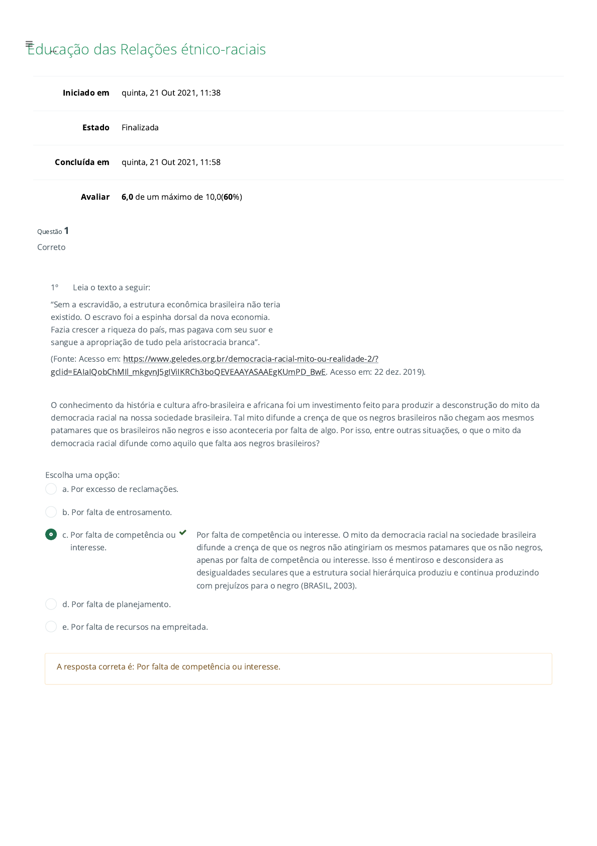 Educação das Relações étnico-raciais Iniciado em quinta, 21 Out 2021, 11:38 Estado Finalizada Concluída em quinta, 21 Out 2021, 11:58 Avaliar 6,0 de um máximo de 10,0(60%) Questão 1 Correto 1º Leia o texto a seguir: “Sem a escravidão, a estrutura econômica brasileira não teria existido. O escravo foi a espinha dorsal da nova economia. Fazia crescer a riqueza do país, mas pagava com seu suor e sangue a apropriação de tudo pela aristocracia branca”. (Fonte: Acesso em: https://www.geledes.org.br/democracia-racial-mito-ou-realidade-2/? gclid=EAIaIQobChMIl_mkgvnJ5gIViIKRCh3boQEVEAAYASAAEgKUmPD_BwE. Acesso em: 22 dez. 2019). O conhecimento da história e cultura afro-brasileira e africana foi um investimento feito para produzir a desconstrução do mito da democracia racial na nossa sociedade brasileira. Tal mito difunde a crença de que os negros brasileiros não chegam aos mesmos patamares que os brasileiros não negros e isso aconteceria por falta de algo. Por isso, entre outras situações, o que o mito da democracia racial difunde como aquilo que falta aos negros brasileiros? Escolha uma opção: a. Por excesso de reclamações. b. Por falta de entrosamento. c. Por falta de competência ou interesse. Por falta de competência ou interesse. O mito da democracia racial na sociedade brasileira difunde a crença de que os negros não atingiriam os mesmos patamares que os não negros, apenas por falta de competência ou interesse. Isso é mentiroso e desconsidera as desigualdades seculares que a estrutura social hierárquica produziu e continua produzindo com prejuízos para o negro (BRASIL, 2003). d. Por falta de planejamento. e. Por falta de recursos na empreitada. A resposta correta é: Por falta de competência ou interesse. https://www.geledes.org.br/democracia-racial-mito-ou-realidade-2/?gclid=EAIaIQobChMIl_mkgvnJ5gIViIKRCh3boQEVEAAYASAAEgKUmPD_BwE https://aula.fael.edu.br/ Questão 2 Incorreto Questão 3 Incorreto Os que trabalham na escola devem ir além da tolerância, do respeito às diferenças, com relação à identidade e diferença de cada aluno, e isso começa por procurar entender como são produzidas as identidades culturais. Nesse sentido, segundo Silva (2000), “A diversidade (...) pode ser um produto da natureza; o mesmo não se pode dizer da diversidade cultural. A diversidade cultural não é, nunca, um ponto de origem: ela é, em vez disso, o ponto �nal de um processo conduzido por operações de diferenciação”. O que a autora quis dizer com isso? Marque a alternativa correspondente: Escolha uma opção: a. A Diversidade Cultural e Biológica é vista como conceitos idênticos. b. A Diversidade Biológica é vista como um produto da natureza. c. A Diversidade Étnico-Cultural é entendida por natureza humana. d. A Diversidade Étnico-Biológica é relacionada à natureza da raça. e. A Diversidade Ético-Biológica pode ser vista como produto da natureza. A resposta correta é: A Diversidade Biológica é vista como um produto da natureza. Leia o texto a seguir e re�ita: “A cultura, sob todas as formas de arte, de amor e de pensamento, através dos séculos, capacitou o homem a ser menos escravizado.” (Fonte: http://www.diaadiaeducacao.pr.gov.br/portals/cadernospde/p debusca/producoes_pde/2014/2014_unespar- paranavai_hist_artigo_linda_salete_mondo_pacheco.pdf. Acesso em: 29 dez. 2019). Analise o contexto e responda à questão: Em uma palavra, ela pode ser pensada como uma grande escola, onde é possível aprender como é que a vida em sociedade ocorre, bem como os seus con�itos, valores e até suas possibilidades de sociabilidade e interação (PESSOA, 2007). De quem exatamente estamos falando? Escolha uma opção: a. Catequese. b. Igreja. c. Família. d. Colônia. e. Festa. A resposta correta é: Festa. http://www.diaadiaeducacao.pr.gov.br/portals/cadernospde/p https://aula.fael.edu.br/ Questão 4 Correto Questão 5 Correto Leia o texto a seguir e re�ita: “Para a primeira mulher negra, pobre e com pouca instrução que dedicou sua vida aos �lhos e as letras? Isso porque nem menciono a Maria Firmina dois Reis com a magní�ca obra Úrsula, essa ainda é menos conhecida. É que sobre os malefícios da modernidade tão pulsantes e latentes são contigo mesmo.” (Fonte: https://www.geledes.org.br/um-dialogo- com-carolina-maria- de-jesus/. Acesso em: 28 dez. 2019). De acordo com o contexto narrado, bem como com os estudos propostos, em uma palavra, ela foi uma escritora vigorosa. Deixou- nos as seguintes obras: Quarto de Despejo – Diário de uma favelada, Casa de Alvenaria, Pedaços de fome e Provérbios, Diário de Bitita e Meu sonho é escrever – Contos inéditos e outros escritos. De quem exatamente estamos falando? Escolha uma opção: a. Carlota Evaristo dos Santos. b. Maria Beatriz da Silva. c. Maria Beatriz Nascimento. d. Carolina Maria de Jesus. Carolina Maria de Jesus escreveu todas estas obras: Quarto de Despejo – Diário de uma favelada, Casa de Alvenaria, Pedaços de fome e Provérbios, Diário de Bitita e Meu sonho é escrever – Contos inéditos e outros escritos. e. Conceição Evaristo. A resposta correta é: Carolina Maria de Jesus. Leia o seguinte texto a seguir e re�ita: “O afastamento da sociedade contemporânea das propostas políticas de bem-estar proporciona situações de vulnerabilidade social que fragilizam a sociedade. Este tipo de vulnerabilidade provoca a exclusão social (CASTELLS, 1998; LOPES, 2006; PROENÇA, 2005). Kowarick (2003, p. 69) defende que o combate às situações de vulnerabilidade é uma função essencial do Estado, sendo os programas de intervenções intitulados de inclusão social.” (Fonte: http://www.scielo.br/pdf/sssoc/n106/n106a03.pdf. Acesso em: 29 dez. 2019). Ante o exposto, analise a proposição: Para Jodelet (1999), o seguinte conceito: “é produto de duplo processo de construção e de exclusão social que, indissoluvelmente ligados como os dois lados de uma f