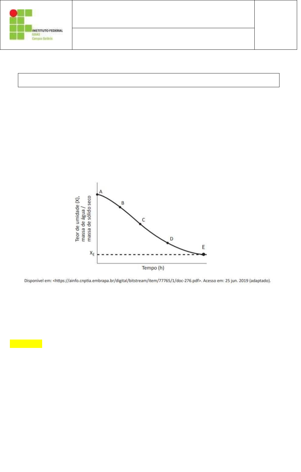 Ministério da Educação Instituto Federal de Goiás Cãmpus Goiânia Departamento de Áreas Acadêmicas 2 Pág. 1 Operações Unitárias II Questão 1 Lista 5 de Operações Unitárias 2 – Pâmella Andrade A secagem foi um dos primeiros métodos de conservação de alimentos utilizados pela humanidade. Por se tratar de um processo complexo, a natureza do alimento, suas propriedades físicas e sua relação com os fenômenos de transferência de calor e de massa devem ser levados em consideração no dimensionamento de secadores industriais. A figura a seguir representa uma curva típica de secagem de um determinado alimento (kg de água retirada em função do tempo). Com base na figura e nas informações apresentadas, faça o que se pede nos itens a seguir. a) Identifique os períodos A, B, C, D e E e explique o que ocorre em cada um deles. Resposta: - O segmento AB é o período em regime não permanente, durante o qual a temperatura do sólido atinge o seu valor de regime permanente. A temperatura do alimento irá começa a diminuir visando alcançar um período constante que é definido como o ponto de adaptação do alimentos as temperaturas envolvendo o processo de secagem. - No segmento BC a taxa de mudança encontra-se constante, o que reflete que a temperatura do alimento econtra-se igual a temperatura do processo de secagem. - No segmento CD indica o fim do período de secagem constante e o ínicio do aumento significativo da umidade. - Segmento DE: etapa final onde a umidade do alimento visa alcançar o equilíbrio entre as condições do ambiente. Ministério da Educação Instituto Federal de Goiás Cãmpus Goiânia Departamento de Áreas Acadêmicas 2 Pág. 2 Operações Unitárias II Questão 2 b) Apresente e justifique pelo menos dois fatores que podem alterar o comportamento de uma curva típica de secagem de alimentos. Resposta: 1. Temperatura do ar pode ser considerado um dos fatores, pois este influencia diretamente o processo de secagem podendo refletir em uma queda significativa de tempo. 2. Tamanho do alimento pode ser considerado outro fator, pois quando mais massa maior o gasto energético o que pode refletir em um aumento significativo de tempo. Um secador rotativo, não isolado, operando em contracorrente com ar quente é utilizado para secar sulfato de amônia de 3,5 % a 0,2 % de umidade em base úmida. O secador tem 1,2 m de diâmetro e 6,7 m de comprimento. Ar atmosférico a 25 oC e com 50 % de umidade porcentual será aquecido pela passagem sobre serpentina com vapor, até 90 oC antes de entrar no secador e espera-se que saia do equipamento de secagem a 32 oC. O sólido entrará a 25 oC e espera-se que seja descarregado a 60 oC. O produto será obtido a uma vazão de 900 kg/h de material úmido. Estimar a quantidade de ar necessária e a quantidade de vapor de água utilizada no aquecimento do ar (vapor disponível a 0,90 kgf/cm2). Considere: perdas de calor para o ambiente como 11000 W, ∆HA desprezível, calor específico do sólido (csol) = 1507 J/kg K.