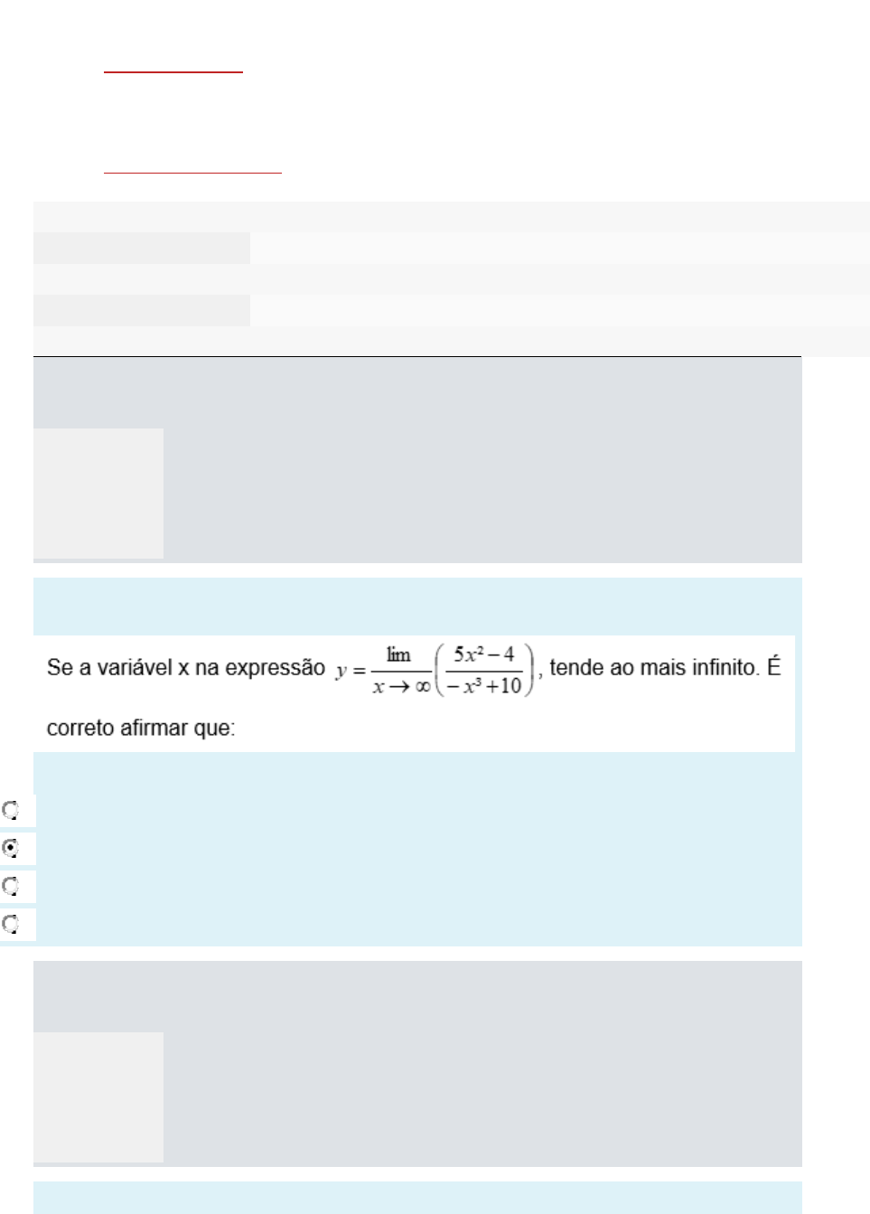 1. AVALIAÇÕES 2. QUESTIONÁRIO 1 Iniciado em Saturday, 23 Oct 2021, 10:54 Estado Finalizada Concluída em Saturday, 23 Oct 2021, 11:00 Tempo empregado 6 minutos 3 segundos Avaliar 20,00 de um máximo de 20,00(100%) Parte superior do formulário Questão 1 Completo Atingiu 2,00 de 2,00 Marcar questão Texto da questão Escolha uma opção: a. tende a 5 b. Tende a zero c. y tende a menos infinito d. y tende a mais infinito Questão 2 Completo Atingiu 2,00 de 2,00 Marcar questão Texto da questão Escolha uma opção: a. b. c. d. Questão 3 Completo Atingiu 2,00 de 2,00 Marcar questão Texto da questão Escolha uma opção: a. b. c. d. Questão 4 Completo Atingiu 2,00 de 2,00 Marcar questão Texto da questão O discriminante de uma função do segundo grau, corresponde aos termos que se encontram dentro do radical da formula de Bháskara. A respeito do estudo dos sinais de uma função do segundo grau, é possível afirmar, com certeza, que: Escolha uma opção: a. O valor do discriminante não pode ser usado para determinar a quantidade de raízes reais que uma função do segundo grau possui. b. Se o valor do discriminante for igual a zero e o coeficiente a for positivo, então todos os pontos dessa função estarão acima do eixo x, exceto pelo vértice que estará sobre esse eixo. c. Se o valor do discriminante for menor que zero, a função possui duas raízes reais e distintas e outras duas raízes complexas. d. Se o valor do discriminante for igual a zero e o coeficiente a for positivo, então todos os pontos dessa função do segundo grau estarão sob o eixo x. Questão 5 Completo Atingiu 2,00 de 2,00 Marcar questão Texto da questão Escolha uma opção: a. 23 b. 0 c. -32 d. 32 Questão 6 Completo Atingiu 2,00 de 2,00 Marcar questão Texto da questão A função do primeiro grau definida por f (x) = (3 – 2a).x + 2, será crescente quando o valor do termo definido por a na equação for: Escolha uma opção: a. a > 0 b. a < 3/2 c. a > 3/2 d. a = 3/2 Questão 7 Completo Atingiu 2,00 de 2,00 Marcar questão Texto da questão Escolha uma opção: a. b. c. d. Questão 8 Completo Atingiu 2,00 de 2,00 Marcar questão Texto da questão Escolha uma opção: a. – 2,5 b. 3,0 c. – 3,0 d. 2,5 Questão 9 Completo Atingiu 2,00 de 2,00 Marcar questão Texto da questão Escolha uma opção: a. b. c. d. Questão 10 Completo Atingiu 2,00 de 2,00 Marcar questão Texto da questão Escolha uma opção: a. f(x) é crescente e g(x) é decrescente. b. f [g(0)] = f(0) c. Os gráficos de f(x) e g(x) não se interceptam. d. g(– 2) . f(– 1) = f(1) Parte inferior do formulário