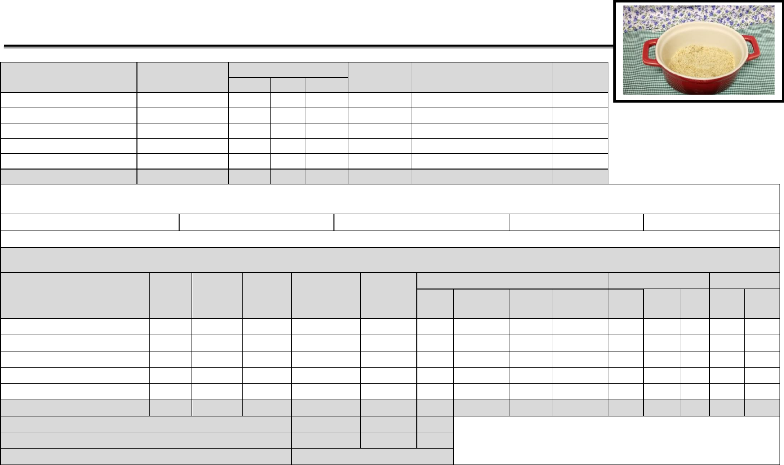 @nutribyancacarneiro FICHA TÉCNICA DE EXECUÇÃO Preparação: Farofa Classificação: Guarnição Nº de porções: 20 Ingredientes Descrição do PL Per Capita Quantidade Total Medida Caseira Custo Total (R$) PL FC PB Cebola branca Condimento 5,15 g 1,09 5,61g 113 g 1 unidade media R$ 0,26 Farinha de mandioca Sugerido 25,00 g - 25,00 g 500 g 3 + ½ xícara de chá R$ 3,00 Óleo de soja Sugerido 6,00 g - 6,00 g 120 g ½ xícara de chá R$ 0,40 Pimenta do reino em pó Condimento seco 0,10 g - 0,10g 2,30 g 1 colher de sobremesa rasa R$ 0,22 Sal refinado Farofa 0,25 g - 0,25g 5,00 g 1 colher de chá cheia R$ 0,01 Somatório - 36,50 g - - - - R$ 3,89 Modo de preparo: Refogar a cebola em óleo. Acrescentar o sal e a pimenta. Incorporar a farinha de mandioca aos poucos e mexer bem a mistura, até dourar a farofa. Tempo de preparo: 40 minutos Rendimento total: 597 g Rendimento per capita: 30 g Fator de cocção: 1,22 Custo per capita: R$ 0,19 Porção média (em gramas e medida caseira): 30 g (uma colher de servir rasa) VALOR NUTRITIVO Alimento PL (g/mL) Energia (Kcal) Fibras (g) Carboidratos (g) Proteínas (g) Lipídeos Minerais Vitaminas Totais (g) Saturados (g) Trans (g) Colesterol (mg) Ca (mg) Na (mg) Fe (mg) A (RAE) C (mg) Cebola, crua1 5,15 2,03 0,11 0,46 0,09 0,00 0,00 0,00 0,00 0,72 0,03 0,01 0,00 0,24 Farinha, de mandioca, crua1 25,00 90,22 1,60 21,97 0,39 0,07 0,03 0,00 0,00 16,22 0,26 0,27 0,00 0,00 Óleo, de soja1 6,00 53,04 0,00 0,00 0,00 6,00 0,91 0,03 0,00 0,00 0,00 0,00 0,00 0,00 Pimenta do reino em pó3 0,10 0,26 0,03 0,06 0,01 0,00 0,00 0,00 0,00 0,44 0,04 0,03 0,00 0,00 Sal refinado3 0,25 0,00 0,00 0,00 0,00 0,00 0,00 0,00 0,00 0,06 96,90 0,00 0,00 0,00 Total 36,50 145 1,74 22,50 0,49 6,08 0,94 0,03 0,00 17,44 97,23 0,31 0,00 0,24 Fator de Atwater x4 x4 x9 1Alimentos com valor nutricional adquirido através da Tabela Brasileira de Composição de Alimentos-TACO, UNICAMP; Total de Kcal por nutriente 89,98 1,96 54,69 VCT (Kcal) 147 @nutribyancacarneiro 2Alimentos com valor nutricional adquirido através da Tabela IBGE (2011); 3Alimentos com valor nutricional adquirido através da Tabela de Composição de Alimentos: suporte para decisão nutricional, PHILIPPI, Sônia Tucunduva. CÁLCULOS FATORES DE CORREÇÃO Cebola → FC = QTB/QTL → FC = 113/103 → FC = 1,09 FATOR DE COCÇÃO Fcç = Rendimento/∑PL x Nº de porções Fcç = 597/∑36,50 x 20 Fcç = 2244/2240 → Fcç = 1,22