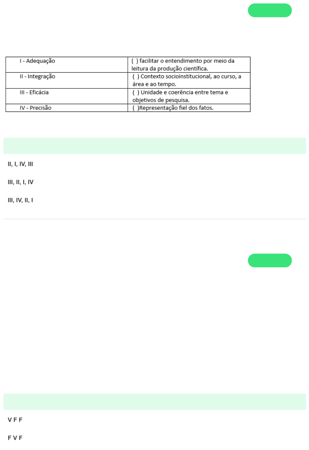 Ocultar opções de resposta Ocultar opções de resposta Pergunta 1 -- /2 Associe a segunda coluna de acordo com a primeira, levando em consideração as características recomendáveis para a produção científica a ser utilizada na monografia e assinale a alternativa que possui a sequência correta Resposta corretaIII, I, II, IV II, I, IV, III III, II, I, IV III, IV, II, I Pergunta 2 -- /2 Sobre o artigo científico, assinale a alternativa compatível com as proposições: I)O artigo científico tem os mesmos elementos textuais e pré-textuais de uma monografia. II)O objetivo do artigo técnico é sintetizar análises oriundas de experimentos e resultados de pesquisas. III)Pode ser considerado um trabalho de conclusão de curso. Resposta corretaF V V V F F F V F Ocultar opções de resposta Ocultar opções de resposta F F V Pergunta 3 -- /2 Com relação a questão de plágios em pesquisa, é incorreto afirmar: É possível lançar mão de recursos de citações, a fim de referenciar autores externos a sua produção científica. Resposta correta As ferramentas de busca do “google” são a única forma de constatar cópias de fragmentos já escritos. Os textos apresentados em monografia devem ser originais. Não é permitida cópia parcial ou integral de outros textos sem a devida referência. Pergunta 4 -- /2 Quanto as definições para os elementos textuais de um trabalho científico, é correto afirmar: A justificativa é um elemento obrigatório e com numeração de página; A (s) hipótese (s) é um elemento obrigatório num trabalho monográfico. Resposta correta A apresentação da monografia em capítulos é um elemento obrigatório de um trabalho científico. Os objetivos específicos são elementos opcionais. Ocultar opções de resposta Pergunta 5 -- /2 Quanto ao Trabalho de Conclusão de Curso (TCC), assinale a alternativa incorreta: Um trabalho de conclusão de curso poderá ser desenvolvido no formato de protótipos. Um TCC consiste em uma pesquisa individual, abrangendo a área de conhecimento do curso. Resposta correta O TCC não integra o projeto pedagógico de um curso, mas é fundamental para se aplicar os conhecimentos obtidos no curso. Um TCC poderá ser desenvolvido no formato de artigo científico.