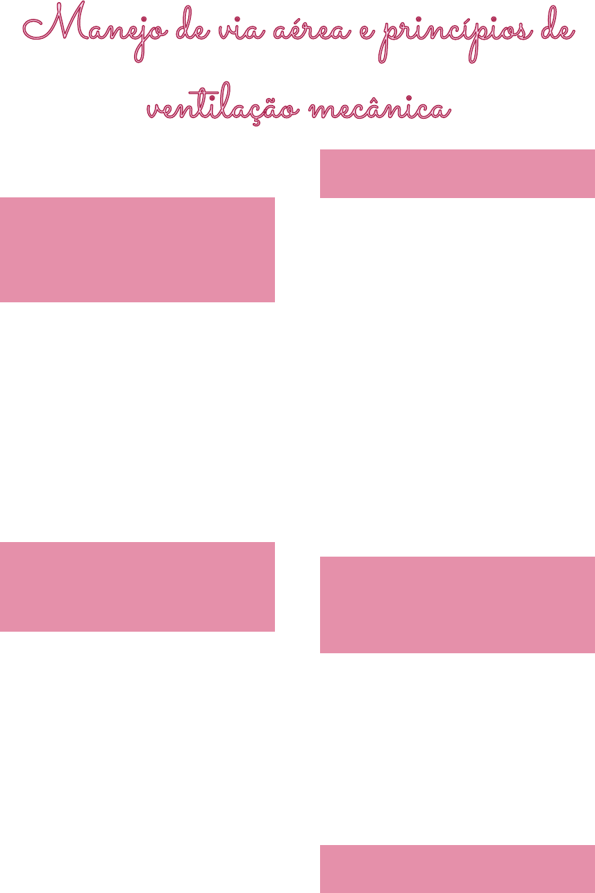 Página 1 Aula 3 - Técnicas Cirurgicas Isabelle L. / 4º bimestre Manuseio de via aérea = pedir ajuda Ideal: 3 pessoas Principais causas de complicações Falha na oxigenação Dificuldade ou impossibilidade de ventilar Dificuldade ou impossibilidade de intubar Falha no reconhecimento de intubação esofágica Não agir em tempo hábil Não conhecimento dos dispositivos de urgência Desobstrução de via aérea e oxigenação Corpo estranho em via aérea Manobras para permeabilizar a via aérea Elevação do mento (Chin lift) Elevação da mandibula (Jaw thrust) Cânulas oro e nasofarígea → se o paciente estiver consciente paciente tem náusea. Só coloca nasofaringea se o paciente estiver acordada Suplementação de oxigênio (mascara ou cateter) Ventilação sob mascara Primeiro recurso disponível Mascara deve ter tamanho adequado Posicionamento correto → suspeita LRM? Técnica adequada Ventilação a 2 ou 4 mãos (formando um C com a mão) Realizar jaw thrust durante ventilação Otimizar com canula de guedel Frequência de ventilação o 30/2 (30 massagens para 2 ambus) o 10 por minuto Sinais de ventilação sob mascara difícil Presença de 2 ou mais: o História de ronco ou apneia do sono o Índice de massa corpórea > 26 o Presença de barba o Ausência de dentes o Idade > 55ª Intubação oro-traqueal Quando intubar? Página 2 Aula 3 - Técnicas Cirurgicas Isabelle L. / 4º bimestre Há falta de manutenção ou de proteção da via aérea? Há falta de ventilação? Há falta de oxigenação? Antecipar falha nos itens anteriores (evolução clínica) Checar material (laringoscópio, tubo, ambu, canula de guedel) Checar alternativas Pré-oxigenar Tentativa de ótima intubação Evitar laringoscopias múltipla Tentativa de ótima intubação Profissional experiente → treino Tônus muscular insignificante Pressão laríngea externa → B.U.R.P. Adequado tamanho de lâmina Ótima posição da cabeça → sniff position Tamanho tubo: o Adultos mulheres 7,0 - 7,5 o Adultos homens 8,0 - 8,5 o Pressão cuff: 25 cmH20 Sniff position – Posição do Cheirador Alinhamento dos eixos: o Oral o Faríngeo o Laríngeo Tamanho, tipo e posicionamento de lâmina Lamina reta (Miller) → vê a epiglote, levanta a epiglote com a ponta da lamina (principal em crianças) Lamina curva (Macintosh) → lamina curva é inserida na valécula (entre a epiglote e a língua) Manobra BURP Back up right position → cartilagem cricoide, pressão para trás para Página 3 Aula 3 - Técnicas Cirurgicas Isabelle L. / 4º bimestre cima e para a direita do paciente → traqueia entra no campo de visão O que queremos ver? Critérios para intubação dificil Mallampatti Mobilidade cervical Distância tiro-mento - 6cm Abertura bucal - 3cm Retro/ prognatismo Protrusão da mandíbula Obesidade Dentição Classificação Cormack- Lehanne A classificação de Cormack e Lehane é utilizada para descrever o grau de visualização glótica sob laringoscopia direta Grau I: glote bem visível; Grau II: somente a parte posterior da glote é visualizada; Grau III: somente a epiglote pode ser visualizada nenhuma porção da glote é visível; Esôfago Aritenoides Cordas vocais Epiglote Página 4 Aula 3 - Técnicas Cirurgicas Isabelle L. / 4º bimestre Grau IV: nem a epiglote, nem a glote podem ser visualizadas. Bougie Indicado em situações com visualização parcial da traqueia ou aritenóides e dificuldade de direcionamento do tudo endotraqueal Usado em IIb ou III de cormack Características: o Ponta arredondada (atraumatica) o Curvatura na ponta (direcionamento e sensibilidade) Tentativa de intubação x efeito adverso Tentar apenas 2 tentativas de laringoscopia Dispositivos supra-glóticos Podem ser utilizados como primeira escolha ou para resgate após falha de ventilação ou intubação!!! Não caracterizam via aérea definitiva Proteção de bronco aspiração ??? Fácil manipulação Inserção não demanda interrupção das massagens cardíacas Máscara laríngea Tubo laríngea Fast track Cricotireoidostomia – Via aérea cirúrgica de emergência “Não intubo/não ventilo” Representa última alternativa contra hipoxemia, não devendo ser evitada nem postergada nessa situação!!! Contra indicações absolutas: Transecção traqueal e trauma laríngeo Contra indicações relativas: incapacidade de palpação, massa cervical, glandula tireóide volumosa. Artéria inominada em posição alta e coagulopatia não corrigida Três técnicas: o Dilatação percutânea por punção direta o Punção direta com fio guia (Técnica de Seldinger) o Acesso cirúrgico Página 5 Aula 3 - Técnicas Cirurgicas Isabelle L. / 4º bimestre Cricotireoidostomia de urgência Continua oferta de oxigênio Extensão cervical Bloqueio neuromuscular S/N Bisturi n. 10 Identificação da membrana cricotireoidiana pela palpação cervical Incisão transversal da pele e membrana Rotação da lamina de bisturi em 90 graus na membrana Inserção de guia (Bougie) Introdução do tubo traqueal 6,0 ou material próprio de crico guiado pelo bougie Ventilação, insuflação do balonete e checagem (capnografia/ausculta) Fixação Confirmação de intubação de traqueia Ausculta pulmonar bilateral (inicia- se no estomago Capnografia Saída de vapor no tubo Visão direta Sedação para manejo de via aérea Observar fatores de risco para via aérea difícil Checar material previamente Pré-oxigenar Medicações sedativas são depressoras do sistema cardiovascular Sedativos o Midazolan (benzodiazepínico) o Propofol (Agonista GABA) 1,5-2,5mg/kg o Ketamin (Antagonista NMDA) 1-2 mg/kg Analgésicos o Fentanyl (opiólde) 2-5 mcg/kg Bloqueadores neuromusculares o Succinilcolina (bloqueador despolarizante) 1mg/kg o Atracúrio (bloqueador adespolarizante) 0,4 mg/kg Ventilação mecânica Controlada a pressão Controlada a volume Página 6 Aula 3 - Técnicas Cirurgicas Isabelle L. / 4º bimestre Assistido controlado (SIMV) Pressão de suporte Volume cor