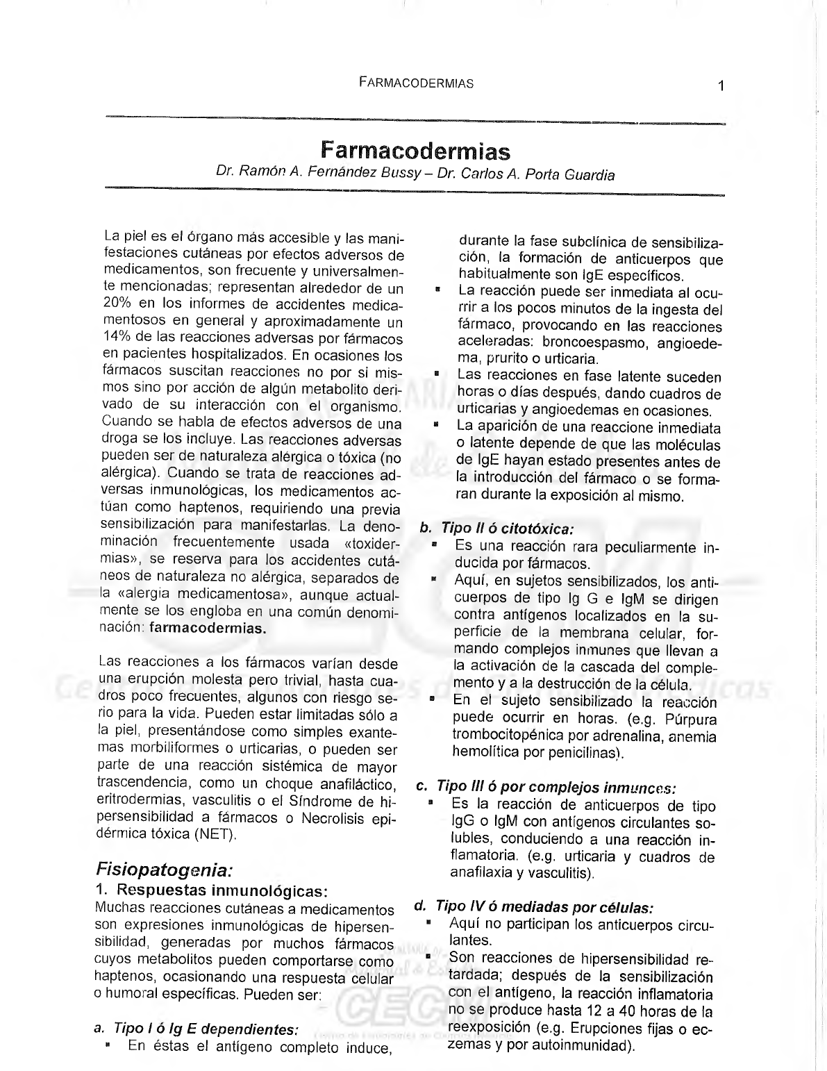 Farmacodermias 1 Farmacodermias Dr. Ramon A. Fernandez Bussy- Dr. Carlos A. Porta Guardia La piel es ei organo mas accesible y !as mani- festaciones cutaneas por efectos adversos de medicamentos, son frecuente y universalmen- te mencionadas; representan alrededor de un 20% en los informes de accidentes medica- mentosos en general y aproximadamente un 14% de las reacciones adversas porfarmacos en pacientes hospitalizados. En ocasiones los farmacos suscitan reacciones no por si mis- mos sino por accion de algun metabolito deri- vado de su interaccion con el organismo. Cuando se habla de efectos adversos de una droga se los incluye. Las reacciones adversas pueden ser de naturaleza alergica o toxica (no alergica). Cuando se trata de reacciones ad versas inmunologicas, los medicamentos ac- tuan como haptenos, requiriendo una previa sensibilizacion para manifestarlas. La deno- minacion frecuentemente usada «toxider- mias», se reserva para los accidentes cuta- neos de naturaleza no alergica, separados de la «alergia medicamentosa», aunque actual- mente se los engloba en una comun denomi- nacion: farmacodermias. Las reacciones a los farmacos varian desde una erupcion molesta pero trivial, hasta cua- dros poco frecuentes, algunos con riesgo se- rio para la vida. Pueden estar limitadas solo a la piel, presentandose como simples exante- mas morbiliformes o urticarias, o pueden ser parte de una reaccion sistemica de mayor trascendencia, como un choque anafilactico, eritrodermias, vasculitis o el Sindrome de hi- persensibilidad a farmacos o Necrolisis epi- dermica toxica (NET). Fisiopatogenia: 1. Respuestas inmunologicas: Muchas reacciones cutaneas a medicamentos son expresiones inmunologicas de hipersen- sibilidad, generadas por muchos farmacos cuyos metabolitos pueden comportarse como haptenos, ocasionando una respuesta celular o humoral especificas. Pueden ser: a. Tipo I o lg E dependientes: . * En estas el antigeno completo induce, durante la fase subclinica de sensibiliza cion, la formacion de anticuerpos que habitualmente son IgE especificos. ■ La reaccion puede ser inmediata al ocu- rrir a los pocos minutos de la ingesta del farmaco, provocando en las reacciones aceleradas: broncoespasmo, angioede- ma, prurito o urticaria. ■ Las reacciones en fase latente suceden horas o dfas despues, dando cuadros de urticarias y angioedemas en ocasiones. ■ La aparicion de una reaccione inmediata o latente depende de que las moleculas de IgE hayan estado presentes antes de la introduccion del farmaco o se forma- ran durante la exposicion al mismo. b. Tipo I I 6 citotoxica: ■ Es una reaccion rara peculiarmente in- ducida porfarmacos. ■ Aqui, en sujetos sensibilizados, los anti cuerpos de tipo lg G e IgM se dirigen contra antigenos localizados en la su- perficie de la membrana celular, for- mando complejos inmunes que llevan a la activacion de la cascada del comple- mento y a ladestruccion d e la celula. ■ En el sujeto sensibilizado la reaccion puede ocurrir en horas. (e.g. Purpura trombocitopenica por adrenalina, anemia hemolftica por penicilinas). c. Tipo III 6 por complejos inmunces: • Es la reaccion de anticuerpos de tipo IgG o IgM con antigenos circulantes so lubles, conduciendo a una reaccion in- flamatoria. (e.g. urticaria y cuadros de anafilaxia y vasculitis). d. Tipo IV 6 mediadas por celulas: ■ Aqui no participan los anticuerpos circu lantes. ■ Son reacciones de hipersensibilidad re- tardada; despues de la sensibilizacion con el antigeno, la reaccion inflamatoria no se produce hasta 12 a 40 horas de la reexposicion (e.g. Erupciones fijas o ec- zema s y por autoinmunidad). PC Resaltado PC Resaltado PC Nota adhesiva PC Resaltado PC Resaltado PC Resaltado PC Resaltado PC Resaltado PC Resaltado PC Resaltado PC Resaltado PC Resaltado PC Resaltado PC Resaltado PC Resaltado PC Resaltado PC Resaltado 2 Farmacodermias 2. Mecanisrnos no inmunologicos: Entre ellos se encuentran el efecto farmaco- logico colateral, el efecto parafarmacologico y la exacerbacion de una dermatosis preexis- tente. Ademas existen otros mecanisrnos que incluyen a las reacciones por dosis excesiva, intolerancia, toxicidad acumulativa, reaccion de Jarisch-Herxheimer y «reaccion inmunita- ria like». Tambien existen las interacciones medica- mentosas adversas (ADI) que son reacciones farmacologicas no deseadas ni esperadas, por la administracion simultanea de 2 o mas drogas cuyos mecanisrnos de accion difieren; se las clasifica en farmacocineticas (por alte- raciones en la absorcion, distribucion, meta- bolismo o eliminacion de algunos de los far- macos) y farmacodinamicas (por efectos far- macologicos o aditivos antagonistas). Consideremos que otros factores, afectan los mecanisrnos previamente referidos, dentro de los cuales se encuentran: ■ La reduccion de la absorcion a nivel gastrointestinal (por alteraciones de pH, motilidad, formacion de complejos o quelatos insolubles). “ Anomalias en la eliminacion del medi- camento (inadecuado vaciamiento gas- trico y circulacion enterohepatica, esti- mulacion o inhibition de enzimas hepa- ticas y tasa de metabolizacion del far- maco, alteraciones renales). ■ Variaciones en las concentraciones seri- cas de albumina, lipoproteinas y trans- cortina. ■ Como parte de la accion de la propia droga. Clasificacion clmica de las far macodermias: Se pueden clasificar en: ■ Erupciones cutaneas maculopapulosas, exantematicas y exfoliativas. ■ Eritrodermia medicamentosa. ■ Urticaria y angioedema medicamentoso ■ Erupciones cutaneas medicamentosas fotoalergicas y fototoxicas ■ Erupciones liquenoides o liquen rojo piano ■ Pigmentaciones cutaneas ■ Erupciones cutaneas ampollares ■ Erupciones medicamentosas pustulosas y acneiformes ■ Eritema fijo medicamentoso ■ Eritema polimorfo mayor: Smdrome de Stevens Johnson y Necrolisis epidermi- ca toxica o Enfermedad de Lyell ■ Dermatitis de contacto por medica- mentos topicos ■ Lupus Eritematoso medicamentoso ■ Pur