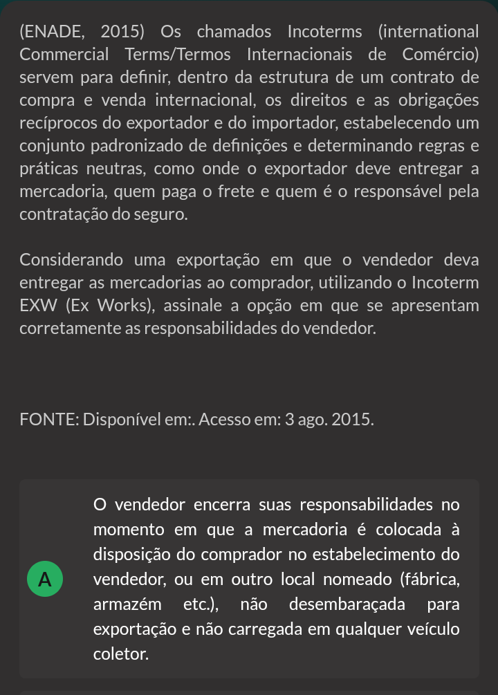 Os chamados Incoterms (international Commercial Terms/Termos Internacionais de Comércio) servem para definir, dentro da estrutura de um contrato de compra e venda internacional, os direitos e as obrigações recíprocos do exportador e do importador, estabelecendo um conjunto padronizado de definições e determinando regras e práticas neutras, como onde o exportador deve entregar a mercadoria, quem paga o frete e quem é o responsável pela contratação do seguro. Considerando uma exportação em que vendedor deva entregar as mercadorias ao comprador, utilizando o Incoterm EXW (Ex Works), assinale a opção em que se apresentam corretamente as responsabilidades do vendedor. O vendedor encerra suas responsabilidades no momento em que a mercadoria é colocada à disposição do comprador no estabelecimento do vendedor, ou em outro local nomeado (fábrica, armazém etc.), não desembaraçada para exportação e não carregada em qualquer veículo coletor.