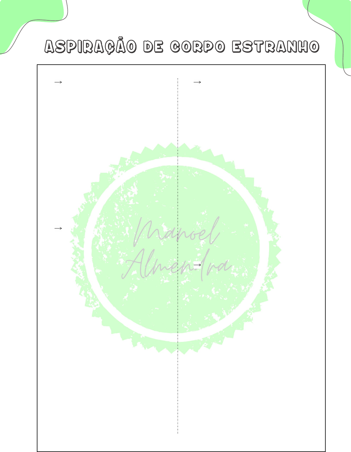 Manoel Almendra ETIOLOGIA: A Aspiração de corpo estranho (ACE) é definida como o ato de aspirar ou inalar um corpo estranho para dentro do trato respiratório. Isso ocorre principalmente na fase pediátrica, onde as crianças põem objetos na boca, podendo ocorrer uma obstrução completa, levando a sinais e sintomas associados à hipóxia, ou conforme o nível de obstrução. (LIMA, BARROS e MAIA, 2021) FATORES DE RISCO: Os fatores socioculturais dos cuidadores, como condições de moradia, nível de escolaridade, renda familiar e o grau de vigilância sobre as crianças geralmente estão relacionados com a ocorrência dos eventos. Isso ocorre pois, de maneira indireta, eles influenciam sobre o ambiente e os hábitos alimentares da criança. Além disso, as crianças mais acometidas possuem aspectos fisiológicos que as tornam mais propensas à ACE, como frequência respiratória aumentada, imaturidade no mecanismo de mastigação e deglutição, reflexo de fechamento da laringe e tosse ineficazes. (SOARES et al., 2020) MANIFESTAÇÕES CLÍNICAS: Quando o corpo estranho impacta na laringe pode causar cianose e hipóxia, com evolução rápida para insuficiência respiratória e óbito. Em casos de obstrução parcial da laringe os pacientes podem apresentar disfonia, estridor, rouquidão ou tosse. Um corpo estranho na traqueia pode se manifestar com disfonia, disfagia, tosse seca ou estridor. Se a obstrução ocorre abaixo das cordas vocais a sintomatologia pode ser variada com sintomas inespecíficos como tosse, sibilância ou estridor, taquipneia e afonia. (SOARES et al., 2020) DIAGNÓSTICO: A radiografia de tórax é na maioria das vezes o primeiro exame de imagem a ser realizado. Porém, uma radiografia normal não afasta a hipótese de aspiração de CE. Os achados mais comumente encontrados são atelectasia e hiperinsuflação. (DA ROCHA et al, 2019). A tomografia computadorizada pode ser usada naqueles pacientes com história duvidosa ou com sinais e sintomas prolongados, com o objetivo de identificar sequelas pulmonares devidas à corpos estranhos de longa duração. (SOARES et al, 2020) Manoel Almendra DIAGNÓSTICO DIFERENCIAL: Os diagnósticos diferenciais de aspiração de corpo estranho são: crupe viral, edema angioneurótico, traqueíte bacteriana, abscesso retrofaríngeo ou peritonsilar, mononucleose infecciosa, traqueíte bacteriana e supraglotite infecciosa (WAKSMAN et al, 2005) COMPLICAÇÕES: Tem-se como complicações: pneumonias de repetição, abscesso pulmonar, bronquiectasias, degeneração do parênquima pulmonar, pneumotórax, hemotórax, fístula bronco pleural e até deficiência pôndero-estatural1. (SOARES et al, 2020) TRATAMENTO: 1) Avaliar a severidade: a) Obstrução leve: Paciente capaz de responder se está engasgado. Consegue tossir, falar e respirar. b) Obstrução grave: Paciente consciente e que não consegue falar. Pode não respirar ou apresentar respiração ruidosa, tosse silenciosa e/ou inconsciência. 2) Considerar abordagem específica. a) Obstrução leve em paciente responsivo: Não realizar manobras de desobstrução (não interferir); Acalmar o paciente; Incentivar tosse vigorosa; Monitorar e suporte de O2, se necessário; Observar atenta e constantemente; b) Obstrução grave em paciente responsivo - executar a manobra de heimlich; e repetir até a desobstrução ou o paciente tornar- se não responsivo. c) obstrução grave em paciente irresponsivo: diante de irresponsividade e ausência de respiração com pulso, executar compressões torácicas com objetivo de remoção do corpo estranho; abrir vias aéreas, visualizar a cavidade oral e remover o corpo estranho, se visível e alcançável (com dedos ou pinça); se nada encontrado, realizar 1 insuflação e se o ar não passar ou o tórax não expandir, reposicionar a cabeça e insuflar novamente; e considerar o transporte imediato mantendo as manobras básicas de desobstrução. (BRASIL, 2016) Manoel Almendra REFERÊNCIAS: 1) BRASIL. Ministério da Saúde. Secretaria de Atenção à Saúde. Protocolos de Intervenção para o SAMU 192 - Serviço de Atendimento Móvel de Urgência. Brasília: Ministério da Saúde, 2016. 2) DA ROCHA, Caroline Cunha et al. Aspiração de corpo estranho em pediatria: uma emergência–relato de caso. Revista Eletrônica Acervo Saúde, n. 19, p. e312- e312, 2019. 3) DE BRITO LIMA, Maria Cristina; REZENDE DE BARROS, Elessandra; DOS SANTOS MAIA, Luiz Faustino. OBSTRUÇÃO DE VIAS AÉREAS POR CORPO ESTRANHO EM CRIANÇAS: ATUAÇÃO DO ENFERMEIRO. Revista Científica de Enfermagem- RECIEN, v. 11, n. 34, 2021. 4) PASADAS, Marta Zamora et al. OBSTRUCCIÓN DE LA VÍA AÉREA POR UN CUERPO EXTRAÑO (OVACE). Revista Infancia y Salud, v. 3, n. 1, p. 9-9, 2021. 5) SOARES, Blenda Avelino et al. Aspiração de corpo estranho em crianças: avaliação do conhecimento de pais e cuidadores. 6) SOARES, Felippe Flausino et al. Aspiração de corpo estranho de vias aéreas em crianças: fatores associados e complicações em uma série histórica. 2020.