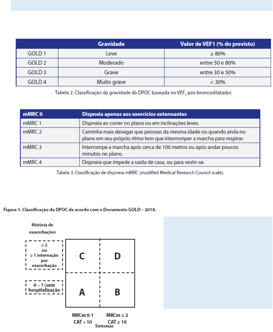 TRATAMENTO FARMACOLOGICO DA DPOC: Dependerá da classificação de gravidade, dos sintomas apresentados e do histórico de exacerbações nos últimos 12 meses: GRUPO A : poucos sintomas e baixo risco de exacerbações GRUPO B: mais sintomas e baixo risco de exacerbações GRPO C: poucos sintomas e maior risco de exacerbações GRUPO D: mais sintomas e maior risco de exarcebações Obs: baixo risco de exacerbações: quando não tem exacerbações ou só uma sem necessidade de internar alto risco de exacerbações: 2 ou mais exacerbações ou 1 ou mais exacerbações que precisou de internação poucos sintomas: escala de mMRC de 0 a 1 mais sintomas: escala de mMRC igual ou maior que 2 EXEMPLO: Se existirem dois pacientes com VEF1 30%, mMRC 2, porem o primeiro nunca apresentou exacerbações e, o segundo, internou recentemente por exacerbação, classifica-se: o primeiro como GOLD 4 grupo B e o segundo GOLD 4 grupo D, determinando diferenças em seus tratamentos. ESTRATIFICAÇÃO DO TRATAMENTO FARMACOLÓGICO DE ACORDO COM O PERFIL DOS PACIENTES: GRUPO A: Broncodilatadores de curta ação apenas para alívio. Uso isolado de SABA (beta-2- agonista de curta ação) ou SAMA (anticolinérgico de curta ação) – ou os dois associados Exemplo: sabultamol, 200 mcg de 4h/4h, spray (SABA) GRUPO B: LABA (beta-2-agonista de longa ação) ou LAMA (anticolinérgico de longa ação) – ou os dois associados caso não haja melhora. Exemplo: salmeterol 25 mcg 12h/12h aerolizer (LABA) GRUPO C: LAMA isolado ou associação de LABA com um ICS (corticoesteroide) – (caso não melhore trocar para LAMA + LABA ou associar a terapia tripla com LAMA+LABA+ICS.) Exemplo: formoterol 6 mcg associado à budesonida 12 mcg, a cada 12h/12h, inalador dosimetrado. GRUPO D: LAMA + LABA ou LABA + ICS ou LAMA isolado – ou terapia tripla caso persistir exacerbando. Exemplo: formoterol 200 mcg associado à budesonida 400 mcg a cada 12h/12h, inalador dosimetrado TRATAMENTO DA DPOC EXACERBADA: Exemplo leve: sabultamol 200mcg, de 4h/4h spray.