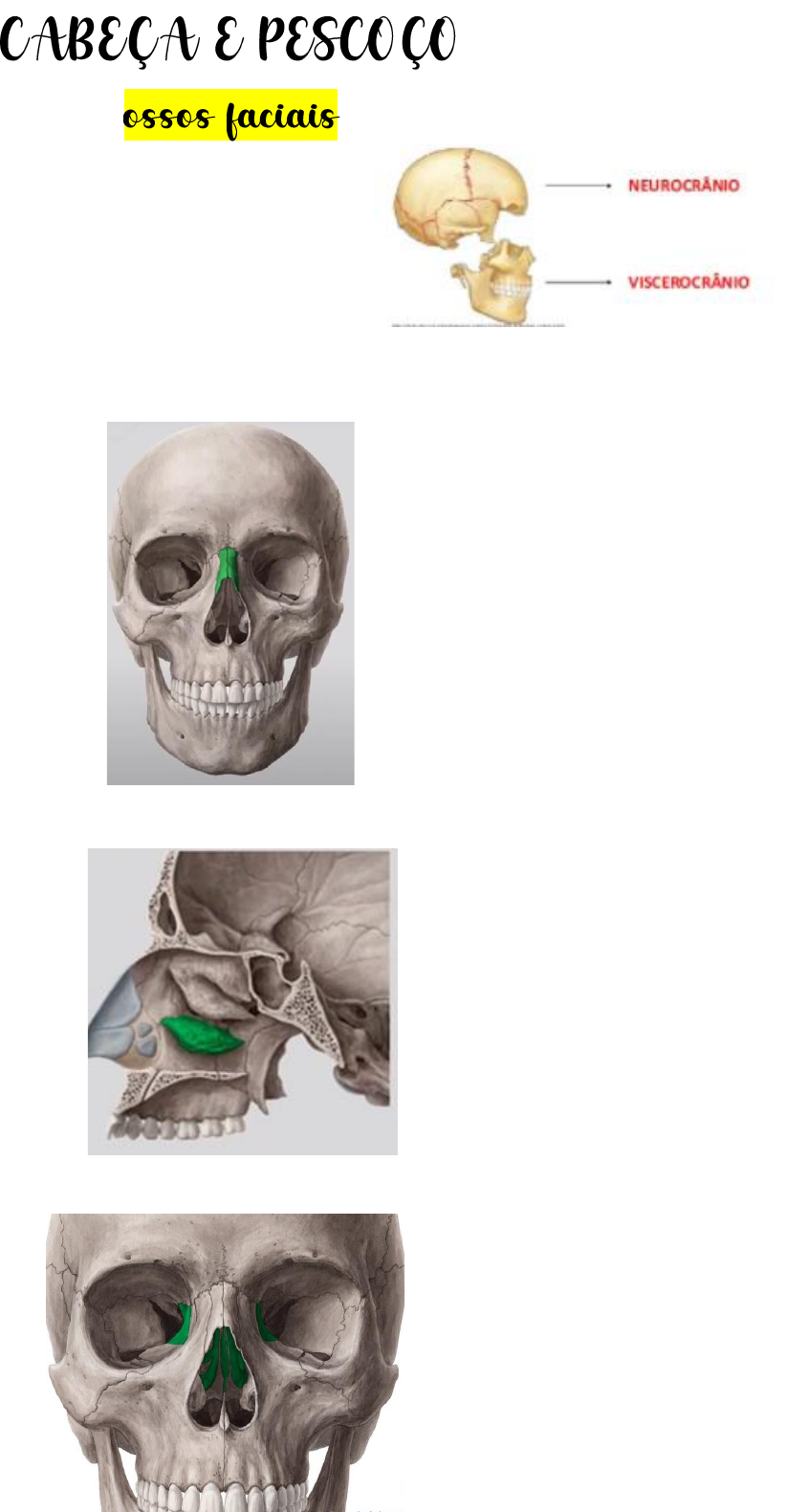 Fazem parte do viscerocrânio, que compõem com o neurocrânio os 22 ossos do crânio (neurocrânio é a região que protege encéfalo, enquanto o viscerocrânio protege a face) • O viscerocrânio possui 14 ossos, 6 pares e 2 ímpares. Osso nasal (par): forma a parte óssea do nariz, gerando o seu contorno. Concha nasal inferior (par de ossos irregulares): localizada na parede lateral da cavidade nasal Osso lacrimal (par de ossos planos): região medial da órbita ocular. thaya Máquina de escrever Thayane Barreto Osso maxila (par): confere a maior porção da face. Nele se insere a maior parte do tecido muscular. Conecta-se com todos os ossos da órbita, exceto o osso frontal. Forma os alvéolos superiores. Osso zigomático (par de ossos irregulares): forma as maçãs do rosto. É uma ponte entre o viscerocrânio e o neurocrânio. Articula-se com a maxila, a partir de uma sutura zigomático- maxilar, e com o osso frontal, a partir da sutura fronto-zigomática. Dentro dessa porção óssea, ele se articula com a porção temporal, formando o arco zigomático. Osso vômer (ímpar): é da parte inferior do septo nasal, formando a parte póstero-inferior do septo, enquanto que a superior é formada pelo osso etmoide. Osso palatino (par): forma a parte posterior do palato duro e faz parte do assoalho da cavidade nasal. Tem formato curvo e é dividido em placas horizontal e perpendicular. Mandíbula (ímpar irregular): não faz parte diretamente do crânio, mas articula-se com o mesmo pela articulação temporomandibular (ATM), dando um contorno ao inferior da face e formando o queixo. MÚSCULOS DA CALVÁRIA (REGIÃO DO COURO CABELUDO) E SUPERCÍLIO: Frontal: em amarelo; é o mais superior, ventre do epicrânio; Prócero: em azul; fica na região da glabela; Corrugador do supercílio: em vermelho; Orbicular do olho: em verde; funciona análogo a um esfíncter. O reflexo palpebral que temos quando algum objeto é jogado em nossa direção, por exemplo, é causado por ele; Depressor do supercílio: não consta na imagem. Músculos do nariz: função de dilatar a narina e facilitar a respiração. Nasal: em amarelo; transverso e alar; Levantador da asa do nariz e do lábio superior: em azul; Depressor do septo nasal: em vermelho; Músculos da boca: função de promover movimento; Orbicular da boca: em azul; função de fechar a boca; Levantador do lábio superior: em amarelo; Zigomático menor: em vermelho; Zigomático maior: em verde; Levantador do ângulo da boca: na ilustração abaixo: Risório: em azul; faz o riso forçado; Bucinador: em amarelo; é o da bochecha, e impede que o alimento fique entre ela e o dente, empurrando-o para facilitar a mastigação; Depressor do ângulo da boca: em laranja; Depressor do lábio inferior: em preto; Mentual: em roxo: Músculos da mastigação: não são exatamente da face, pois não participam da expressão facial; até os nervos que os inervam são diferentes dos do resto da face. Os principais são: Músculos da órbita ocular: são 6. Inervados pelos nervos oculares motores (III, IV, VI), como será visto no tópico seguinte. 1. Reto superior 2. Reto inferior 3. Reto medial 4. Reto lateral 5. Oblíquo superior 6. Oblíquo inferior Pterigoide medial Pterigoide lateral Masseter Temporal (articula-se com o processo coronoide da mandíbula para auxiliar na mastigação) São XII pares de nervos cranianos. Os principais para a face são: Facial (VII): responsável pela expressão facial; possui 5 ramificações; inerva todos os músculos da mímica facial (com exceção dos músculos da mastigação); Trigêmeo (V): responsável pela mastigação e sensibilidade da face e da língua; inerva a mandíbula e os músculos da mastigação; É o suprimento arterial, que se dá principalmente pelos ramos da carótida externa (pois possui muitas bifurcações e irriga mais regiões da face), uma bifurcação da artéria carótida comum, bem como os ramos da carótida interna. Em contrapartida, o retorno venoso é realizado pela jugular interna. . Principais artérias 1. Artéria facial: principal vaso de irrigação da face; seu pulso é palpável quando a musculatura está relaxada, bem como a artéria temporal superficial, próxima à orelha; ramifica-se próximo à borda inferior da mandíbula, gerando a artéria labial inferir e superior, e um ramo nasal lateral. 2. Artéria facial transversa: ramificação da artéria facial externa. Atravessa a região da glândula parótida, cruza a face e fica localizada entre o arco zigomático e o ducto carotídeo. 3. Artéria maxilar: é infraorbital, se ramifica bastante; é o maior dos 2 ramos terminais da artéria carótida externa. Seus pequenos ramos contribuem para o suprimento da face. São eles: artéria infraorbital (que sai pelo forame infraorbital), supre a pálpebra inferior, o lábio superior e a área entre essas estruturas.; artéria bucal e artéria mentual. (que sai pelo forame mentual). 4. Artéria oftálmica: proveniente da artéria carótida interna, ao contrário das anteriores. Ramos da Artéria Oftálmica: Artérias zigomaticofacial e artéria temporal, e artéria dorsal do nariz. Locais de irrigação: Veias principais 1. Veia facial: principal para irrigação da face 2. Veia facial transversa 3. Conexões venosas intracranianas: regiões profundas da cabeça Drenagem linfática Três grupos de linfonodos: • Submentuais • Submandibulares • Pré-auriculares e parotídeos Correlação clínica Caso clínico: Isabel, 33 anos, branca, casada, engenheira. Ao chegar em casa, seu marido ficou extremamente assustado. A metade esquerda do rosto da moça estava toda repuxada e ela não conseguia articular bem as palavras. Desta forma, Isabel foi conduzida ao hospital com medo de sua musculatura ficar assim para sempre. A médica plantonista realizou o exame neurológico e informou à Isabel que o problema era do outro lado. O que acontece? Paralisia de Bell: paralisia facial periférica idiopát