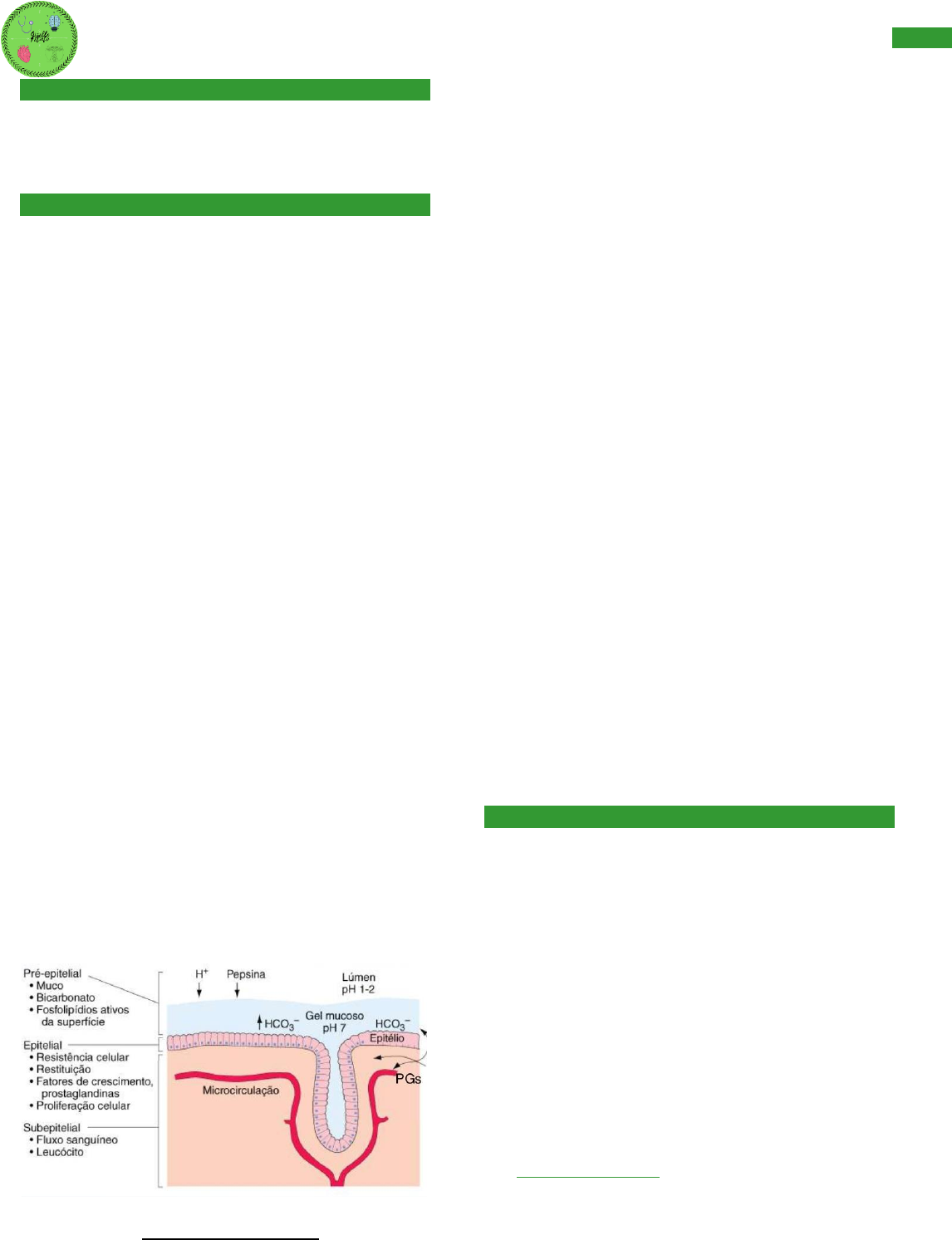 Fonte: Aula 1 DOENÇA ULCEROSA PÉPTICA (DUP) Gizelle Felinto DEFINIÇÃO ➢ Perda circunscrita de tecido, que ultrapassa os limites da muscular da mucosa e se localiza nas regiões do tubo digestivo em contato com a secreção cloridropéptica do estômago FISIOLOGIA DA SECREÇÃO ÁCIDA/PÉPTICA DO ESTÔMAGO ➢ Glândula Oxíntica: • Localizada na parte proximal do estômago (corpo e fundo gástrico) • Nessa glândula está presente a Célula Parietal ou Célula Oxítica: ▪ Em sua membrana luminal tem-se a bomba de prótons ▪ Produção de ácido (H+) e secreção desse ácido na luz gástrica através da bomba de prótons ▪ 3 transmissores que estimulam o funcionamento da bomba de prótons – a produção de ácido (se ligam na membrana basal da célula parietal): ✓ Gastrina ✓ Histamina ✓ Acetilcolina ➢ Célula G: • Está presente na parte distal do estômago (antro gástrico) • Função → produção de Gastrina, que é um dos transmissores que estimula a secreção de ácido pela célula parietal ➢ Célula D: • Está localizada próxima às células G, no antro gástrico • Função → produção de Somatostatina, responsável pela inibição da secreção ácida ➢ As células G e as células D atuam como um balanço de inibição e de estímulo à secreção ácida ➢ FATORES DE PROTEÇÃO E REPARAÇÃO DA MUCOSA GÁSTRICA CONTRA ESSE ÁCIDO: • Esses fatores de proteção são necessários para que a mucosa gástrica não sofra lesões devido ao baixo Ph do estômago (cerca de 1 a 2) • 3 barreiras que protegem a mucosa gástrica contra o Ph ácido: ▪ Pré-epitelial: ✓ Camada de Muco e Bicarbonato (mais importante): o São produzidos pelas Células Mucosas ou Células Foveolares o Formam uma lâmina/gel em cima da mucosa, constituindo a primeira barreira de proteção contra o ácido do estômago ✓ Fosfolipídios ativos da superfície ▪ Epitelial: ✓ Resistência celular ✓ Restituição ✓ Fatores de crescimento ✓ Proliferação celular ✓ O epitélio gástrico é um epitélio colunar simples e, apesar de ter apenas uma camada, ele tem uma regeneração celular muito rápida. Assim, no fundo das glândulas oxíticas, tem-se algumas células totipotentes que são rapidamente diferenciadas em células da mucosa gástrica, que vão substituindo as que sofreram morte celular. Dessa forma, quando ocorre uma lesão momentânea do epitélio gástrico, rapidamente há a regeneração desse epitélio ▪ Subepitelial: ✓ Funciona à base de um fator principal: a microvascularização da submucosa gástrica, que é extremamente vascularizada ✓ Essa microvascularização leva oxigênio e nutrientes para a camada mucosa e a submucosa → para que a camada pré-epitelial e a epitelial funcionem perfeitamente ✓ São responsáveis por coordenar a microcirculação e, consequentemente, todo o processo de barreira da mucosa gástrica: o Prostaglandinas (PGs) o Óxido Nítrico PATOGÊNESE ➢ Para que ocorra ulceração é necessário um desequilíbrio entre os fatores de produção de ácido e os fatores de proteção e reparação da mucosa contra esse ácido. Ou seja, o paciente está produzindo muito ácido ou existe algum fator que quebre o sistema da barreira de proteção gástrica contra o ácido (como AINES). Assim, se algum desses fatores de desequilíbrio ocorrer, vai existir lesão na mucosa gástrica e, a depender do grau de lesão, o paciente pode até mesmo desenvolver uma úlcera ➢ 3 principais fatores que danificam a barreira gástrica: • Helicobacter pylori • AINES • Isquemia → ocorre principalmente no tabagismo ➢ Se não houver H. pylori, AINE, Isquemia ou um excesso ácido, não haverá úlcera ➢ HELICOBACTER PYLORI: • É a infecção bacteriana mais comum no mundo • É um bacilo gram-negativo flagelado • Danifica a mucosa gástrica e altera a produção de ácido • É o principal fator envolvido com o desenvolvimento de úlceras duodenais e gástricas Fonte: Aula 2 DOENÇA ULCEROSA PÉPTICA (DUP) Gizelle Felinto • As úlceras mais comuns secundárias ao H. pylori são as duodenais • Nem todas as pessoas infectadas pelo H. pylori vão desenvolver uma lesão da mucosa gástrica. Isso depende dos fatores de imunidade do indivíduo contra a bactéria e dos fatores de virulência da bactéria (existem vária cepas e cada cepa tem o seu fator de virulência): ▪ Indivíduo com boa imunidade contra a bactéria ou Bactéria com poucos fatores de virulência → não irá se desenvolver um processo inflamatório intenso contra a bactéria e, consequentemente, ele não terá lesão da mucosa gástrica ▪ Indivíduo sem fatores imunes contra a bactéria ou Cepa com acentuados fatores de virulência → desenvolvimento de processo inflamatório intenso e, consequentemente, lesões na mucosa gástrica • Epidemiologia: ▪ 10 a 15% dos infectados → úlcera péptica ▪ 0,1 a 3% → Adenocarcinoma ▪ < 0,01% → linfoma MALT • Evolução da lesão do H. pylori: 1. Pangastrite Aguda Superficial → é uma reação inflamatória inicial à bactéria, causando um infiltrado neutrofílico na mucosa ✓ Todos os pacientes com infecção pelo H. pylori vão desenvolver 2. Gastrite Crônica Superficial (85 – 90%) ou Gastrite Antral Crônica (10 - 15%): ✓ Gastrite Crônica Superficial → em indivíduos que tem fatores imunes contra a bactéria ou cepa com poucos fatores de virulência o Ocorre um leve processo inflamatório crônico que não vai causar maiores lesões à mucosa gástrica o Esse paciente convive com a H. pylore no seu estômago/duodeno pelo resto de sua vida sem ter maiores problemas ✓ Gastrite Antral Crônica → em indivíduos que tem uma imunidade mais baixa contra a bactéria ou adquiriram uma cepa de virulência mais elevada o A bactéria vai se localizar na parte mais distal do estômago (no antro), que é uma região em que se tem a maior concentração de células G e de células