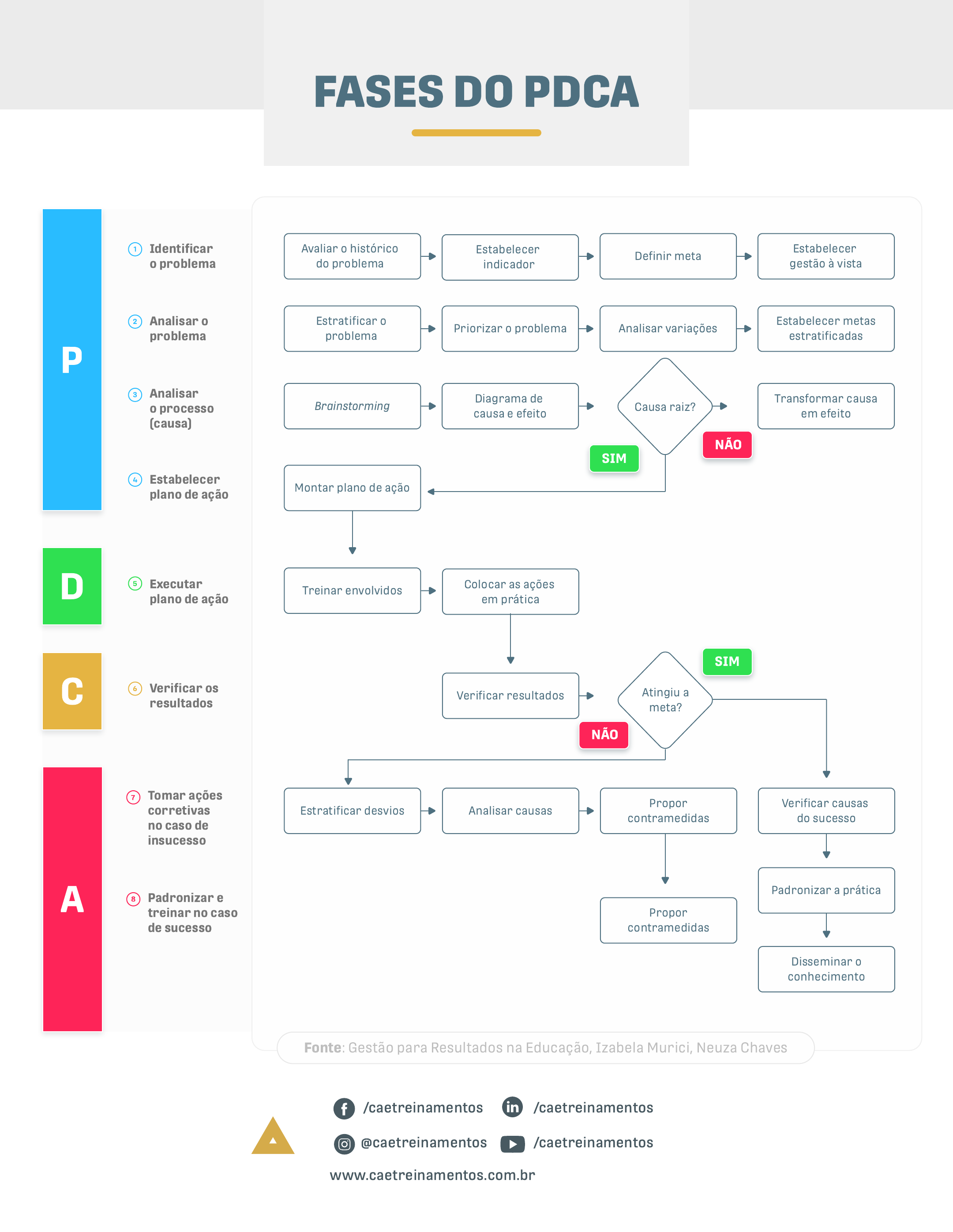 P D C A Identificar o problema 1 Analisar o problema 2 Analisar o processo (causa) 3 Estabelecer plano de ação 4 Executar plano de ação 5 Verificar os resultados 6 Tomar ações corretivas no caso de insucesso 7 Padronizar e treinar no caso de sucesso 8 Avaliar o histórico do problema Estratificar o problema Brainstorming Montar plano de ação Treinar envolvidos Estratificar desvios Propor contramedidas Propor contramedidas Padronizar a prática Disseminar o conhecimento Verificar causas do sucesso Analisar causas Colocar as ações em prática Verificar resultados Priorizar o problema Diagrama de causa e efeito Analisar variações Estabelecer indicador Definir meta Estabelecer gestão à vista Estabelecer metas estratificadas Transformar causa em efeito Causa raiz? Atingiu a meta? SIM SIM NÃO NÃO Fonte: Gestão para Resultados na Educação, Izabela Murici, Neuza Chaves /caetreinamentos /caetreinamentos @caetreinamentos /caetreinamentos www.caetreinamentos.com.br FASES DO PDCA