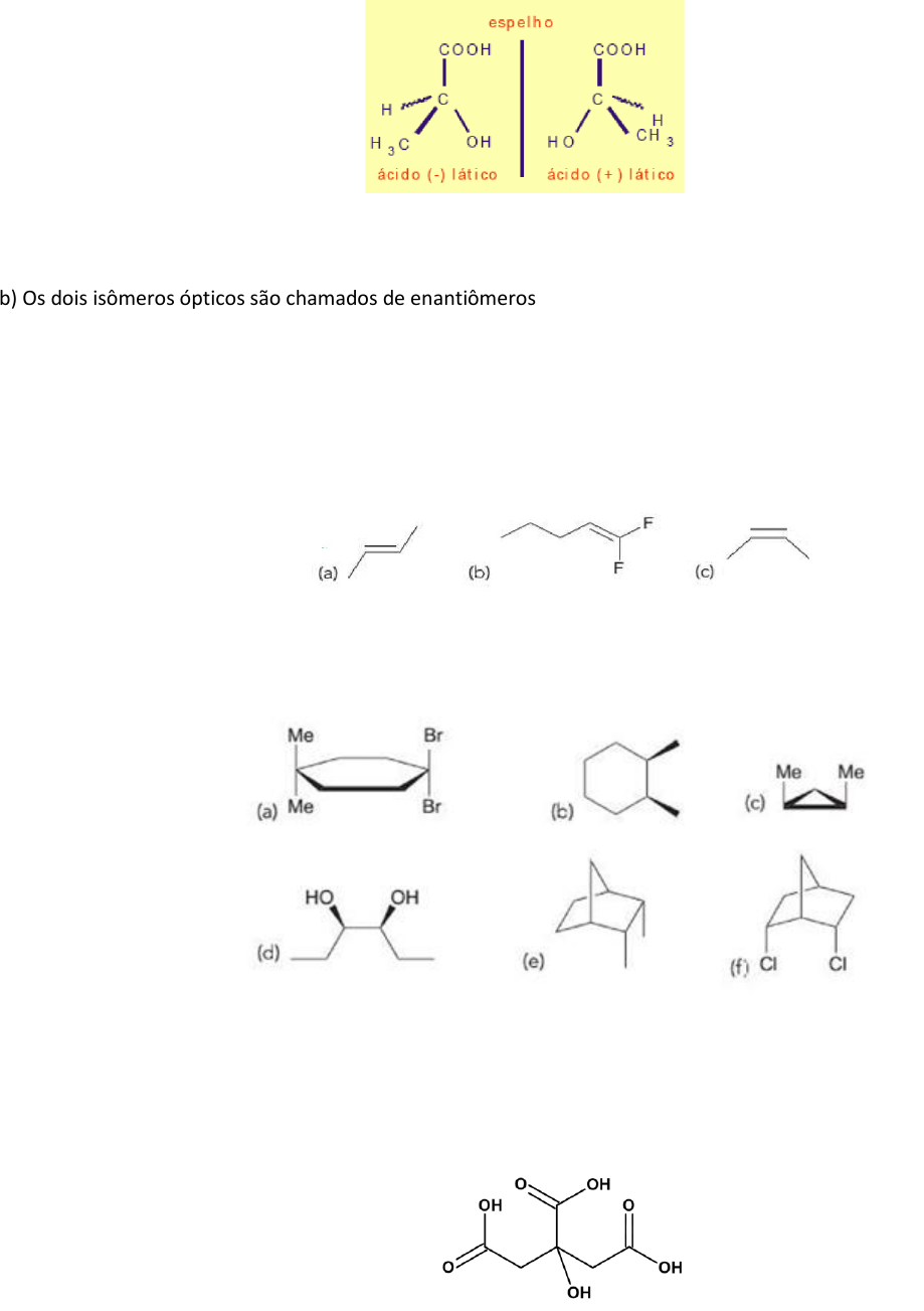 DISCIPLINA: QUÍMICA ORGÂNICA I - PUCRS Profa. Dra. Franciele Longaray. B LISTA 1 – Estereoquímica: Isomeria 1. Uma molécula é quiral se a sua imagem não é idêntica à imagem especula. Considere, por exemplo, a molécula de ácido lático, onde temos dois isômeros ópticos, o ácido (+) lático e o ácido (–) lático. Pode-se afirmar, para os dois isômeros ópticos, que: a) Ambos não desviam o plano da luz plano-polarizada. b) Os dois isômeros ópticos são chamados de enantiômeros c) O ácido (–) lático é dextrógiro. d) O ácido (+) lático é levógiro. e) Uma solução dos dois isômeros, na mesma concentração, desvia o plano da luz polarizada de um ângulo de +2,6°. 2. Observe os compostos abaixo e determine se ele apresenta uma configuração cis ou trans. 3. Cada uma das seguintes moléculas abaixo apresenta um plano de simetria, encontre-o. OBS: Um plano dessimetria pode cortar átomos ao meio. 4. O ácido cítrico é um sólido branco e cristalino, muito utilizado na indústria alimentícia e de bebidas, e sua estrutura é representada abaixo. Indique se existe carbono quiral em sua estrutura química, justifique sua resposta 5. Identifique todos os centros de quiralidade presentes nas estruturas abaixo, caso exista 6. Algumas substâncias têm a propriedade de desviar o plano de vibração da luz polarizada e são denominadas oticamente ativas. Esta propriedade caracteriza os compostos que apresentam isomeria ótica. A condição necessária para a ocorrência de isomeria ótica é que a substância apresente assimetria. Considere as representações espaciais (Fischer) das estruturas a seguir: Em relação às estruturas I, II, III e IV afirma-se, corretamente: a)Todas apresentam atividade ótica. b) Somente a I e a II apresentam atividade ótica. c) Somente a I e a III apresentam atividade ótica. d) Somente a III e a IV apresentam atividade ótica. e) Somente a II e a IV apresentam atividade ótica. 7. Considere as fórmulas estruturais seguintes: I.CH2(OH)-CH2(OH) II. CH3 CH(OH)-CH2-CH3 III. CH3-CH=CH-CH3 IV. CH2(OH)-CH=CH2 Há isômeros ópticos e isômeros geométricos, respectivamente, nos compostos representados por a) I e II b) I e IV c) II e III d) II e IV e) III e IV 8. Dada a estrutura abaixo: para torná-la opticamente ativa, o R deverá ser: a) -H ou –NH2 b) –CH3 ou -NH2 c) –CH3 ou -CH2CH3 d) -H ou –CH3 e) -CH2CH3 ou -NH2 9. O número máximo de carbono quiral que a estrutura da glicose apresenta a) 2 b) 4 C) 6 d)5 e) nenhum 10. Verifique se cada par de compostos mostrados abaixo apresentam isomeria plana. Além disso, mostre a fórmula molecular de cada composto a) metoxibutano e etoxipropano b) 2-buteno e butano c) propil-amina e metil-etil-amina d) ácido propanoico e etanoato de metila e) metil-propano e butano f) etanal e etenol 11. Indique a ordem de prioridade de cada conjunto de substituintes. 12. Analise a estrutura abaixo e indique o enantiômero R e S 13. Desenhe os enantiomeros do bromoclorofluorometano e atribua a designação (R) ou (s) para cada enantiômero