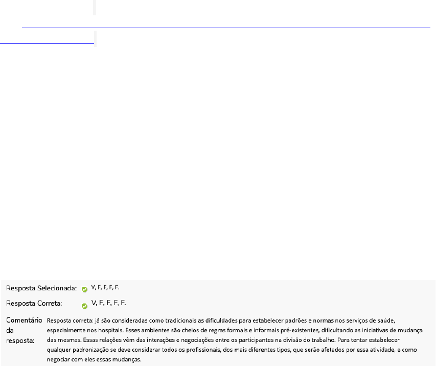 Atividade 4 (A4) - Gestão em Serviços de Saúde Segundo Bonato (2011, p. 321) “A sistemática de qualidade escolhida pelos serviços de saúde, qualquer que seja, está vinculada a um conjunto de ações e posições socioculturais de seus gestores. Retrata relações estabelecidas entre eles, no processo de trabalho e em seus grupos de referência, refletindo-se nas opções definidas. O sistema de crenças e valores dos indivíduos e da organização está embutido na escolha metodológica, que visa a atender às expectativas das partes comprometidas no pro cesso. Os sistemas híbridos podem ser positivos e alavancadores de um desenvolvimento crescente e espiralado, envolvendo, cada vez mais, os diversos níveis da instituição.” BONATO, V. L. Gestão de qualidade em saúde: melhorando assistência ao cliente. O Mundo da Saúde , São Paulo, v. 35, n. 5, p. 319-331, 2011. Disponível em: http://bvsms.saude.gov.br/bvs/artigos/gestao_qualidade_saude_melhorando_assi stencia_cliente.pdf . Acesso em: 20 jul. 2020. Assinale as afirmativas e marque com (V) as verdadeiras e (F) as falsas. I. ( ) O ambiente hospitalar é cheio regras formais e informais, decorrentes das relações entre as diversas categorias de profissionais. Isso torna ainda mais difícil o processo de estabelecer normas e padrões, tão importantes para gestão da qualidade. II. ( ) Na maior parte das instituições de saúde existe uma cultura aberta de divulgação de erros e outros acontecimentos que possam prejudicar o paciente, sempre em busca de melhorar a qualidade do atendimento. III. ( ) Algumas características que influenciam a implementação, com sucesso, em organizações de saúde, diferem muito dos requisitos para excelência em saúde, questões como liderança e foco no cliente são secundárias. IV. ( ) Organizações de saúde são mundialmente reconhecidas pelo seu nível de padronização de procedimentos operacionais, protocolos e afins. Os profissionais geralmente têm pouca autonomia nas atividades. V. ( ) Qualquer organização é capaz de gerenciar seus erros/falhas, desde que sejam implementados mecanismos de punição para esses erros. Quando mais severa a punição, menos a ocorrência de erros. Agora, assinale a alternativa que traz a ordem correta. Rooneu e Ostenberg (1999, p. 3) explicam sobre a certificação em saúde, e trazem que “Apesar de os termos acreditação e certificação serem comumente usados como sinônimos, a acreditação normalmente se aplica a instituições, enquanto a certificação se aplica a profissionais individuais e a instituições. Quando conferida a profissionais individuais [...] esse profissional recebeu instrução e treinamento adicionais e demonstrou competência em [...] requisitos mínimos para licenciamento. [...] Quando aplicada a uma instituição, ou setor de uma instituição, como um laboratório, a certificação normalmente implica que a instituição dispõe de serviços adicionais, tecnologia ou capacidade além daquelas encontradas em instituições semelhantes.” ROONEY, A. L.; OSTENBERG, P. Licenciamento, acreditação e certificação: abordagens à qualidade de serviços de saúde. Projeto de Garantia de Qualidade, Centro dos Serviços Humanos-CHS . USA: USAID, 1999. Disponível em: https://usaidassist.org/sites/assist/files/licenciamento_acreditacao_certificacao_20 00.pdf . Acesso em: 20 jul. 2020. Dado o contexto descrito, e os conceitos discutidos no texto, assinale a alternativa correta a respeito da certificação em saúde. Conforme Bonato (2011, p. 321) “Acreditação é um método de avaliação externa da “Qualidade” dos serviços de saúde. Difundida em países de língua inglesa, antecedeu o movimento do gerenciamento da “Qualidade Total”. Seu desenvolvimento se confunde com aquele dos serviços de saúde nos Estados Unidos, exemplo mais conhecido e divulgado dessa vertente da “Qualidade”. Por ter sido desenvolvida para a saúde e dentro da sua realidade, envolveu, sobretudo, a corporação médica. Essas características tendem a diminuir as resistências observadas no setor para a adoção de métodos de avaliação.” BONATO, V. L. Gestão de qualidade em saúde: melhorando assistência ao cliente. O Mundo da Saúde , São Paulo, v. 35, n. 5, p. 319-331, 2011. Disponível em: http://bvsms.saude.gov.br/bvs/artigos/gestao_qualidade_saude_melhorando_assi stencia_cliente.pdf . Acesso em: 20 jul. 2020. Analise as alternativas a seguir e assinale aquela que traz a informação correta quanto a acreditação em saúde. Estudos de Spee e Jarzabkowski (2009 apud NEIS, PEREIRA, MACCARI, 2017, p. 482) comprovaram que a implementação do processo de planejamento estratégico consegue relacionar as diversas unidades da organização. “[...] Sabe-se que para a execução bem-sucedida da estratégia é necessário que ela seja reconhecida e legitimada pelos diversos membros e grupos de interesses componentes da organização, e por meio dessas interações é possível até mesmo perpassar as fronteiras dos departamentos ou unidades, através da distribuição do poder hierárquico e da divisão das tarefas e unidades.” NEIS, D. F.; PEREIRA, M. F.; MACCARI, E. A. Processo de planejamento estratégico e estrutura organizacional: impactos, confluências e similaridades. Brazilian Business Review , [Vitória], v. 14, n. 5, p. 479-492, 2017. Disponível em: http://www.bbronline.com.br/index.php/bbr/article/view/63/97 . Acesso em: 20 jul. 2020. Analise as afirmativas a seguir com base na contextualização e no estudo desta unidade. I. Algumas das etapas do planejamento estratégico são estabelecer a missão da empresa e sua visão para o futuro, analisar as forças e fraquezas da organização e oportunidades e ameaças do ambiente externo. Também deve considerar avaliar os resultados e rever o que for necessário no planejamento. II. A análise SWOT consiste em verificar como a empresa pode aprender com seus conc