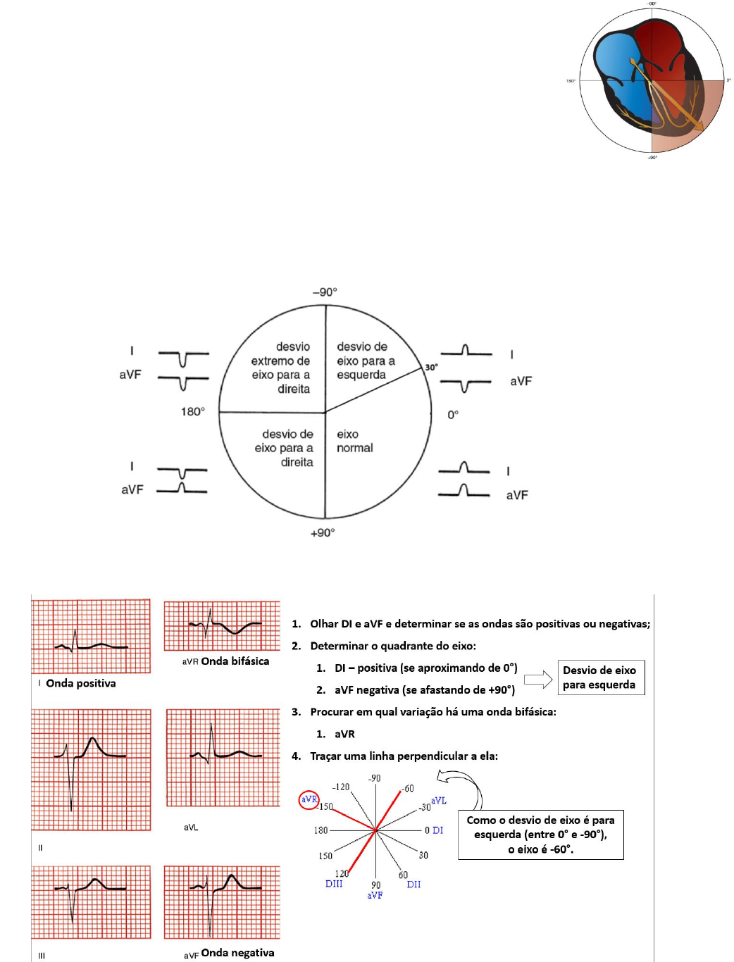 Hiole Nolasco Hipertrofia e dilatação do coração − Quando uma câmara cardíaca se hipertrofia ou dilata, 3 situações podem acontecer com uma onda de ECG: o Maior duração devido ao maior tempo necessário para se despolarizar; o Maior amplitude devido à geração de mais corrente elétrica; o Desvio do eixo elétrico devido à movimentação de maior percentagem da corrente elétrica total através da câmara expandida. − O eixo normal do QRS está entre +90° e 0° (faixa estendida +90° a -30°); − Se complexo QRS for positivo em DI e aVF = normal. o O vetor QRS aponta para esquerda e para baixo, então quando a corrente elétrica é gerada, tanto DI quanto aVF irão registrar um complexo positivo, pois a corrente está indo em suas direções. Como no quadrante entre +90° e 0° ambas as derivações são positivas, esse é o eixo normal do QRS. − Desvios de eixo o Avaliar o QRS em DI e aVF para identificar em qual quadrante está o desvio de eixo. o Exemplo: ▪ Se a onda está negativa em DI, a corrente está se afastando do ângulo 0° e positiva em aVF, a corrente está se aproximando dessa derivação, então há um desvio de eixo para a direita. o Lembrar sempre que DI é 0° e aVF +90° e que onda positiva quer dizer que está se aproximando e onda negativa se afastando, depois é só posicionar o vetor no quadrante. − Definição precisa do eixo o Depois de analisar DI e aVF e determinar em qual quadrante está o desvio; o Identificar em qual derivação tem uma onda bifásica e traçar uma linha perpendicular a ela. Hiole Nolasco − Identificar o eixo do complexo QRS, da onda P e da onda T no ECG a seguir: Hiole Nolasco Aumento atrial − Como a onda P demonstra a despolarização atrial, sendo a primeira parte correspondente ao átrio direito e a segunda ao átrio esquerdo, é através dela que vamos identificar se há hipertrofia atrial direita ou esquerda. − As derivações a serem analisadas serão DII e V1: o DII: quase paralela ao fluxo de corrente; o V1: perpendicular ao fluxo de corrente. − Onda P normal: o Duração < 0,12 segundos; o Maior amplitude não deve exceder 2,5 mm; o DII: onda positiva; o V1: onda bifásica. ✓ Aumento atrial direito – P pulmonale: o Vai estar alterada a primeira parte da onda P; o “Onda P apiculada” 1. DII: amplitude > 2,5mm (em ritmos sinusais); a. Quanto maior a amplitude, mais acurado será o laudo, então o valor deve ser descrito. 2. V1: primeira parte da onda positiva e com amplitude > 1,5mm; o Diagnóstico: critérios 1 e/ou 2 presentes. o Não há alteração na duração da onda P. ✓ Aumento atrial esquerdo – P mitral: 1. Onda P > 0,12 segundos, independente da derivação e se o ritmo é sinusal ou não; 2. V1: segunda parte da onda negativa com largura e profundidade maiores que 1mm (Critério de Morris – mais específico); o Diagnóstico: critérios 1 e/ou 2 presentes; ✓ Aumento biatrial – cardiopatia grave com comunicação entre os átrios o No mínimo 1 critério de hipertrofia de AD + 1 de AE (não precisam estar na mesma derivação). Aumento ventricular COMPLEXO QRS ✓ R: qualquer onda positiva de um QRS ✓ Q: 1ª onda negativa que antecede ao 1º R, se estiver presente ✓ S: qualquer onda negativa, depois do R ✓ Aumento ventricular direito − Em adultos, vê-se pouco, quando está presente ou tem cor-pulmonale ou estenose mitral; − Está presente até os 14 anos; − V1 normalmente tem uma pequena onda R e uma onda S profunda − V1: R ≥ S − V6: S ≥ R − Muitos pacientes têm sobrecarga biventricular, porém as alterações de sobrecarga de VE não deixam que a de VD seja percebida. ✓ Aumento ventricular esquerdo − Primeiro buscar o critério de Cornell, pois é mais específico. o Índice de Cornell ▪ R de aVL + S de V3 ≥ 28 mm em homens ▪ R de aVL + S de V3 ≥ 20 mm em homens ▪ Especificidade 90% e sensibilidade 40% − Se não encontrado, buscar Sokolow-Lyon o Sokolow-Lyon ▪ S de V1 + R de V5 ou V6 ≥ 35 mm • Deve ser utilizado a derivação onde o R é maior, geralmente é maior em V5, mas pode variar; Hiole Nolasco • O ponto de início do QRS deve ser usado como referência. O que estiver acima é positivo e tudo que estiver abaixo é negativo; ▪ Especificidade 80% e sensibilidade 50% − Se encontrou qualquer um dos critérios acima, buscar Strain, que é uma anomalia de ST-T, que acontece quando a doença já está instalada há um tempo, sendo esse um fator prognóstico. o Strain ▪ Rebaixamento do segmento ST e inversão de onda T; • V1, V2 eV3 → Ventrículo direito; • DI, aVL, V5 e V6 → Ventrículo esquerdo. • Se for encontrado em V1, V2 e V3, sem os critérios de hipertrofia de VD, o achado será caracterizado como uma injúria, de causa então desconhecida, já que o Strain é um achado secundário à alteração de repolarização de VD − Se não encontrou nenhum dos critérios acima, buscar Índice de Romhilt-Estes o Índice de Romhilt-Estes: ▪ S de V1 ≥ 24 mm ▪ Especificidade 100% e sensibilidade 20%. Hipertrofia ventricular Ventrículo Direito Esquerdo Precordiais 1. V1: onda R > onda S 2. V6: onda S > onda R 1. Índice de Cornell a. R de aVL + S de V3 ≥ 28 mm em homens b. R de aVL + S de V3 ≥ 20 mm em homens 2. Sokolow-Lyon a. S de V1 + R de V5 ou V6 ≥ 35 mm 3. Índice de Romhilt-Estes a. S de V1 ≥ 24 mm Anormalidades secundárias da repolarização na hipertrofia ventricular - Strain Depressão do segmento ST com e inversão da onda T; V1, V2 eV3 → Ventrículo direito; DI, aVL, V5 e V6 → Ventrículo esquerdo. Exemplo de laudo: hipertrofia de ventrículo esquerdo pelo Índice de Cornell, com anormalidades secundárias da repolarização, padrão Strain (DI, aVL, V4, V5 e V6). Bloqueios de ramo ✓ Bloqueio de ramo direito: − Pode acontecer em cardiopatia isquêmica (lesão proximal de DA); cardiopatia chagásica (associação com bloqueio direito anterossuperior) e hipertensão pulmonar (TEP, C
