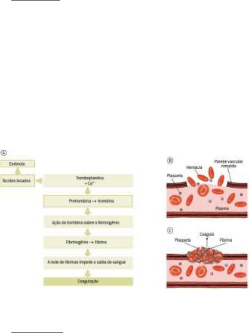 BIOQUÍMICA - COAGULAÇÃO Lorena Alves (Rola) TXXI 1 Coagulação 1. Introdução A coagulação é um mecanismo que deve ser realizado rapidamente. Os fatores de coagulação e plaquetas já estão presentes em nosso organismo de forma inativa com o objetivo de não gerar trombos. Obs: Anticoagulantes --> interferem nas etapas de coagulação. Obs: O sangue possui sua localização restrita nos vasos sanguíneos. 2. Hemostasia A hemostasia é o processo no qual o sangue se mantém fluído e restrito aos vasos sanguíneos na finalidade de evitar a perda de sangue e de sua fluidez. Esse equilíbrio é gerado por fatores anti coagulantes localizados nas paredes dos vasos que mantém a fluidez do mesmo. Além disso, há a presença de plaquetas (elemento circulante no sangue) e de proteínas plasmáticas (fatores coagulantes e anti coagulantes). O equilíbrio hemostático é então formado por mecanismos coagulantes e anticoagulantes. Quando ocorre uma lesão no endotélio não há produção de coagulantes naturais e sim de fatores pro coagulantes presentes no plasma sanguíneo. Existem vários mecanismos de coagulação, entre eles estão: vasoconstrição (diminuição do lúmen do vaso), formação do tampão plaquetário, formação do coágulo sanguíneo, crescimento do tecido fibroso e remoção do coágulo, todos esses mecanismos são processos rápidos. Lesão vascular: Essa lesão gera vasoconstrição, exposição do colágeno da MEC com o sangue junto com moléculas produzidas no endotélio (fator tecidual) resulta na formação de coágulo (plaquetas + fibrinas) --> Quando o endotélio se recupera recruta fatores que dissolve a fibrina. As plaquetas inativas após uma lesão mudam sua conformação gerando um tampão plaquetário e recrutando outras substâncias para aumento do número de plaquetas afim de gerar uma agregação. As plaquetas também possuem fatores de crescimento. A degradação de fibrinogenio em fibrina leva a formação de uma rede com plaquetas e coágulos. Esses coágulos são desfeitos aos poucos (elementos vão voltando gradativamente ao plasma). Plaquetas: São fragmentos celulares que participam da coagulação com grânulos densos (ADP, cálcio e serotonina) e alfa (fatores de crescimento, coagulação e sinalização para agregação plaquetária). No meio extra a exposição do colágeno com o Fator de Von Willebrand subendotelial gera receptores que se ligam as plaquetas e a trombina induz a agregação plaquetária. Fosfolipases gama e beta clivam a PIP 2 em DAG que induz PKC e IP3 (liberando cálcio no citosol plaquetário e induzindo fosfolipase). (obs: a PKC gera fosforina responsável pela degranulação de plaquetas) O tromboxano (indutor de fosfolipase), A2 e ADP, liberam grânulos e se ligam ao receptor 2gama induzindo fosfolipase. A consequência da liberação fosfolipase Beta e gama é o aumento de cálcio citoplasmático ativando fosfolipase A2 que cliva fosfolipidios de membrana em araquidonato que pela ação da COX1 formará tromboxano A2 que será liberado para fora das plaquetas. TAX2 e ADP se ligam na própria plaqueta e ativam outras plaquetas que estão chegando. BIOQUÍMICA - COAGULAÇÃO Lorena Alves (Rola) TXXI 2 Ativação de plaquetas: A plaqueta ativada possui sua forma discóide por tromboxano e ADP. Ocorre a formação do complexo GPII E GPIIIA, o complexo ativado então se liga ao fibrinogênio circulante ou fator Von circulante. O estímulo é gerado pela Fosfolipase A2, ativando Ac. Araquidonico -> Cox I -> Tromboxano A2 levando a ativação e agregação plaquetária. Fases da hemostasia: Essas fases são: hemostase primária onde ocorre o tampão plaquetário com adesão do colágeno subendotelial as plaquetas circulantes, a hemostase secundária consiste na consolidação do tampão de fibrina e por fim a fibrinólise consiste na remoção do coágulo. (obs: em lesões grandes não há plaquetas suficientes, ativando então a hemostase secundária junto com a liberação de grânulos plaquetários. Na hemostase primária: a lesão do vaso gera uma exposição do colágeno levando a uma adesão plaquetária ocorrendo a degranulação com a liberação de tromboxano e ADP, aumentando o número plaquetário devido à multiplicação desse processo e por fim a agregação plaquetária. As plaquetas liberam principalmente ADP, tromboxano, lipoproteínas, fator plaquetário, fator recrutador de mais plaquetas de crescimento (estimula reparo de tecido danoso) e serotonina (reduz fluxo sanguíneo para área lesada). Abaixo do endotélio há colágeno e fator de Von Willebrand --> quando há exposição são expostos. As plaquetas possuem receptores para colágeno e para os fatores possuindo 2 estágios: Adesão (Plaquetas + Parede do vaso - ocorrido por fator de Von e colágeno), Agregação (plaquetas + plaquetas - ocorrido por TAX 2 e ADP). Também podem realizar diferentes atividades, como: secretória, pró- coagulante e de crescimento. O fator de Van pode funcionar como facilitador ou intermadiário,se ligando em colágeno e em plaquetas. A hemostasia secundária é decorrente de uma lesão maior onde há a formação de coágulo maduro com plaquetas ativadas, fibrina (proteína insolúvel gerada pela cascata de coagulação) e eritrócitos. As duas primeiras formam uma rede. BIOQUÍMICA - COAGULAÇÃO Lorena Alves (Rola) TXXI 3 3. Zimógeno O zimógeno é a forma inativa de uma enzima que pode se encontrar insolúvel ou necessitar sem clivada ou fosforilada para ser ativada. Em alguns casos o zimógeno pode ter uma atividade reversível catalítica se associado com outra molécula. Os elementos do sangue em zimógeno são: fibrinogênio --> zimógeno da fibrina. 4. Fatores de coagulação. A fibrina é um monômero de proteína insolúvel e o fibrinogênio é a forma solúvel da fibrina que precisará de clivagens para formar a fibrina. Para regular a clivagem existem vias: Extrínseca (coagulação mais rápida no 