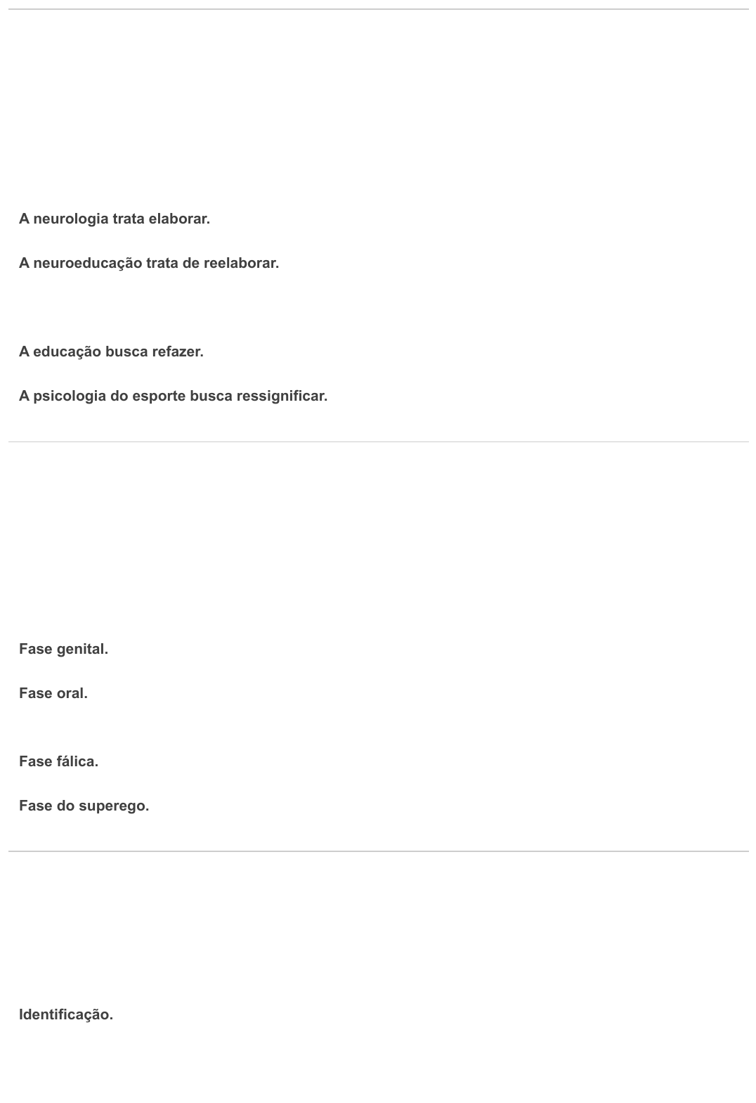 Pergunta 1 Assinale a alternativa que indica qual área estuda o seguinte questionamento: Por que as pessoas são diferentes? A neurologia trata elaborar. A neuroeducação trata de reelaborar. Resposta corretaA psicologia da personalidade tenta responder. A educação busca refazer. A psicologia do esporte busca ressignificar. Pergunta 2 Qual é o período do desenvolvimento da personalidade que a criança começa a ser capaz de se identificar com os outros? Resposta corretaFase de latência. Fase genital. Fase oral. Fase fálica. Fase do superego. Pergunta 3 Qual é o mecanismo de defesa que a mente usa de maneira inconsciente para transferir uma reação a um objeto ou pessoa para outro objeto e outra pessoa? Identificação. Resposta corretaDeslocamento. Consciente. Inconsciente. Pré-consciente. Pergunta 4 G. Allport descreveu a natureza do desenvolvimento da personalidade que chamou de proprium. Qual dessas fases é a do desenvolvimento do eu corpora? Quando a autoidentificação aumenta quando as crianças aprendem o próprio nome. 4 e 5 anos, quando as crianças passam a receber quem faz parte do seu mundo. Quando as crianças elaboram uma imagem real e outra imaginária. Resposta correta 1 e 3 anos, quando as crianças ficam cientes de sua existência. Quando as crianças aprendem a ter orgulho de suas conquistas. Pergunta 5 Quais são os dois métodos pelos quais o indivíduo aprende a resolver as frustações, os conflitos e os medos segundo Freud? Extroversão e superego. Id e Ego. Resposta corretaIdentificação e deslocamento. Superego e id. Introversão e identificação. Pergunta 6 Qual teórico estabeleceu seu estudo da personalidade com perspectiva analítica? Sigmund Freud. Carl Rogers. William James. G. Allport. Resposta corretaCarl Jung. Pergunta 7 Qual teórico postulou seu estudo em pressuposto de tendência atualizante? Resposta corretaCarl Rogers. Sigmund Freud. Skinner. Heidgger. W. James. Pergunta 8 Quais são os nomes dos arquétipos que estão enraizados em nosso inconsciente coletivo de acordo com o teórico Carl Jung? Sombra e animus. Persona e inconsciente. Anima e persona. Resposta corretaAnima e animus. Inconsciente pessoal. Pergunta 9 Em relação às fases do desenvolvimento da personalidade de G. Allport. Qual a fase que a criança começa a perceber que sua identidade permanece intacta apesar de acontecer várias mudanças em sua volta, quando elas aprendem o próprio nome? Eu corporal. Autoestima. Resposta corretaIdentificação do self. Autoimagem. Extensão do eu. Pergunta 10 Qual é o estágio do desenvolvimento da personalidade, o qual, segundo Freud, é a principal fonte de prazer e alimentação? Fase anal. Fase fálica. Período de latência. Fase genital. Fase oral.