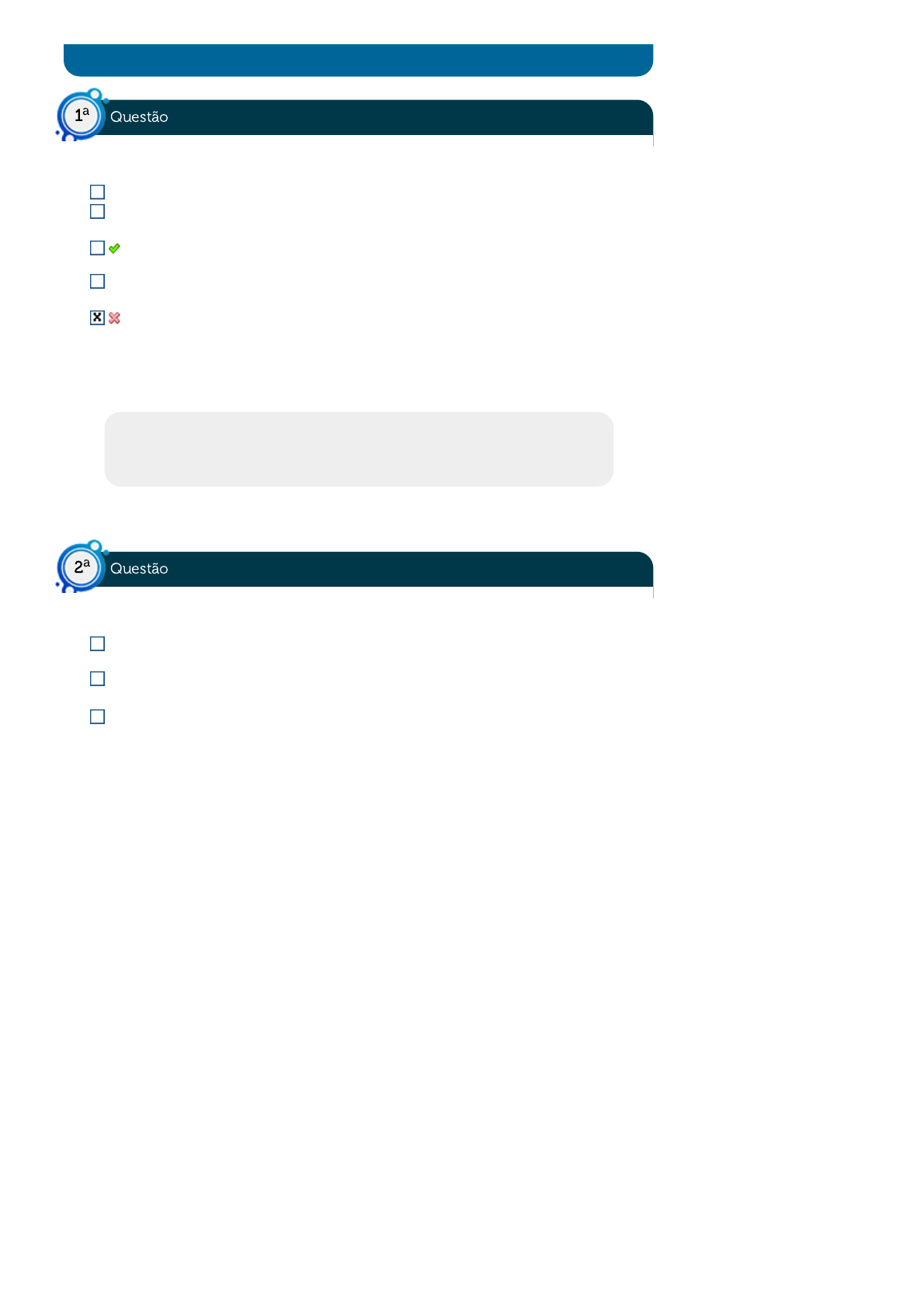 29/10/2021 08:52 Estácio: Alunos https://simulado.estacio.br/alunos/?p0=490800060&user_cod=2958798&matr_integracao=202007059867 1/1 Acertos: 4,0 de 10,0 05/10/2021 Acerto: 0,0 / 1,0 É correto afirmar em relação aos mecanismos de termorregulação: Os receptores cutâneos são eminentemente sensíveis ao calor. Para aumentar a dissipação de calor, o hipotálamo induz vasoconstrição cutânea e aumento da sudorese. É mediada por centros nervosos localizados no hipotálamo, que recebe informações de receptores periféricos e centrais. Os calafrios não têm influência sobre a taxa metabólica basal, sendo apenas uma reação reflexa a baixas temperaturas. Os receptores da área pré-ótica hipotalâmica são principalmente sensíveis ao frio. Respondido em 07/10/2021 15:56:48 Explicação: A resposta certa é: É mediada por centros nervosos localizados no hipotálamo, que recebe informações de receptores periféricos e centrais. Acerto: 1,0 / 1,0 A hipóxia consiste em: Dessaturação da oxihemoglobina em virtude do excesso de dióxido de carbono. Diminuição da pO2 ambiente para níveis abaixo de 760mmHg. Dimuinição do VO2máx tipicamente observada em altitude. Questão1 a Questão2 a