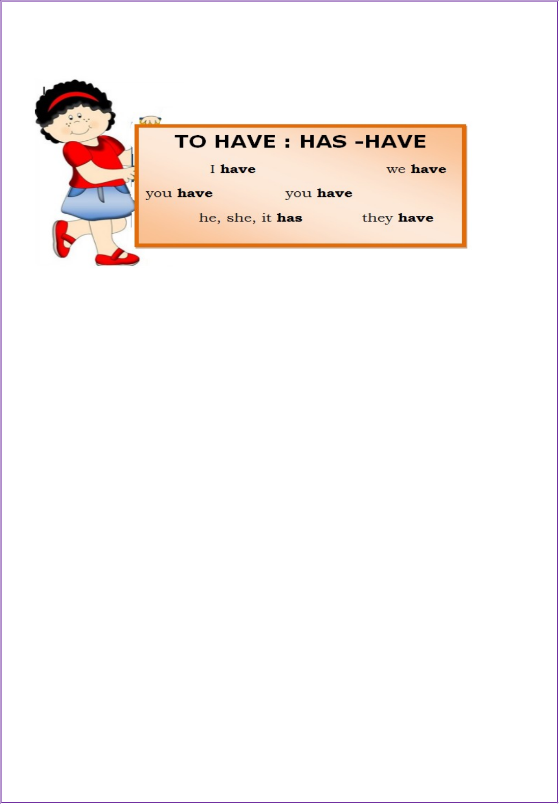 ESCOLA MUNICIPAL OLAVO BILAC ALUNO (A): _________________________________________ 8º ANO PROFESSORA: JOYCE DATA: 06/09/2021 DISCIPLINA: LÍNGUA INGLESA Complete com have ou has. Observe a tabela acima. a. She _______ a weak spot for him. b. I _______ been to the school today c. My brother _______ a new car. d. _______ Mary written the letter yet? e. How _______ you been? f. Everybody _______ a right to speak. g. They _______ been gone for six days now. h. You _______ to be back at 3 pm. i. The cow _______ a long black tail. j. Dad and Mom _______ bought a new house. k. The bus _______ four doors. l. The team _______ lost eight games this season. m. I _______ a bike. n. I _______ never been to the Germany. Have you? o. My bedroom _______ three small windows. p. I only _______ a sister.Good Luck! q. You _______ a nice house.