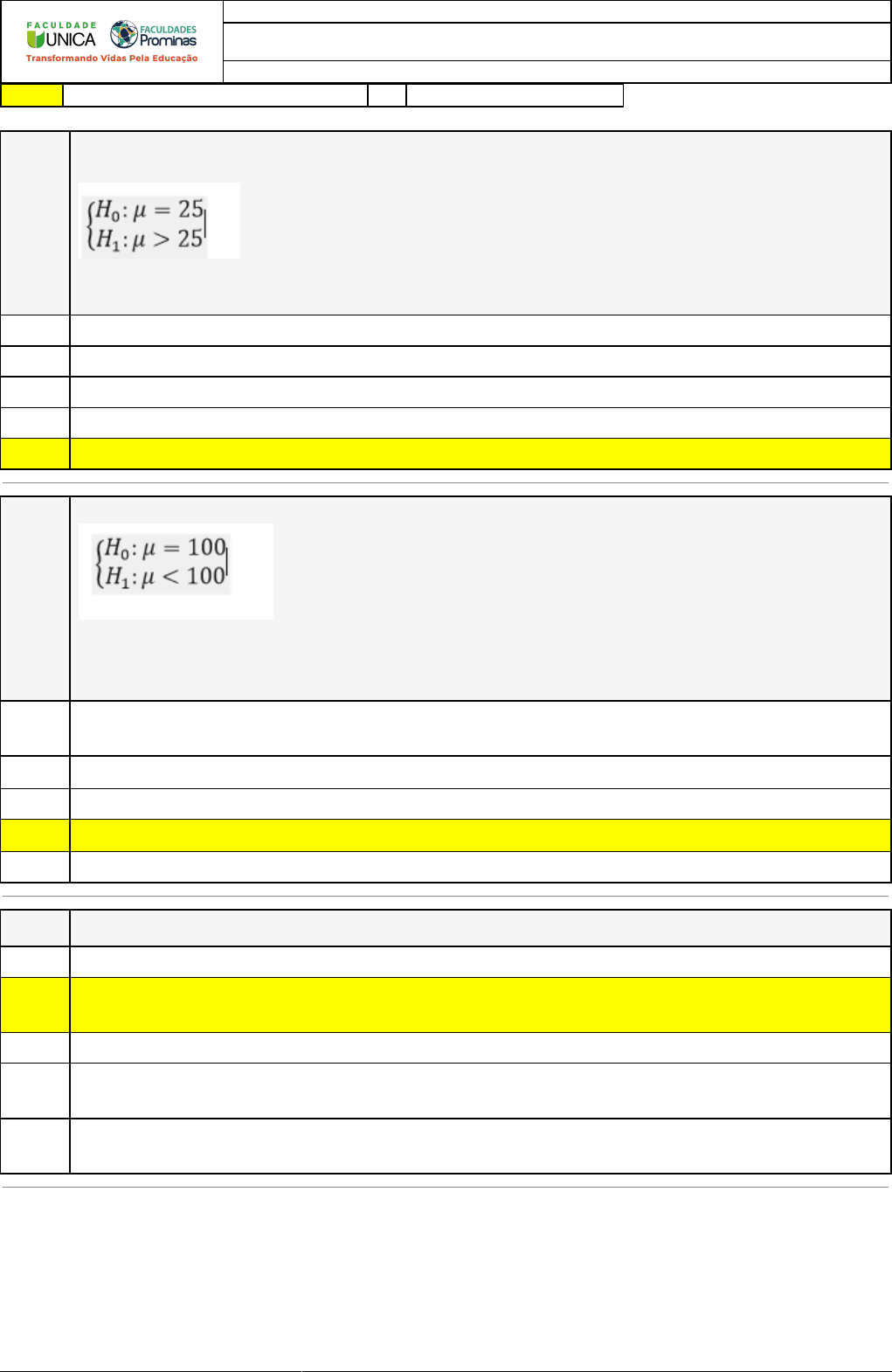 30/10/2021 23:03:28 1/2 REVISÃO DE SIMULADO Nome: MARTA MORAES Disciplina: Respostas corretas são marcadas em amarelo X Respostas marcardas por você. Questão 001 Suponha que uma amostra de tamanho n = 49 tenha sido extraída de uma população cuja variância seja σ = 14 para testar a seguinte hipótese sobre a média populacional: Suponha ainda que a média encontrada na amostra tenha sido X = 30 . Sendo assim, calcule a estatística de teste (Z) e assinale a alternativa correta. A) Z = 0,7 B) Z = 1,5 C) Z = 0,5 D) Z = 2,0 X E) Z = 2,5 Questão 002 Considere o seguinte teste de hipóteses: Suponha que estejamos realizando este teste com um nível de significância de 5% (ou seja, α = 0,05) e tenhamos encontrado um p-valor igual a 0,001. Neste caso, assinale a alternativa correta A) Não há evidência suficiente para afirmarmos que a média populacional seja menor que 100 B) Devemos aceitar H0. C) Nada pode ser afirmado com este teste. X D) Devemos rejeitar H0. E) Trata-se de um teste bilateral. Questão 003 Assinale a alternativa correta no que se refere a testes de hipóteses A) O valor de referência considerado depende apenas do nível de significância do teste. X B) Devemos rejeitar a hipótese nula sempre que o p-valor for menor que o nível de significância. C) Nenhuma das alternativas anteriores está correta. D) A estatística de teste para a média populacional sempre seguirá uma distribuição normal padrão, E) Não devemos rejeitar a hipótese nula quando o p-valor for menor que o nível de significância. 30/10/2021 23:03:28 2/2 Questão 004 Seja o seguinte teste de hipóteses: Suponha que tenha sido encontrada uma estatística de teste igual a 1,41 e que o valor de referência seja 1,96. Neste caso, assinale a alternativa correta. A) Devemos aceitar H0. B) Trata-se de um teste unilateral X C) Há evidência suficiente para afirmarmos que a média populacional não é igual a 2,50 D) Nada pode ser afirmado com este teste. E) Devemos rejeitar H0.