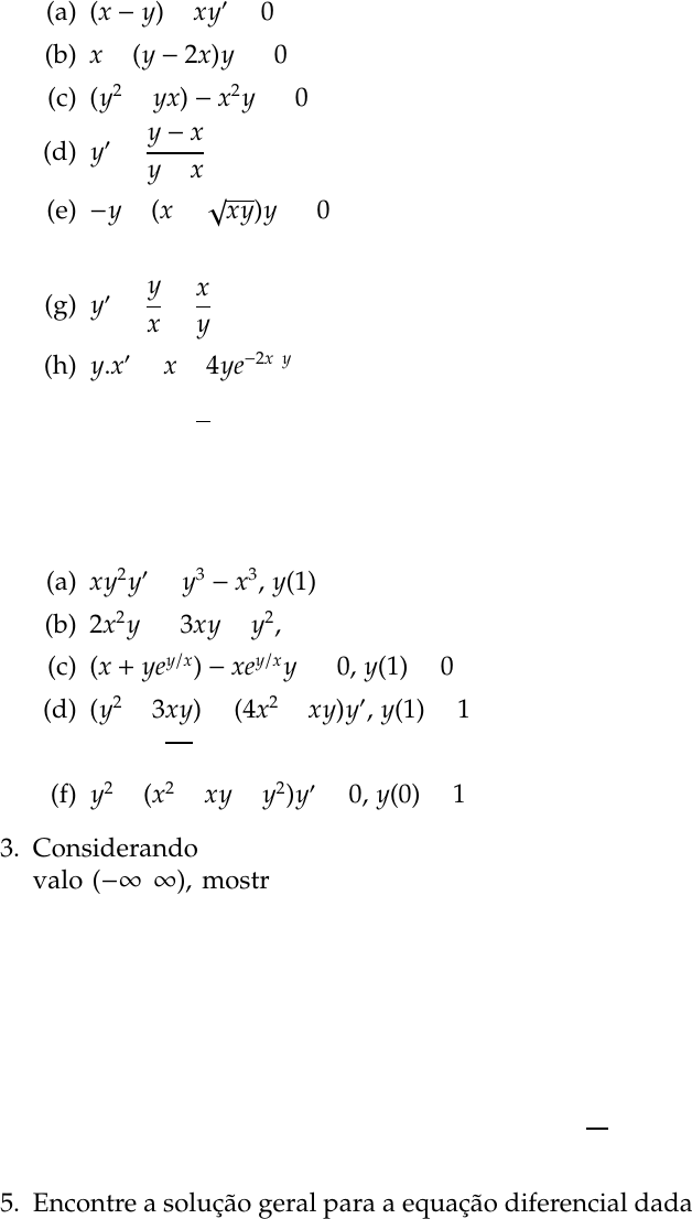 Lista de Exercı́cios 04 - EDO - 2015.2 1. Resolva a equação diferencial dada usando uma substituição apropriada: (a) (x − y) + xy′ = 0 (b) x + (y − 2x)y′ = 0 (c) (y2 + yx) − x2y′ = 0 (d) y′ = y − x y + x (e) −y + (x + √ xy)y′ = 0 (f) 2x2y = (3x3 + y3)y′ (g) y′ = y x + x y (h) y.x′ = x + 4ye−2x/y (i) ( y + cotg y x ) − xy′ = 0 (j) (x2 + xy − y2) − xyy′ = 0 2. Resolva cada problema de valor inicial a seguir: (a) xy2y′ = y3 − x3, y(1) = 2 (b) 2x2y′ = 3xy + y2, y(1) = −2 (c) (x + yey/x) − xey/xy′ = 0, y(1) = 0 (d) (y2 + 3xy) = (4x2 + xy)y′, y(1) = 1 (e) (x + √ xy)y′ + x − y = x−1/2y3/2, y(1) = 1 (f) y2 + (x2 + xy + y2)y′ = 0, y(0) = 1 3. Considerando que y = c1 + c2x2 é uma famı́lia de soluções de xy′′ − y′ = 0 no inter- valo (−∞,∞), mostre que não existe nenhum membro desta famı́lia que satisfaça as condições iniciais y(0) = 0, y′(0) = 1; isto é, não podem ser encontradas as constantes c1 e c2. Explique por que isso não viola o teorema visto em sala que fala a respeito da existência de uma única solução para problemas deste tipo. 4. Dado que x(t) = c1. cosθt + c2.senθt é a solução geral de x′′ + θ2x = 0 no intervalo (−∞,∞) mostre que uma solução que satisfaça x(0) = x0 e x′(0) = x1 é dada por x(t) = x0 cosθt + x1 θ senθt 5. Encontre a solução geral para a equação diferencial dada (a) 4y′′ + y′ = 0 (b) y′′ − 36y = 0 (c) y′′ + 9y = 0 (d) y′′ − y′ − 6y = 0 (e) y′′ + 8y + 16y = 0 (f) y′′ + 3y′ − 5y = 0 1 maia.souza@hotmail.com Realce maia.souza@hotmail.com Realce maia.souza@hotmail.com Realce maia.souza@hotmail.com Realce maia.souza@hotmail.com Realce maia.souza@hotmail.com Realce maia.souza@hotmail.com Realce maia.souza@hotmail.com Realce maia.souza@hotmail.com Realce maia.souza@hotmail.com Realce maia.souza@hotmail.com Realce maia.souza@hotmail.com Realce maia.souza@hotmail.com Realce maia.souza@hotmail.com Realce maia.souza@hotmail.com Realce maia.souza@hotmail.com Realce maia.souza@hotmail.com Realce (g) 12y′′ − 5y′ − 2y = 0 (h) y′′ − 4y′ + 5y = 0 (i) 3y′′ + 2y′ + y = 0 6. Resolva cada problema de valor inicial dado: (a) y′′ + 16y = 0, y(0) = 2, y′(0) = −2 (b) y′′ + 6y′ + 5y = 0, y(0) = 0, y′(0) = 3 (c) 2y′′ − 2y′ + y = 0, y(0) = −1, y′(0) = 0 (d) y′′ + y′ + 2y = 0, y(0) = y′(0) = 0 (e) y′′ − 3y′ + 2y = 0, y(1) = 0, y′(1) = 1 Gabarito 1. (a) x. ln |x| + y = cx (b) (x − y) ln |x − y| = y + c(x − y) (c) x + y ln |x| = cy (d) ln(x2 + y2) + 2.arctg(y/x) = c (e) 4x = y(ln |y| − c)2 (f) y9 = c(x3 + y3)2 (g) (y/x)2 = 2 ln |x| + c (h) e2x/y = 8 ln |y| + c (i) x cos(y/x) = c (j) y + x = cx2ey/x 2. (a) y3 + 3x3 ln |x| = 8x3 (b) y2 = 4x(x + y)2 (c) ln |x| = ey/x − 1 (d) 4x ln |y/x| + x ln x + y − x = 0 (e) 3x3/2 ln x + 3x1/2y + 2y3/2 = 5x3/2 (f) (x + y) ln |y| + x = 0 3. 4. 5. (a) y = c1 + c2e−x/4 (b) y = c1e−6x + c2e6x (c) y = c1 cos 3x + c2sen3x (d) y = c1e3x + c2e−2x (e) y = c1e−4x + c2xe−4x (f) y = c1e(−3+ √ 29)x/2 + c2e(−3− √ 29)x/2 (g) y = c1e2x/3 + c2e−x/4 2 maia.souza@hotmail.com Realce (h) y = e2x(c1 cos x + c2senx) (i) y = e−x/3 ( c1 cos √ 2 3 x + c2sen √ 3 2 x ) 6. (a) y = 2 cos 4x − 1 2 sen4x (b) y = − 3 4 e−5x + 3 4 e−x (c) y = −ex/2. cos(x/2) + ex/2sen(x/2) (d) y = 0 (e) y = e2(x−1) − ex−1 3