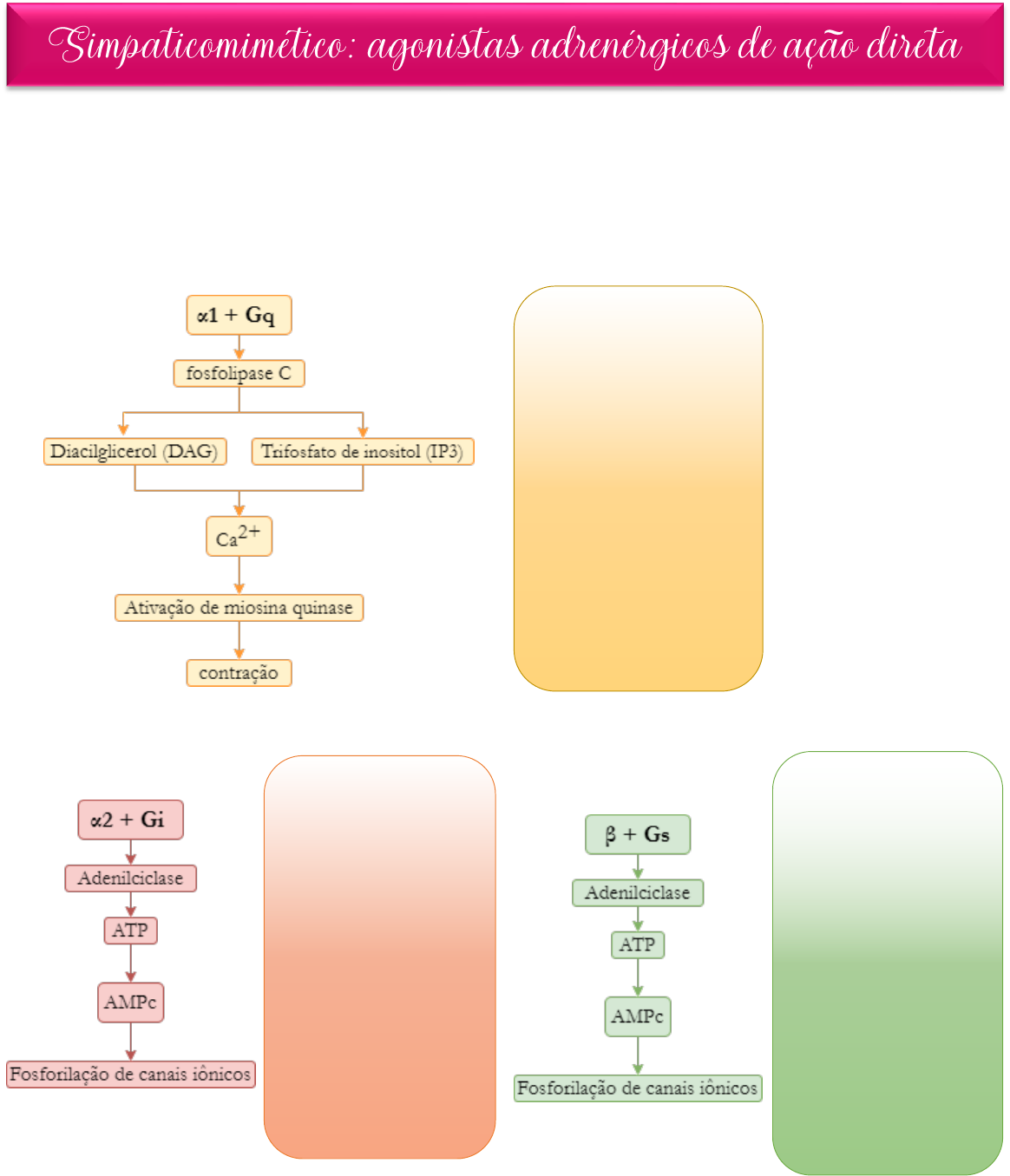 - simpatomiméticos: são fármacos que imitam a função dos componentes simpáticos, ou seja, mimetizam a ação da noradrenalina e da adrenalina. Receptores adrenérgicos são acoplados à proteína G Todos esses receptores são acoplados à proteína G Cada receptor tem afinidade por uma classe de proteína G Os efeitos dependem da ação de segundos mensageiros e da atividade de canais iônicos Um agonista quando acoplado a um adrenorreceptor alfa- 1 ativa a proteína associada a Gq, levando à formação de DAG e IP3, e consequentemente ocorre aumento de cálcio intracelular, permitindo a ativação de miosina quinase e promovendo contração. Um agonista quando acoplado a um adrenorreceptor alfa-2 faz com que ocorra dissociação da proteína G inibitória, inibindo o adenilciclase, reduzindo níveis de ATP e de AMPc e, consequentemente reduzindo a fosforilação de canais iônicos. Um agonista quando acoplado a um adrenorreceptor beta, faz com que ocorra ativação da proteína G acoplada, ativando adenilciclase, aumentando níveis de ATP e de AMPc e, consequentemente favorecendo a fosforilação de canais iônicos. α: norepinefrina > epinefrina > isoprenalina β: isoprenalina > epinefrina > norepinefrina Efeitos da ativação dos receptores: α₁ - vasoconstrição, relaxamento da musculatura lisa gastrointestinal, secreção salivar e glicogenólise hepática; α₂ - inibição da liberação de neurotransmissores, causada pela abertura de canais de K+ e e inibição dos canais de Ca2+; agregação plaquetária, contração de músculo liso vascular, inibição da liberação de insulina; β₁ - aumento da frequência e da força de contração cardíaca, hipertrofia cardíaca tardia; β₂ - broncodilatação, vasodilatação, relaxamento da musculatura lisa visceral, glicogenólise hepática e tremores musculares; β₃ - lipólise e termogênese, relaxamento do músculo detrusor da bexiga. Subtipo Localização α1 Vasos de resistência α2 Pré-sinápticos β1 Coração β2 Brônquios e vasos (músculos esqueléticos) β3 Células adiposas Epinefrina/adrenalina: - afinidade relativa - α₁ = α₂; β₁ = β₂ - uso clínico: Choque anafilático: vasopressoras mais potente + Anestésicos locais: vasoconstrição prolonga efeito Asma (emergência): relaxamento ML brônquico Parada cardíaca: força de contração, DC, PA sistólica - efeitos adversos: Hipertensão Vasoconstrição Taquicardia/arritmias Tremor Cefaleia pulsátil - observação: Ineficaz quando administração por via oral O seu metabolismo ocorre no fígado pela MAO e COMT Norepinefrina/noradrenalina - afinidade relativa - α₁ = α₂; β₁ >> β₂ ↑ PA, Resistência Periférica Total (RPT), por conta de muita ação em α1 e β1 ↑ FC: efeito superado pela atividade vagal - Usos clínicos: Choque cardiogênico/séptico ↑ ou mantém a PA em UTIs + Anestésicos locais - efeitos adversos: Hipertensão Vasoconstrição Taquicardia Dopamina - afinidade relativa - D1 = D2 >> β >> α - precursor metabólico da norepinefrina - Doses <2 g/kg/min: D1 vasculares renais, mesentéricos e coronarianos = ↑ AMPc = vasodilatação - Doses 2-10 g/kg/min: inotropismo positivo - Ineficaz via oral (metabolizada) - Via intravenosa: bomba de infusão (lentamente) Em baixas doses (<2 g/kg por min) atua predominantemente sobre os receptores dopaminérgicos D1 nos leitos vasculares renal, mesentérico e coronariano. Ativam a adenilil ciclase nas células musculares lisas vasculares, resultando em aumento dos níveis de cAMP e em vasodilatação. ↑ Taxa de filtração glomerular e fluxo sanguineo renal, efeitos farmacologicamente apropriados no tratamento de estados de baixo débito cardíaco associados ao comprometimento da função renal, como a insuficiência cardíaca congestiva grave. Com uma velocidade suprafisiológica de infusão (2-10 g/kg por min), a dopamina atua como agente inotrópico positivo através da ativação dos receptores b1-adrenérgicos. Antes de administrar DA a pacientes em estado de choque, deve-se corrigir a hipovolemia com infusão de sangue total, plasma ou outro líquido apropriado. - Uso clínico: Insuficiência renal; Insuficiência cardíaca congestiva grave; Choque cardiogênico/séptico - Efeitos adversos: Vômitos; Náuseas; Arritmias; Vasoconstrição periférica. Isoprenalina (isoproterenol) - afinidade relativa; - β1 = β2 > > >> α - Não possui seletividade, é uma das suas desvantagens e motivo pelo qual é pouco usada clinicamente; - Sua ação em receptores α é insignificante; - produz intensa estimulação cardíaca, aumentando a frequência, a contratilidade e o débito e é um potente broncodilatador, mas seu uso foi substituído por b2 seletivos; - Infusão intravenosa lenta e contínua. - Uso clínico (hospitalar): ↑ força e frequência de contração, DC, PA (compensada com vasodilatação/β2 (↓ RPT); Emergências bradicárdicas; Pacientes com arritmia ventricular; - Efeitos adversos: Taquicardia; Arritmias Dobutamina: - afinidade relativa; - β1 > β2 > > >> α - aumenta o débito cardíaco e o volume sistólico, habitualmente sem aumento pronunciado da frequência cardíaca. A pressão arterial e a frequência cardíaca podem aumentar significativamente durante a administração de dobutamina, exigindo redução da velocidade de infusão. - Seletividade para β1; - Efeito + inotrópico que cronotrópico = ↑ contratilidade, DC e volume sistólico; - infusão intravenosa lenta e contínua; - Uso clínico: Descompensação cardíaca após cirurgia cardíaca ou vascular; Insuficiência cardíaca ou infarto agudo do miocárdio; Choque cardiogênico ou séptico; - Efeitos adversos: Aumento da pressão arterial; Aumento da frequência cardíaca; Fenilefrina, Oximetazolina, Nafazolina, Metaraminol - afinidade relativa; - α1 > α2 >>>>> β -considerável seletividade por α1; - Uso clínico: Descongestão nasal; Midriáticos em formulações oftálmicas; Exam