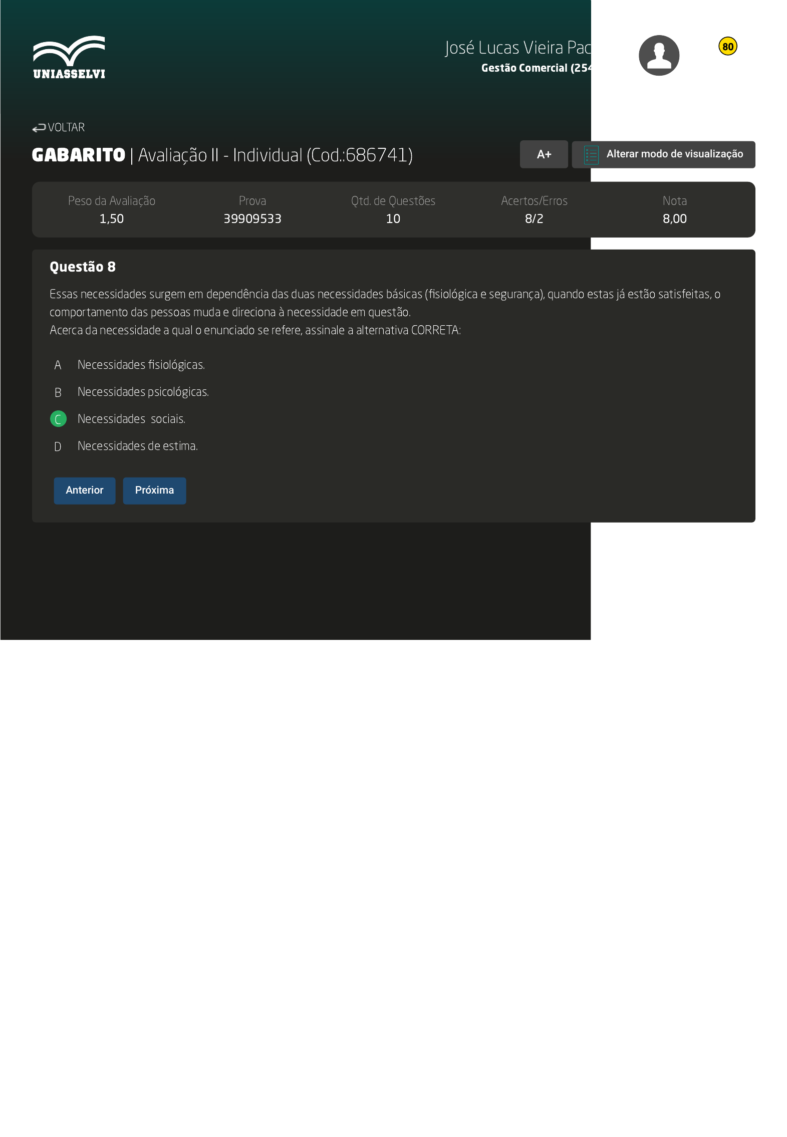 GABARITO | Avaliação II - Individual (Cod.:686741) Peso da Avaliação 1,50 Prova 39909533 Qtd. de Questões 10 Acertos/Erros 8/2 Nota 8,00 Questão 8 Essas necessidades surgem em dependência das duas necessidades básicas (fisiológica e segurança), quando estas já estão satisfeitas, o comportamento das pessoas muda e direciona à necessidade em questão. Acerca da necessidade a qual o enunciado se refere, assinale a alternativa CORRETA: A Necessidades fisiológicas. B Necessidades psicológicas. C Necessidades sociais. D Necessidades de estima. VOLTAR A+ Alterar modo de visualização Anterior Próxima José Lucas Vieira Pacheco Gestão Comercial (2542052) 80