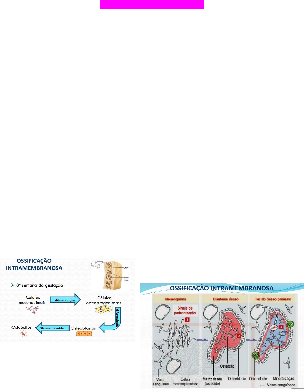 Ossificação intramembranosa O osso se desenvolve através da substituição de um tecido conjuntivo preexistente. Na ossificação intramembranosa, o tecido ósseo é depositado diretamente no tecido conjuntivo embrionário ou mesênquima. O mecanismo de formação óssea durante a ossificação intramembranosa ocorre da seguinte forma: primeiro uma rede trabecular primária, chamada de esponjosa primária, é depositada e, subsequentemente, transformada em osso maduro. Natureza do molde que se transforma em osso: mesenquimal. 1) O tecido conjuntivo embrionário (mesênquima) torna-se altamente vascularizado e células-tronco mesenquimais agregam-se sem um intermediário de cartilagem enquanto ainda estão mergulhadas em uma matriz extracelular contendo fibras colágenas e proteoglicanos. Processo esse controlado por sinais de modelagem provenientes de polipeptídeos- fator de crescimento de fibroblasto, fator de crescimento de transformação, etc. 2) Células tronco mesenquimais agregadas diferenciam-se diretamente em osteoblastos que começam a secretar a matriz óssea ou osteoide. Forma-se um blastema ósseo, isto é, região formada por osteoblastos, que revestem a superfície do blastema ósseo + tecido mesenquimal-dentro. Numerosos centros de ossificação se desenvolvem e, eventualmente se fundem, formando uma rede de trabéculas anastomosadas que lembram uma esponja, chamadas de osso esponjoso ou esponjosa primária; 3) Já que as fibras colágenas das novas trabéculas formadas são orientadas randomicamente, o osso intramembranoso precoce é descrito como tecido ósseo entrelaçado (imaturo), em contraste com as fibras colágenas regularmente orientadas do tecido ósseo lamelar ou compacto (maduro), formando mais tardiamente durante o remodelamento ósseo; 4) Osteoblastos depositam matriz óssea de forma aposicional, principalmente de colágeno tipo 1 e proteínas não colagenosas. Mais tarde, o cálcio transportado pelos vasos sanguíneos é utilizado no processo de mineralização e forma-se o tecido ósseo primário. Fosfato de cálcio é depositado na matriz óssea, que cresce por aposição. Não ocorre crescimento ósseo intersticial; 5) A mineralização da matriz óssea leva a dois novos eventos: Aprisionamento de osteoblastos (como osteócitos) dentro da matriz óssea mineralizada, que é remodelada pelos osteoclastos que reabsorvem osso; Fechamento parcial dos canais perivasculares, que assumem o novo papel de hematopoese através da conversão de células mesenquimais em células que formam o sangue. Osso imaturo Trabécula de um osso intramembranoso em formação Matriz óssea não calcificada Blastema ósseo: vários osteoblastos ao redor da matriz óssea Trabécula Espícula óssea Formação de outra espícula óssea Vasos sanguíneos presentes no tecido mesenquimal que ficarão presos na matriz óssea Blastema ósseo: espícula óssea recoberta por osteoblastos. Matriz óssea não calcificada e osteócito Osteoclasto: remodelação- dá forma ao tecido ósseo Lacunas de Haiship: região onde o esteoclasto está degradando a matriz óssea Matriz óssea calcificada uniforme: colágeno + proteínas não coleganosas Osteócito Osteoclasto: célula multinucleada Osteoblasto Formação de tecido muscular Folículos pilosos Tecido conjuntivo Formação de espícula óssea Tecido mesenquimal Células mesenquimais não diferenciadas Espícula ósssea Tecido muscular Osteoclasto Osteoblasto Lacuna com osteócito Vasos com hemácias que darão origem aos canais de Havers ou Volkan