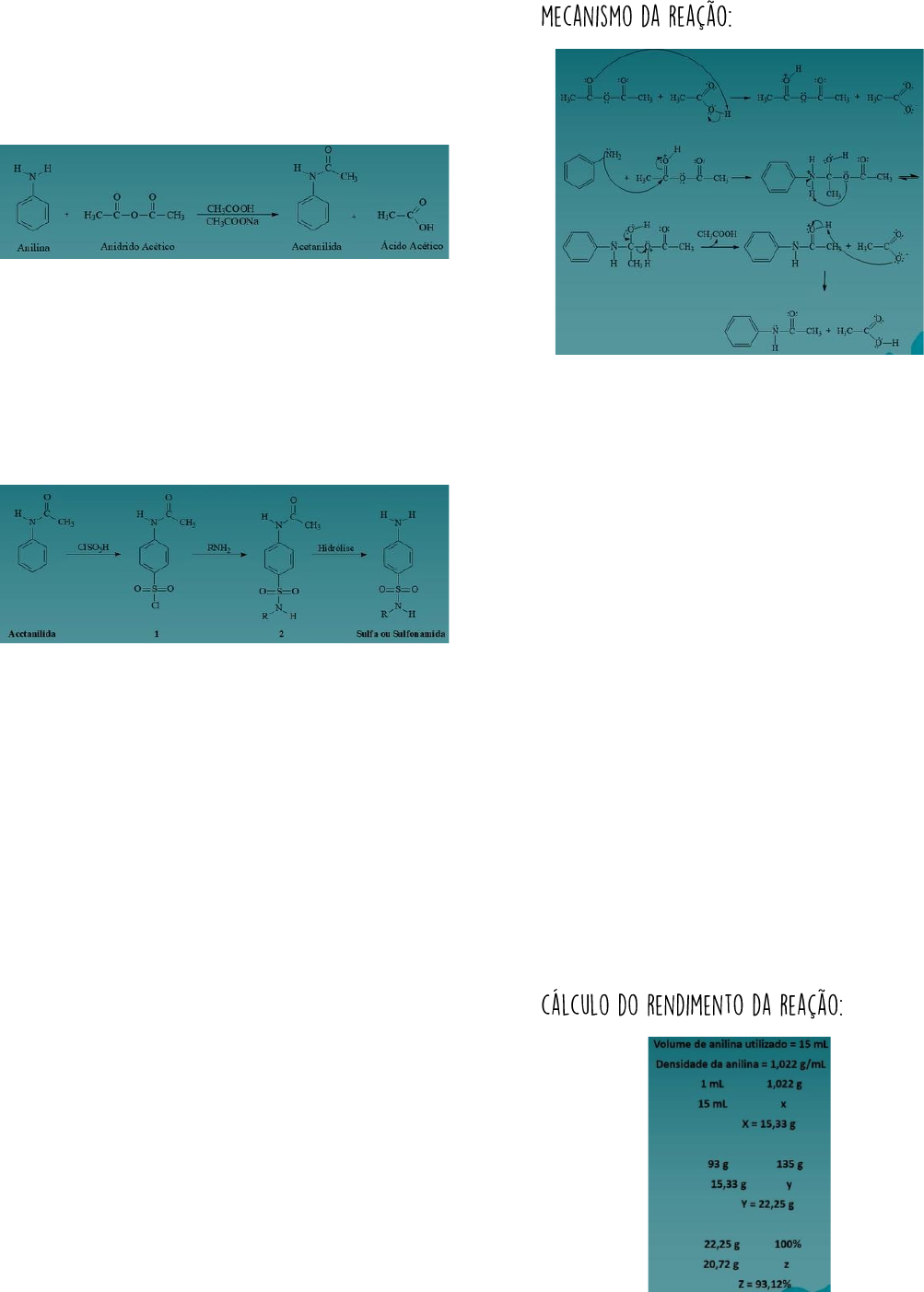 Síntese e Purificação da Acetanilida ❖ É acrescentado o anidrido acético à anilina na presença de ácido acético e acetato de sódio para formar acetanilina (produto principal) e ácido acético (produto secundário) ❖ A acetanilida já foi utilizada como fármaco e deixou de ser, mas ainda possui seu uso far- macêutico, que envolve seu uso na indústria como material de partida da síntese de sulfas ou sulfonamidas (substâncias que possuem ati- vidade antibacteriana) ❖ Inicialmente, a acetanilida é tratada com ácido clorosulfônico (ClSO3H), gerando um interme- diário 1 que sofre reação com uma amina pri- mária, gerando um intermediário 2 que sofre reação de hidrólise, formando a sulfa ou sulfo- namida ❖ Geralmente o grupo R do intermediário 2 é um grupo heteroaromático ❖ Substrato é a substância que sofre modifica- ção molecular para formar o produto principal ❖ A natureza da reação (se é nucleofílica ou ele- trofílica) é definida pelo caráter do reagente ❖ A reação de síntese de acetanilida é de subs- tituição eletrofílica ❖ ▪ Inicialmente, há uma protonação de um dos oxigênios do anidrido acético pelo hi- drogênio do ácido acético, gerando anidri- do acético protonado e a base conjugada do ácido acético ▪ O ácido acético atua na reação como um catalisador ▪ O anidrido acético protonado é uma subs- tância instável, porque há uma carga posi- tiva em um átomo eletronegativo ▪ Quanto mais instável, mais reativo ▪ Assim, a tendência do oxigênio é puxar elétrons do carbono ligado a ele, fazendo com que o carbono adquira carga positiva e tenha caráter eletropositivo mais acen- tuado, sendo mais reativo e tendo o áci- do acético como catalisador ▪ Há liberação de 1 mol de ácido acético du- rante a reação ❖ ▪ 1 mL de anilina está para 1,022 gramas, en- tão quantos gramas de anilina há em 15 mL que foi usado na reação? ▪ 1 mol de anilina (93g) está para 1 mol de acetanilida (135g), então quantos gramas de acetanilida são formados com 15,33g de anilina? ▪ Se 22,25g era para ser a massa total obti- da e foram obtidos 20,72g, qual a porcen- tagem? ❖ A presença de impurezas afeta o rendimento, tanto no reagente quanto no substrato, fazen- do com que seja difícil haver um rendimento de 100%, mas não impossível ❖ Reações paralelas e falta de habilidade do ope- rador também afetam o rendimento ❖ Quanto menor a temperatura da água, menor vai ser a solubilidade da acetanilida nela e maior será a precipitação ❖ ▪ Se 93g de anilina correspondem a 102g de anidrido acético, quantos gramas de anidrido são formados com 15,33g de anili- na usados na reação? ▪ Se 1 mL de anidrido acético corresponde a 1,083g, quantos mL há em 16,81g? ▪ Se inicialmente foram usados 17mL de ani- drido e somente 15,52mL foram usados na reação, qual o excesso? ❖ Em qualquer reação, geralmente o reagente é usado em excesso, já que pode conter im- pureza e para deslocar a reação no sentido desejado, ou seja, na formação do produto ❖ Em qualquer que seja a recristalização, é ne- cessário usar um solvente no qual o produto desejado seja solúvel a quente e insolúvel a frio, para que não haja a diluição e sim a re- cristalização ❖ ▪ Se haver a adição de anidrido acético de forma rápida e brusca, já que a reação é exotérmica, pode haver excesso de calor suficiente para causar a decomposição do reagente ou até mesmo do produto for- mado ▪ O produto é límpido, porque a acetanilida é solúvel no líquido majoritário, que é o ácido acético ▪ À medida que após a adição da água, ela passou a ser o líquido majoritário da mis- tura e ocorreu a precipitação de acetanili- da, tendo como objetivo o seu isolamento ▪ O resfriamento aumenta a precipitação da acetanilida e favorece o maior rendi- mento da reação Análise da Acetanilida ❖ Serão feitos testes qualitativos e quantitativos ❖ Para que esteja apropriada para uso farma- cêutico, a acetanilida deve ter no máximo 0,5% de impurezas ❖ Resultado de rendimento (traduz a massa de produto obtido na reação) é diferente de re- sultado de doseamento (teor de pureza da a- mostra sintetizada) ❖ ▪ Cristais brancos, brilhantes em forma de escamas ou pó cristalino branco ▪ É inodora, estável ao ar e de sabor ácido fugaz, passando ao amargo picante com a sensação de calor ▪ Sua solução é neutra ao papel indicador de pH, pois o nitrogênio está duplamente conjugado, fazendo com que o par de elétrons esteja preso e não consegue ser facilmente doado, não conseguindo ser um composto básico ❖ ▪ Levemente solúvel em água ▪ Livremente solúvel em água fervente, em éter etílico, em clorofórmio, em álcool etílico e em acetona ▪ Como a parte majoritária da acetanilida é composta pelo anel aromático, há a defini- ção de lipofilicidade ao composto, dificul- tando a solubilidade em água ▪ Entretanto, a acetanilida possui uma ami- da, que permite a formação da ligação de hidrogênio com a água e faz com que o composto não seja completamente inso- lúvel em água ▪ Quando há o aquecimento, há o aumento da energia do sistema, consequentemen- te aumentando a interação das moléculas e promove a dissolução da acetanilida em água fervente ❖ ▪ A mistura de ácido sulfúrico e dicromato de potássio gera ácido crômico, que é um oxidante e que promove a oxidação da acetanilida ▪ Quando a acetanilida se oxida, o cromo irá reduzir (de Cr+6 a Cr+3), gerando uma co- loração verde correspondente ao cromo ▪ Pega-se uma solução saturada de acetani- lida e adiciona água bromada (água + bro- mo) ▪ Há uma reação de substituição eletrofílica no anel aromático ▪ O grupo n-acetila do anel aromático é um grupo doador de elétrons, orientando a entrada do novo substituinte nas posições orto e para ▪ A principal formação