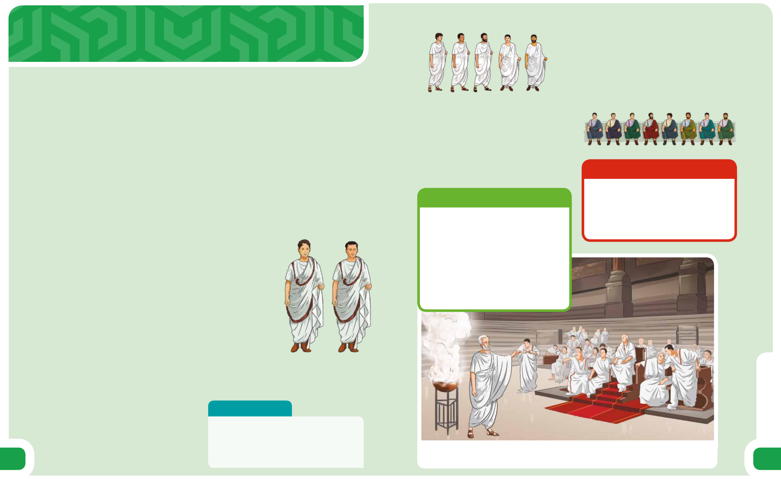 34 35 3.1 The beginnings of Ancient Rome The civilisation based in Ancient Rome began in about 500 bce. What was life like before the city of Rome was established? How was society in Rome organised? How were the Romans ruled? The founding of Rome The Romans were one tribe of people who lived on the Italian Peninsula. They decided to live together and establish a city. No-one is really sure when this happened, but it is traditional to say that the city of Rome was founded in 753 bce. A Roman kingdom To begin with, the Romans were ruled by kings from the Etruscan tribe who lived in lands nearby. In 509 bce, the Romans rebelled against these kings. Rome became a republic. Instead of having one ruler, the people started to elect their leaders. Who were the people of Rome? Men and women who were not slaves in the Roman Republic were citizens. Citizens were divided into two groups. Patricians came from wealthy families and owned land and property. Common people were called plebeians or ‘plebs’. Slaves were also part of Roman society. They could not be citizens and had no power. How was the Roman Republic governed? A government is a group of people who make the rules for a city or country. The government of the Roman Republic had three main parts: Magistrates and consuls Magistrates were leaders elected by the people. Every year two of the magistrates were elected to become consuls. The two consuls were in charge of Rome for one year. One consul led the government. The other consul was responsible for the army. Senators The senators formed a group called the Senate. Senators advised the consuls and approved or rejected laws. Senators decided how to spend public money and advised on Rome’s relationships with other countries. Tribunes and assemblies The tribunes were a group of citizens who represented the common people of Rome (the plebeians) within the government. The assemblies were made up of plebeians. The assemblies elected officials, such as the tribunes, and voted on laws. 3 A ncient Rom e Glossary words citizen elect founded patrician peninsula plebeian Senate This is what the Senate may have looked like. Senators debated important issues. They made speeches to try to convince others about their ideas. 1 Why do you think the Roman people rebelled against the Etruscan kings? Write a brief explanation. 2 Draw a simple diagram that explains the three levels of society in the Roman Republic. Activities The Romans displayed their most important laws on metal tablets called the Twelve Tables. Find out and write down three of these laws. Challenge 841812_OIPH_SB4_Unit_3.indd 34-35 22/09/2017 16:12 36 37 3.2 The Roman Empire begins Some individuals in the Roman Republic wanted more power for themselves. Who were these people? How did they change the way in which Rome was ruled? Who founded the Roman Empire? Roman power grows By 290 bce, the Romans controlled the whole Italian Peninsula. Expansion into Sicily brought the Romans into conflict with the Carthaginian Empire. In 146 bce, after 100 years of competition and three long wars, the Romans beat the Carthaginians. They took control of lands and trade around the Mediterranean. Glossary word culture Rome Carthage Mediterranean Sea Atlantic Ocean Tyrrhenian Sea Syracuse Carthaginian Empire Roman Republic & Allies Syracuse Capital Other notable city Key The Carthaginians competed with the Romans for trade across the Mediterranean. Trade was important because it provided resources and wealth. 3 A ncient Rom e Octavian was the first Roman Emperor and took the name Caesar Augustus. He ruled until his death in 14 ce. Did you know? When the Emperor Claudius invaded England in 43 ce, he had a group of war elephants in his army. The Britons had never seen elephants before and were probably terrified! 1 Write a brief explanation of why the Romans wanted to expand their empire. 2 Work in a group. Find out some facts about the first five emperors of the Roman Empire. Include when they ruled and why they are famous. Make a class poster that brings together all the information. Activities Use books and the Internet to find out about the road network built by the Romans. Write a report of between 100 and 200 words. Challenge ATLANTIC OCEAN BRITAIN GAUL MACEDONIA Byzantium ASIA MINOR ASIA AFRICA SYRIA ARABIA SPAIN Rome Mediterranean Sea Red Sea Tigris R.Euphrates R. Black Sea Alps Pyrenees Corsica Sardinia Sicily Crete Cyprus Danube R. Nile R. EGYPT Caspian Sea Rhine R. The orange area shows the Roman Empire in 117 ce. How did the Roman Empire begin? Rome was very powerful because of its strong army. The army generals sometimes fought with the Senate. Julius Caesar was a powerful Roman general. He took control of Rome in 49 bce. Some senators did not want a king-like ruler and so they killed him in 44 bce. Julius Caesar’s grand-nephew Octavian later seized power for himself and his name became Caesar Augustus. Augustus ended the Roman Republic and founded the Roman Empire in 27 bce. Augustus established a period known as the Pax Romana (which means Roman Peace) that lasted for 200 years. He also established a dynasty of rulers. The four emperors who came after him were Tiberius, Caligula, Claudius and Nero. Why did the Romans expand their empire? Roman emperors wanted to show their power. The Romans also wanted the valuable resources from the lands they conquered. People in conquered lands had to pay taxes to Rome. This money helped to pay for the Roman army and for managing the empire. How far did Roman territories reach? The Roman Empire was at its largest in 117 ce. The estimated population of the Roman Empire at that time was at least 60 million. This number was about one quarter of the world population at the time. The size of the empire meant that Roman culture had a huge influence across the world. The Roman Empire lasted until 476 ce. 841812_OIPH_SB4_Unit_3.indd 36-37 22/09/2017 16:12 38 39 3.3 Ancient Roman towns and cities Cities were centres