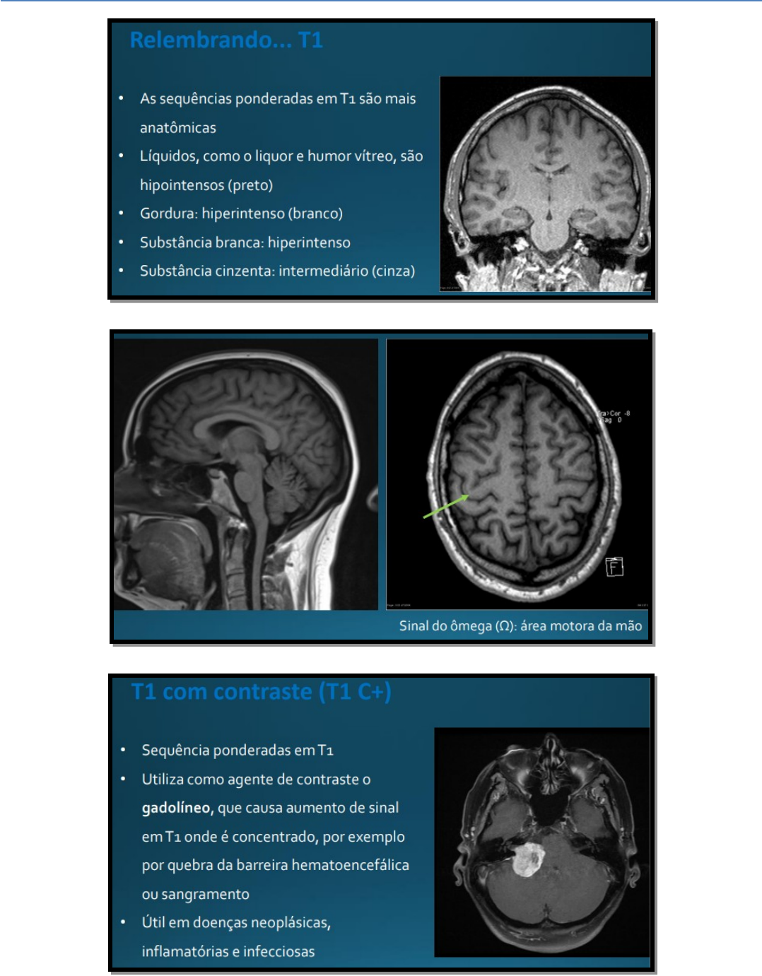 RM crânio - Sequências Avançadas Neurocisticercose: importante causa de convulsões em adultos. Perfusão · Sequência dinâmica que avalia a perfusão sanguínea cerebral. · Baseada na perda de susceptibilidade (T2*/SWI) nos capilares após passagem de contraste. · Parâmetros avaliados: - Cerebral Blood Volume (CBV). - Cerebral Blood Flow (CBF). - Mean Transit Time (MTT) = CBV/CBF quanto tempo o sangue fica nos capilares. · Útil para avaliação de AVC e delimitação de área isquêmica e penumbra. · Em tumores, diferencia as áreas mais “quentes” em tumores de alto grau. MTT aumentado, pois o fluxo está diminuído, fazendo com que o sangue passe mais devagar. · Em B, nódulo de perfusão fria (azul) é perfusão diminuída mais característico de tumor benigno (ex: astrocitoma pilocítico). · Em D, a parte de perfusão aumentada do tumor é a mais quente (vermelha) e a mais agressiva. Espectroscopia · Avalia a presença e concentração de diversos metabólitos, com ressonância em picos específicos. · Análise pode ser uni ou multi voxel. · Mais utilizados: - Lactato (1,33 ppm). - Lipídios (1,3). - N-acetil-aspartato (NAA) (2) marcador neuronal. - Glutamato (2,2-2,4). - Creatina (3). - Colina (3,2). - Mioinositol (3,5). Normal: curva ascendente (colina baixa e NAA alta). · NAA: marcador de viabilidade neuronal, diminuído em qualquer processo com lesão, como em tumores de alto grau, necrose, abscesso, etc. · Em gliomas, com o aumento do grau, há diminuição de NAA e creatina, e aumento da colina, lipídios e lactato inversão do pico colina - NAA. A e B: tumor de baixo grau. // C e D: tumor de alto grau (agressivo). · Aumento de colina e redução de NAA em morte neuronal (relação colina/NAA alta). · Pico de lipídio e lactato em áreas de necrose. Tractografia · Reconstrução 3D volumétrica dos tratos de fibras brancas, utilizando dados das sequências de difusão. · As moléculas de água se movimentam com mais facilidade no eixo longitudinal dos axônios. · Fibras transversais, Fibras anteroposteriores e Fibras craniocaudais. Perda de continuidade das fibras em azul. Ver para onde está deslocado e determinar o melhor local de entrada cirúrgica. CASO CLÍNICO · WSC, 28 anos, sexo masculino. · QD: Cefaleia esporádica há 5 anos. · HPMA: Refere cefaleia ocasional relacionada ao esforço físico, sem náusea ou piora com decúbito. Refere também baixa acuidade visual em olho esquerdo. · AP: Neurofibromatose tipo 1. · Exame Físico Geral: Presença de múltiplas manchas café-com-leite e neurofibromas. · Exame Físico Neurológico: Vigil, orientado, Pupilas isocóricas e fotorreagentes, Motricidade ocular extrínseca preservada, Baixa acuidade visual bilateral (pior à esquerda), Fundo de olho com palidez de disco óptico bilateral (sinal de hipertensão intracraniana), Força muscular grau 5 global, Reflexos osteotendíneos 2+/4+ global, Sensibilidade preservada globalmente, Eumetria e eudiadococinesia. RM DE CRANIO, EM CORTE AXIAL, EM T1 SEM CONTRASTE, lesão arredondada hipointensa no tegmento mesencefálico a direita. T1 COM CONTRASTE NÃO EVIDENCIA A LESÃO. LESÃO HIPERINTENSA EM T2, ALÉM DE HIDROCEFALIA. HIPERSINAL EM FLAIR E HIPERSINAL PERTO DO VENTRICULO Não restringe a difusão tumor de baixo grau. Compressão do aqueduto cerebral. Tumor sem perda neuronal. METÁSTASE CEREBRAL: lesões múltiplas, heterogêneas, realce periférico. VCM – VITÓRIA CORREIA MOURA