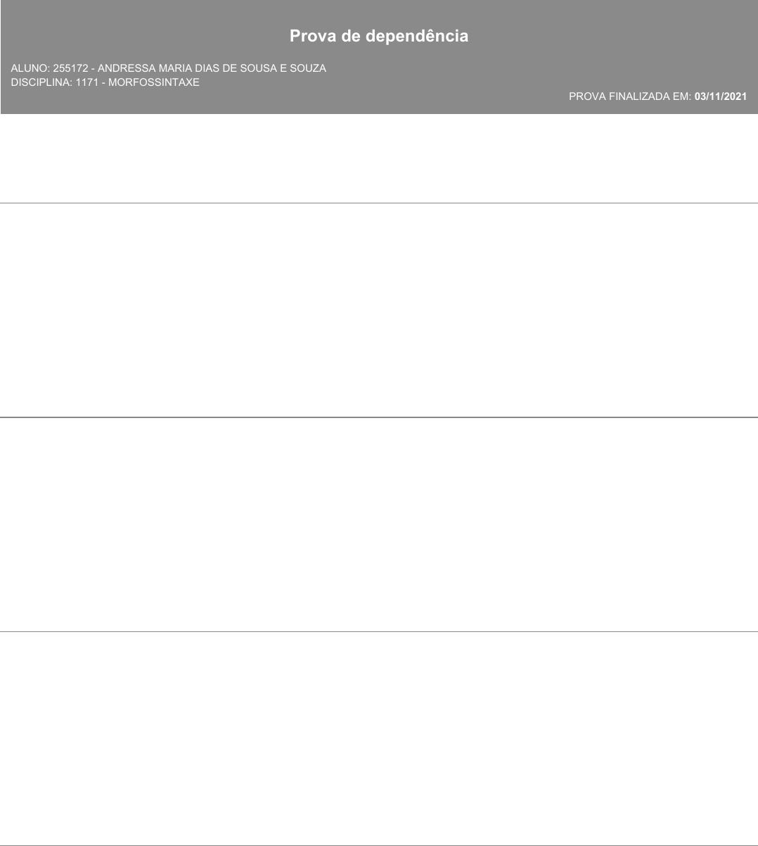 Prova de dependência ALUNO: 255172 - ANDRESSA MARIA DIAS DE SOUSA E SOUZA DISCIPLINA: 1171 - MORFOSSINTAXE PROVA FINALIZADA EM: 03/11/2021 Abaixo estão as questões e as alternativas escolhida pelo aluno: Questão 1 A função sintática do pronome relativo está corretamente identificada em a) "A mulher que eu amo não está aqui" (sujeito simples) b) "Não conheci a única mulher que amou meu pai". (objeto direto) c) "Infelizmente, nunca valorizei a mulher que ela era". (predicativo) d) "Senti um perfume de mulher que invadia meus sonhos" (adjunto adnominal) Questão 2 Assinale a opção em que o pronome oblíquo átono está empregado com valor de reciprocidade. a) Talvez nós nos amássemos mais na época em que éramos pobres. b) Os jogadores fizeram uma confraternização após a partida. c) Havia duas cunhadas que não gostavam de nos visitar. d) Silvana e Ernesto se esconderam atrás daquela árvore velha. Questão 3 Assinale a afirmação correta sobre as frases "no Brasil não há saúvas" e "no Brasil não tem saúvas" a) Alternam variantes sintático-semânticas de concordância verbal. b) Mostram duas possibilidades prestigiadas na linguagem formal. c) Topicalizam o adjunto adverbial deslocando o sujeito para o fim da frase. d) Exemplificam a dicotomia língua padrão X língua popular. Questão 4 A conjunção "e" pode ser empregada com variados valores, entre os quais a sucessividade. Nesse caso, a inversão das duas orações ligadas pela conjunção se transforma em algo incoerente, como acontece em a) "Entrei em casa e fechei a porta com a chave" b) "Abri a janela da sala e acendi a luz do abajur" c) "Estava frio e a chuva se aproximava de nós" d) "Alguém assoviou alto e o público aplaudiu" Stamp Questão 5 ,Caso o redator optasse por reescrever o período acima na ordem inversa, seria necessário empregar vírgulas. Nessa hipótese, uma das reescrituras possíveis seria a) "Depois que viram, nas imagens da televisão, a liberação dos artistas estrangeiros convidados para o espetáculo, muitos dos responsáveis pela organização do evento ficaram aliviados" b) "Depois que viram nas imagens da televisão a liberação dos artistas estrangeiros convidados para o espetáculo, muitos dos responsáveis pela organização do evento, ficaram aliviados" c) "Muitos dos responsáveis, depois que viram nas imagens da televisão a liberação dos artistas estrangeiros convidados para o espetáculo ficaram aliviados pela organização do evento" d) "Muitos dos responsáveis pela organização do evento, depois que viram nas imagens da televisão, a liberação dos artistas estrangeiros convidados para o espetáculo, ficaram aliviados" Questão 6 É um solecismo bastante comum empregar a preposição "de" em estruturas subordinadas sem preposição, o que caracteriza erro de regência, como acontece na frase a) "Os acusados têm receio de que seus nomes entrem para a história como corruptos" b) "Daremos início de inauguração desta obra de que tanto nos orgulhamos" c) "Felizmente, sabemos de que secretaria poderemos colher o apoio para essa campanha" d) "Eu gostaria de informar a todos de que hoje é um dia de festa para o nosso Município" Questão 7 O poeta Thiago de Mello, no poema "Os Estatutos do Homem", escreve no Artigo IA relação de dependência sintática da segunda oração com a primeira deve ser classificada como um caso de oração subordinada substantiva a) objetiva direta. b) subjetiva. c) completiva nominal. d) predicativa. Questão 8 Na frase publicada por um jornal carioca, os termos "criadas" e "de bichos" desempenham, respectivamente, as funções de a) predicativo do sujeito e complemento nominal. b) adjunto adnominal e complemento nominal. c) predicativo do sujeito e adjunto adnominal. d) adjunto adnominal e adjunto adnominal. Questão 9 Na frase de Machado de Assis "Dizem que os cariocas somos pouco dados aos jardins públicos", o verbo "ser" está na 1.a pessoa do plural porque há um caso de a) concordância lógica. b) concordância afetiva. c) concordância ideológica. d) concordância atrativa. Questão 10 A construção coerente de períodos e orações, observadas as relações existentes entre seus termos e a sua organização, é o que caracteriza a a) adequação semântica. b) adequação sintática. c) sintaxe de regência. d) sintaxe de concordância. * - Questão anulada.