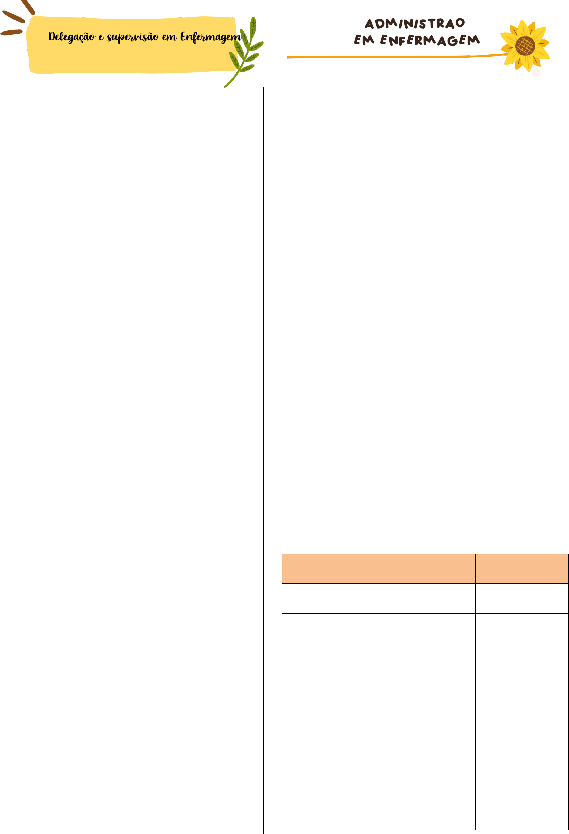 Delegação ____________________________ - Atribuição a um subordinado da responsabilidade de planejar, decidir ou executar uma tarefa. - Não pode delegar ao tec.de enfermagem a responsabilidade de planejar ou decidir as ações de cuidado, somente a função de execução, no caso seja de sua competência. - Boa delegação na administração: • Demanda a escolha de uma pessoa qualificada para assumir as novas atribuições. • Essa pessoa deve estar plenamente de acordo com o aumento de suas responsabilidades. • Deve existir comunicação eficaz entre o líder e a pessoa que recebeu a nova atribuição. • O líder precisa ter certeza de que a tarefa atribuída tem condições de ser executada e deve acompanhar seu andamento de perto, sobretudo na faze inicial da transferência. - Boa delegação da enfermagem: • Avaliação da competência técnica. • Avaliação da competência legal. • Importância Enfermeiros só podem delegar taredas a pessoa dele funcionamente dependente e quando estiver capacidade técnica e legal para executàlas, conjugando-se sempre a natureza das tarefas com grau de dependência do paciente aos cuidados de enfermagem. - ✖ Proibições: art. 80 delegar suas atividades privativas a outro membro da equipe de enfermagem ou de saúde, que não seja enfermeiro. - Lei n° 7498/1986 “ A enfermagem e suas atividades auxiliares somente podem ser exercida por pessoas legalmente habilitadas e inscritas no Coren com jurisdição na área onde ocorre o exercício” Responsabilidade compartilhada. - 5 certos da delegação em enfermagem: • Tarefa certa: uma que possa ser delegada. • Circunstância certa: cenários e recursos adequados e disponíveis. • Pessoa certa: a tarefa está sendo delegada por uma pessoa com competência para isso, está sendo delegada para uma pessoa tecnicamente e legalmente capacitada, será realizada na pessoa correta. • Orientação/comunicação certa: descrição clara e concisa da tarefa. • Supervisão certa: monitoração, avaliação e feedback apropriados. Conceitos de supervisão ______________ Os conceitos de supervisão são influenciados pela evolução das sociedades no contexto sociopolítico, incluindo: globalização, ampliação de horizontes de trabalho. - Dicionário: 1. ato ou efeito de supervisionar. 2. atribuição ou função de supervisor. 3. visão superior. - Tradicional: 1. enfatiza o controle no aspecto da fiscalização do trabalho, punição e registro de falhas. 2. Planeja todo o trabalho, toma as decisões e dá ordens aos profissionais que têm de obedecê-las sem hesitar. 3. Gestão vertical. 4. Efeito: inibição da iniciativa e da produtividade. - Contemporânea: 1. Abrange estratégias de motivação, de desenvolvimento de pessoal e educação. 2. Se configura como medida educativa. 3. Democrática (descentralização administrativa). 4. Gestão compartilhada: todos os grupos têm o poder de opinar. 5. Efeito: orientação contínua das pessoas com a finalidade de desenvolvê-las e capacitá-las para a realização do trabalho. 6. Criação de equipes semiautônomas 7. Participação e ênfase no trabalho em equipe. 8. Adoção de métodos e estratégias que permitam a compreensão dos processos e contextos administrativos. Contextualização Histórica ____________ Modelo Taylorista Modelo Fordistas Modelo burocrático Frederick Winslow Taylor Henry Ford em 1908. Max Weber Divisão do trabalho em tarefas específicas. Manteve-se o mecanismo de produção e a organização da gerência utilizada do sistema Taylorista. Postura altamente técnica e mecanicista. Aumento da produtividade. Divisão do trabalho em pequenas tarefas. Preocupação apenas com a estrutura e seu conjunto de cargos e funções. Grande nível de subordinação. O comportamento pessoal das pessoas é levado em consideração. Conceitos de supervisão da área da saúde _______________________________ - Ministério da Saúde 1983: processo educativo e contínuo que consiste, principalmente, em motivar e orientar os supervisionados, na execução de atividades com base em normas, a fim de manter elevada a qualidade dos serviços prestados. - COFEN- 2018: instrumento que qualifica a enfermagem por meio do estímulo de cada profissional aperfeiçoado os cuidados prestados aos indivíduos e não apenas como uma inspeção ou até mesmo na vigilância, como muitos profissionais acreditam ser. - Objetivos da supervisão na área da saúde: • Estimular o desejo de auto aperfeiçoamento em cada sujeito. • Orientar, treinar e guiar os indivíduos. • Desenvolver a cooperação enfatizando o “nós” em detrimento do “eu”. • Proporcionar, sempre que possível, condições adequadas para o desenvolvimento do trabalho. • Manter a educação permanente dos trabalhadores de saúde através da constante avaliação do serviço realizado por estes. - Métodos para realizar supervisão na área da saúde: • Científico: observar a equipe no desenvolvimento de suas funções e com base nas dificuldades são realizadas atividades individuais. • Indireto: oferece estímulo e amplas oportunidades para os participantes no processo ensino-aprendizagem. • Investigação ativa: estudo em grupo e individualmente de um ou vários problemas a pedido da equipe sem interromper as atividades diárias. • Múltiplas faces ou misto: aplicação de vários métodos de supervisão. Respaldo Legal_______________________ Decreto de lei 94.406/87 que regulamente a lei 7.498/86 - Lei 7498/86: é função privativa do enfermeiro, o planejamento, organização, coordenação, execução e avaliação dos serviços de assistência de enfermagem. - Artigo 13: estabelece que as atividades referidas nos artigos 10 e 11, relacionadas ao técnico de enfermagem e ao auxiliar de enfermagem e ao auxiliar de enfermagem somente poderão ser desenvolvidas sob supervisão do enfermeiro. - Resolução COFEN n° 564/2017: artigo 54 institui como 