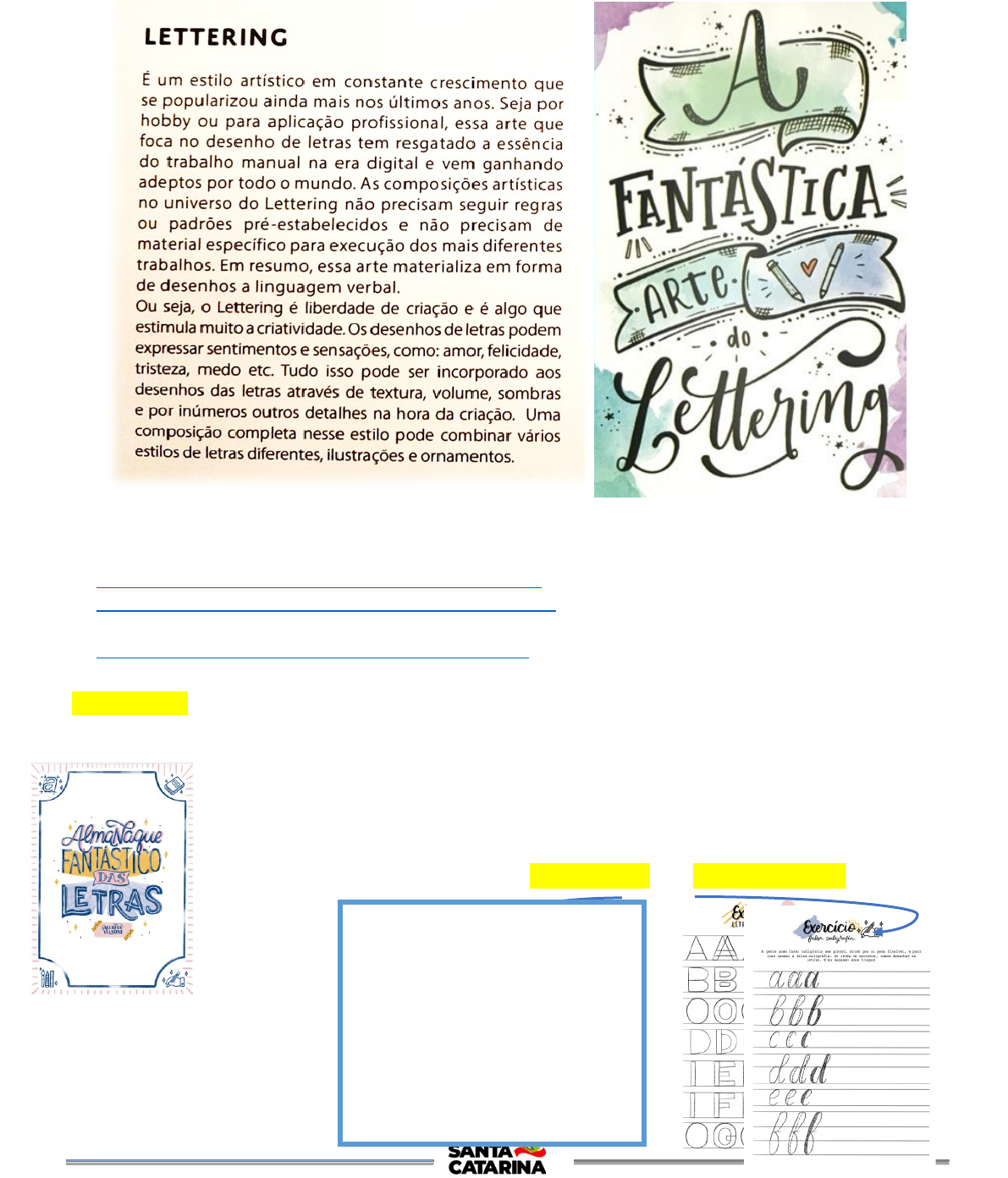 Vimos na aula anterior a evolução da forma TIPOGRAFIA, hoje vamos conhecer uma das técnicas artísticas mais utilizada atualmente tanto na aréa profissional como um hobby! Para aprofundarmos mais a técnica a professora montou uma lista dos links que vocês deverão acessar para melhor entendimento do assunto ok? Bora lá ??? · https://www.youtube.com/watch?v=5oXiAXef_QU COMO CRIAR UM LETTERING · https://www.youtube.com/watch?v=msHZR0XBfhMCOMO FAZER LETTERING SEM BRUSH · https://www.youtube.com/watch?v=3iz3uut6Rog COMO ESCREVER EM FAIXAS ATIVIDADE: Após visualizar os 3 vídeos vamos fazer dois exercícios! Em anexo a professora disponibilizou o Almanaque Fantástico das Letras da autora Marina Viabone · Para esta atividade você vai precisar de folha sulfite, lápis de escrever, caneta ou canetinha. · Você irá copiar os dois exercícios que a autora propõe fazer para aprender a “ Desenhar” as letras! · O exercício de letras BLOCADAS e a Falsa Caligrafia Professora posso imprimir as duas listas de exercícios da autora e completar meu exercício na folha impressa??? SIM Claro que pode! Mas se não tiver como imprimir você apenas copie olhando o almanaque ok? OBS: Envie a foto dos seus exercícios completos no classroom.