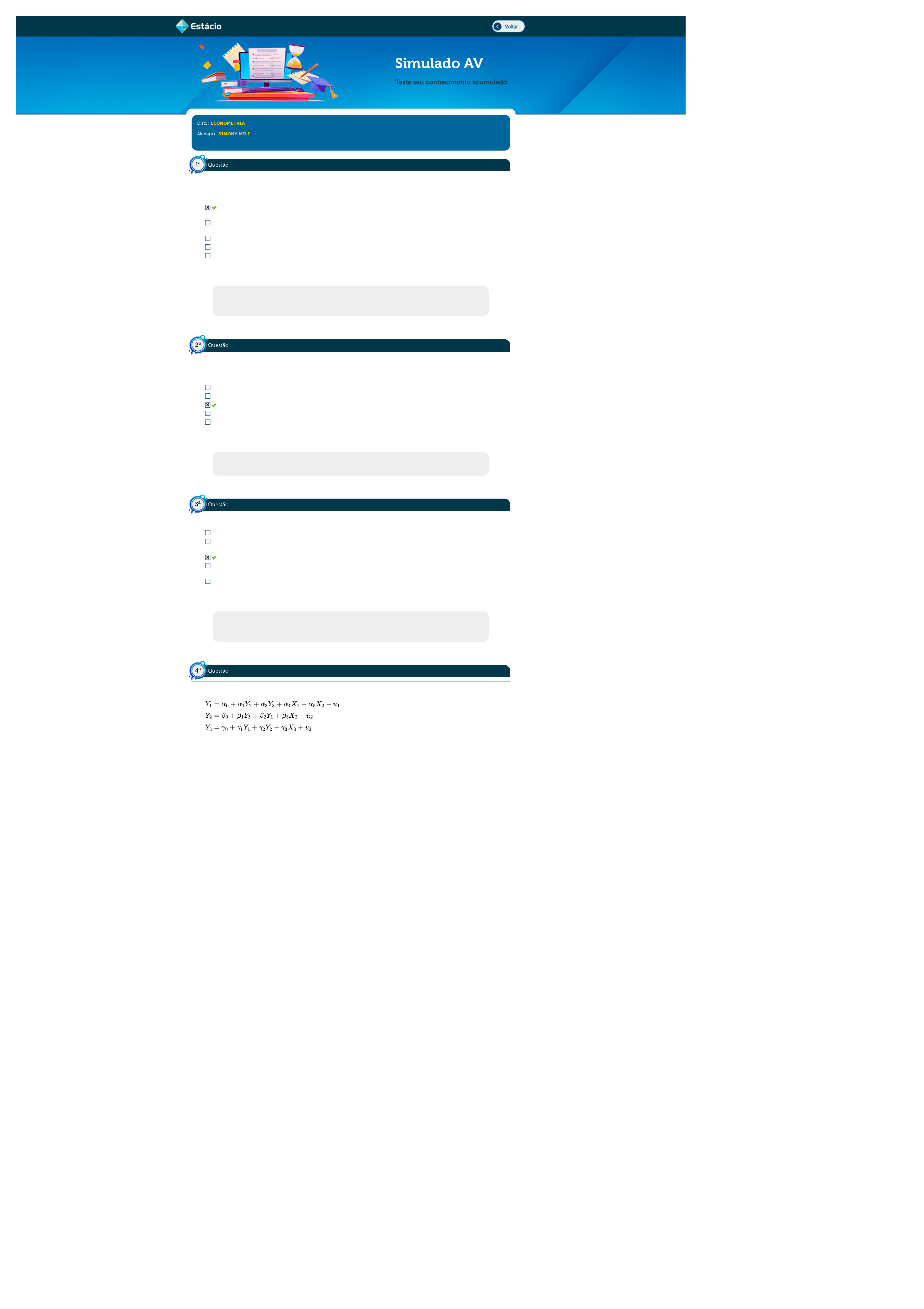 03/11/2021 20:25 Estácio: Alunos https://simulado.estacio.br/alunos/?p0=55849662&user_cod=2232250&matr_integracao=201901091325 1/1 Simulado AV Teste seu conhecimento acumulado Disc.: ECONOMETRIA Aluno(a): SIMONY MILIONE HELENO 201901091325 Acertos: 10,0 de 10,0 03/11/2021 Acerto: 1,0 / 1,0 João tem um trabalho de econometria no R para entregar, mas está tendo dificuldade em conseguir executar uma parte de seu script, pois encontra um erro para o qual não consegue identificar a solução. Considere as alternativas a seguir e assinale a correta. João deve primeiro se certificar que os comandos utilizados estão escritos de forma correta, acessando a documentação através dos comandos help(). Mesmo que tenha um problema exatamente como o do João no fórum, ele deve postá- lo novamente. A primeira solução de João deve ser procurar o problema na internet. João precisa pedir ajuda a um colega de turma antes de tentar qualquer outro passo. João deve ir direto a fóruns postar o problema para obter ajuda. Respondido em 03/11/2021 20:09:08 Explicação: A resposta correta é: João deve primeiro se certificar que os comandos utilizados estão escritos de forma correta, acessando a documentação através dos comandos help(). Acerto: 1,0 / 1,0 Assinale a alternativa que corresponde a uma regressão da variável dependente "taxa de agressões" (Assault) na variável independente "população urbana" (UrbanPop) da base 'dados', usada no módulo 4. regress(UrbanPop ~ Assault, data = dados) lm(y = Assault, x = UrbanPop, data = dados) lm(Assault ~ UrbanPop, data = dados) lm(Assault ~ UrbanPop) lm(UrbanPop ~ Assault, data = dados) Respondido em 03/11/2021 20:12:10 Explicação: A resposta correta é: lm(Assault ~ UrbanPop, data = dados) Acerto: 1,0 / 1,0 Sobre classes de objetos, considere as alternativas abaixo e assinale a incorreta. Vetores são estruturas de dados básicas no R, que contêm elementos do mesmo tipo. Classe é um atributo dos objetos do R, que determina a forma de armazenamento dos dados do objeto. Listas são estruturas de dados que comportam dados de somente de um tipo. Data frames são um caso especial de lista, em que cada componente da lista tem o mesmo comprimento. Matrizes são estruturas de dados similares a vetores, mas com duas dimensões. Respondido em 03/11/2021 20:09:19 Explicação: A resposta correta é: Listas são estruturas de dados que comportam dados de somente de um tipo. Acerto: 1,0 / 1,0 Considere o sistema de equações simultâneas a seguir, onde ocultamos os subscritos de tempo apenas para reduzir a notação. Y1 = α0 + α1Y2 + α3Y3 + α4X1 + α5X2 + u1 Y2 = β0 + β1Y3 + β2Y1 + β3X2 + u2 Y3 = γ0 + γ1Y1 + γ2Y2 + γ3X3 + u3 Questão1 a Questão2 a Questão3 a Questão4 a https://simulado.estacio.br/alunos/inicio.asp javascript:voltar();